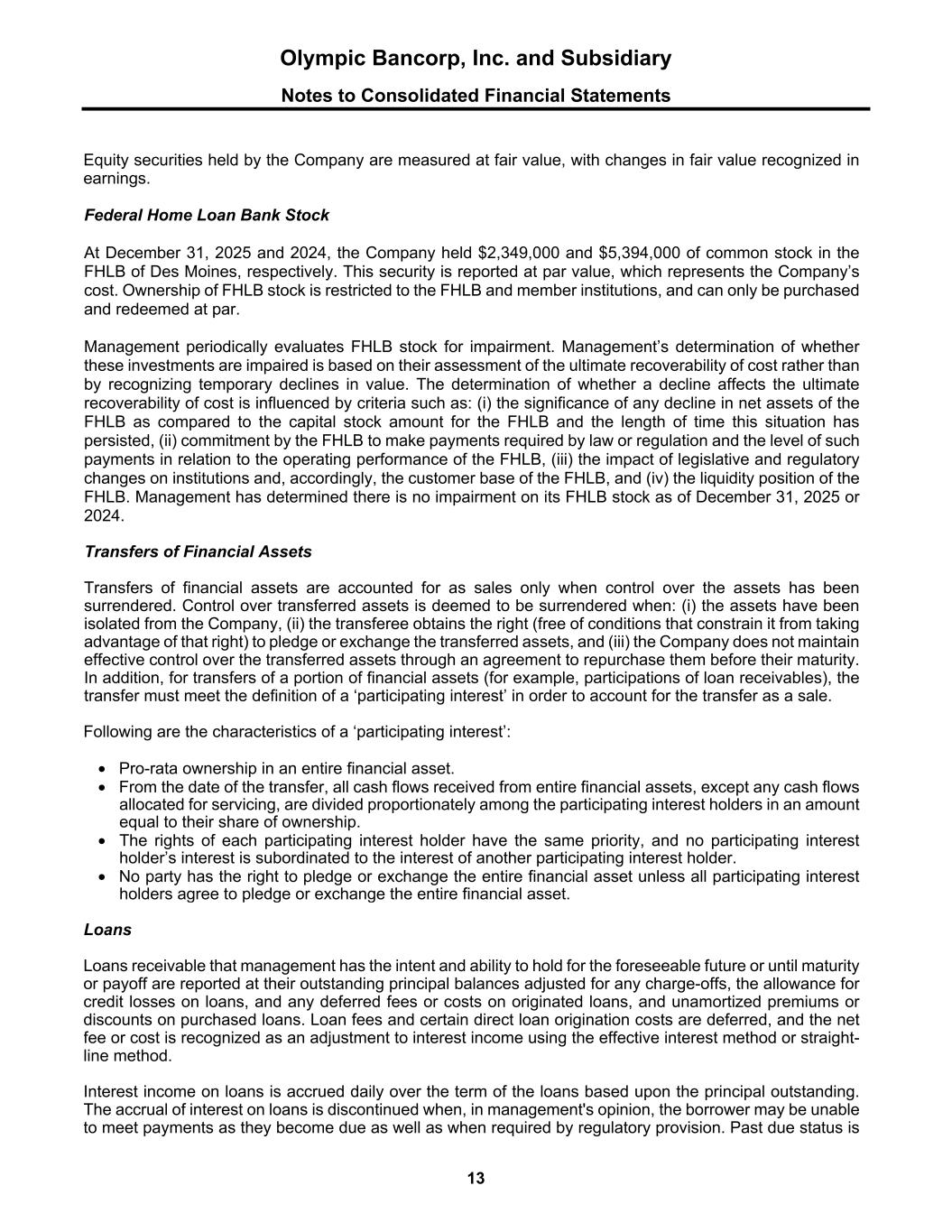 Olympic Bancorp, Inc. and Subsidiary Notes to Consolidated Financial Statements 13 Equity securities held by the Company are measured at fair value, with changes in fair value recognized in earnings. Federal Home Loan Bank Stock At December 31, 2025 and 2024, the Company held $2,349,000 and $5,394,000 of common stock in the FHLB of Des Moines, respectively. This security is reported at par value, which represents the Company’s cost. Ownership of FHLB stock is restricted to the FHLB and member institutions, and can only be purchased and redeemed at par. Management periodically evaluates FHLB stock for impairment. Management’s determination of whether these investments are impaired is based on their assessment of the ultimate recoverability of cost rather than by recognizing temporary declines in value. The determination of whether a decline affects the ultimate recoverability of cost is influenced by criteria such as: (i) the significance of any decline in net assets of the FHLB as compared to the capital stock amount for the FHLB and the length of time this situation has persisted, (ii) commitment by the FHLB to make payments required by law or regulation and the level of such payments in relation to the operating performance of the FHLB, (iii) the impact of legislative and regulatory changes on institutions and, accordingly, the customer base of the FHLB, and (iv) the liquidity position of the FHLB. Management has determined there is no impairment on its FHLB stock as of December 31, 2025 or 2024. Transfers of Financial Assets Transfers of financial assets are accounted for as sales only when control over the assets has been surrendered. Control over transferred assets is deemed to be surrendered when: (i) the assets have been isolated from the Company, (ii) the transferee obtains the right (free of conditions that constrain it from taking advantage of that right) to pledge or exchange the transferred assets, and (iii) the Company does not maintain effective control over the transferred assets through an agreement to repurchase them before their maturity. In addition, for transfers of a portion of financial assets (for example, participations of loan receivables), the transfer must meet the definition of a ‘participating interest’ in order to account for the transfer as a sale. Following are the characteristics of a ‘participating interest’: • Pro-rata ownership in an entire financial asset. • From the date of the transfer, all cash flows received from entire financial assets, except any cash flows allocated for servicing, are divided proportionately among the participating interest holders in an amount equal to their share of ownership. • The rights of each participating interest holder have the same priority, and no participating interest holder’s interest is subordinated to the interest of another participating interest holder. • No party has the right to pledge or exchange the entire financial asset unless all participating interest holders agree to pledge or exchange the entire financial asset. Loans Loans receivable that management has the intent and ability to hold for the foreseeable future or until maturity or payoff are reported at their outstanding principal balances adjusted for any charge-offs, the allowance for credit losses on loans, and any deferred fees or costs on originated loans, and unamortized premiums or discounts on purchased loans. Loan fees and certain direct loan origination costs are deferred, and the net fee or cost is recognized as an adjustment to interest income using the effective interest method or straight- line method. Interest income on loans is accrued daily over the term of the loans based upon the principal outstanding. The accrual of interest on loans is discontinued when, in management's opinion, the borrower may be unable to meet payments as they become due as well as when required by regulatory provision. Past due status is