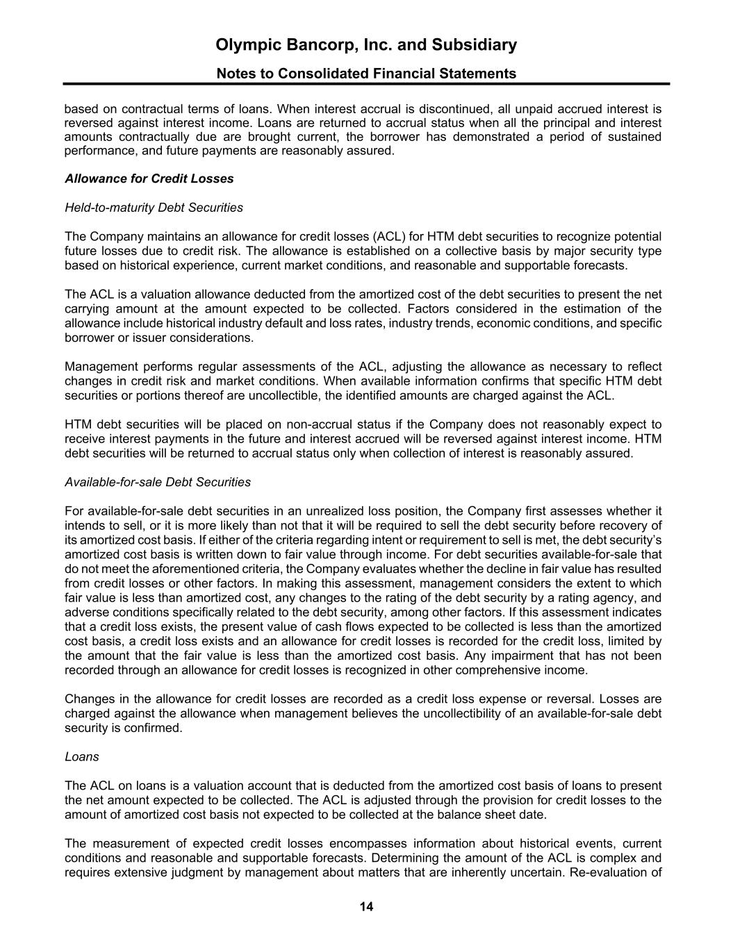 Olympic Bancorp, Inc. and Subsidiary Notes to Consolidated Financial Statements 14 based on contractual terms of loans. When interest accrual is discontinued, all unpaid accrued interest is reversed against interest income. Loans are returned to accrual status when all the principal and interest amounts contractually due are brought current, the borrower has demonstrated a period of sustained performance, and future payments are reasonably assured. Allowance for Credit Losses Held-to-maturity Debt Securities The Company maintains an allowance for credit losses (ACL) for HTM debt securities to recognize potential future losses due to credit risk. The allowance is established on a collective basis by major security type based on historical experience, current market conditions, and reasonable and supportable forecasts. The ACL is a valuation allowance deducted from the amortized cost of the debt securities to present the net carrying amount at the amount expected to be collected. Factors considered in the estimation of the allowance include historical industry default and loss rates, industry trends, economic conditions, and specific borrower or issuer considerations. Management performs regular assessments of the ACL, adjusting the allowance as necessary to reflect changes in credit risk and market conditions. When available information confirms that specific HTM debt securities or portions thereof are uncollectible, the identified amounts are charged against the ACL. HTM debt securities will be placed on non-accrual status if the Company does not reasonably expect to receive interest payments in the future and interest accrued will be reversed against interest income. HTM debt securities will be returned to accrual status only when collection of interest is reasonably assured. Available-for-sale Debt Securities For available-for-sale debt securities in an unrealized loss position, the Company first assesses whether it intends to sell, or it is more likely than not that it will be required to sell the debt security before recovery of its amortized cost basis. If either of the criteria regarding intent or requirement to sell is met, the debt security’s amortized cost basis is written down to fair value through income. For debt securities available-for-sale that do not meet the aforementioned criteria, the Company evaluates whether the decline in fair value has resulted from credit losses or other factors. In making this assessment, management considers the extent to which fair value is less than amortized cost, any changes to the rating of the debt security by a rating agency, and adverse conditions specifically related to the debt security, among other factors. If this assessment indicates that a credit loss exists, the present value of cash flows expected to be collected is less than the amortized cost basis, a credit loss exists and an allowance for credit losses is recorded for the credit loss, limited by the amount that the fair value is less than the amortized cost basis. Any impairment that has not been recorded through an allowance for credit losses is recognized in other comprehensive income. Changes in the allowance for credit losses are recorded as a credit loss expense or reversal. Losses are charged against the allowance when management believes the uncollectibility of an available-for-sale debt security is confirmed. Loans The ACL on loans is a valuation account that is deducted from the amortized cost basis of loans to present the net amount expected to be collected. The ACL is adjusted through the provision for credit losses to the amount of amortized cost basis not expected to be collected at the balance sheet date. The measurement of expected credit losses encompasses information about historical events, current conditions and reasonable and supportable forecasts. Determining the amount of the ACL is complex and requires extensive judgment by management about matters that are inherently uncertain. Re-evaluation of
