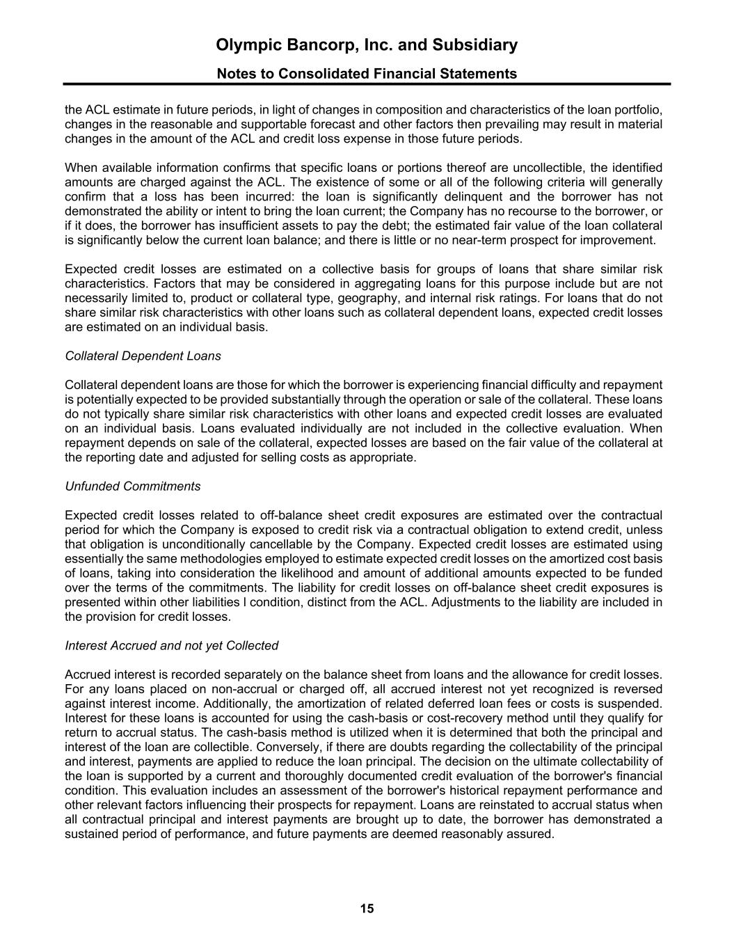 Olympic Bancorp, Inc. and Subsidiary Notes to Consolidated Financial Statements 15 the ACL estimate in future periods, in light of changes in composition and characteristics of the loan portfolio, changes in the reasonable and supportable forecast and other factors then prevailing may result in material changes in the amount of the ACL and credit loss expense in those future periods. When available information confirms that specific loans or portions thereof are uncollectible, the identified amounts are charged against the ACL. The existence of some or all of the following criteria will generally confirm that a loss has been incurred: the loan is significantly delinquent and the borrower has not demonstrated the ability or intent to bring the loan current; the Company has no recourse to the borrower, or if it does, the borrower has insufficient assets to pay the debt; the estimated fair value of the loan collateral is significantly below the current loan balance; and there is little or no near-term prospect for improvement. Expected credit losses are estimated on a collective basis for groups of loans that share similar risk characteristics. Factors that may be considered in aggregating loans for this purpose include but are not necessarily limited to, product or collateral type, geography, and internal risk ratings. For loans that do not share similar risk characteristics with other loans such as collateral dependent loans, expected credit losses are estimated on an individual basis. Collateral Dependent Loans Collateral dependent loans are those for which the borrower is experiencing financial difficulty and repayment is potentially expected to be provided substantially through the operation or sale of the collateral. These loans do not typically share similar risk characteristics with other loans and expected credit losses are evaluated on an individual basis. Loans evaluated individually are not included in the collective evaluation. When repayment depends on sale of the collateral, expected losses are based on the fair value of the collateral at the reporting date and adjusted for selling costs as appropriate. Unfunded Commitments Expected credit losses related to off-balance sheet credit exposures are estimated over the contractual period for which the Company is exposed to credit risk via a contractual obligation to extend credit, unless that obligation is unconditionally cancellable by the Company. Expected credit losses are estimated using essentially the same methodologies employed to estimate expected credit losses on the amortized cost basis of loans, taking into consideration the likelihood and amount of additional amounts expected to be funded over the terms of the commitments. The liability for credit losses on off-balance sheet credit exposures is presented within other liabilities l condition, distinct from the ACL. Adjustments to the liability are included in the provision for credit losses. Interest Accrued and not yet Collected Accrued interest is recorded separately on the balance sheet from loans and the allowance for credit losses. For any loans placed on non-accrual or charged off, all accrued interest not yet recognized is reversed against interest income. Additionally, the amortization of related deferred loan fees or costs is suspended. Interest for these loans is accounted for using the cash-basis or cost-recovery method until they qualify for return to accrual status. The cash-basis method is utilized when it is determined that both the principal and interest of the loan are collectible. Conversely, if there are doubts regarding the collectability of the principal and interest, payments are applied to reduce the loan principal. The decision on the ultimate collectability of the loan is supported by a current and thoroughly documented credit evaluation of the borrower's financial condition. This evaluation includes an assessment of the borrower's historical repayment performance and other relevant factors influencing their prospects for repayment. Loans are reinstated to accrual status when all contractual principal and interest payments are brought up to date, the borrower has demonstrated a sustained period of performance, and future payments are deemed reasonably assured.