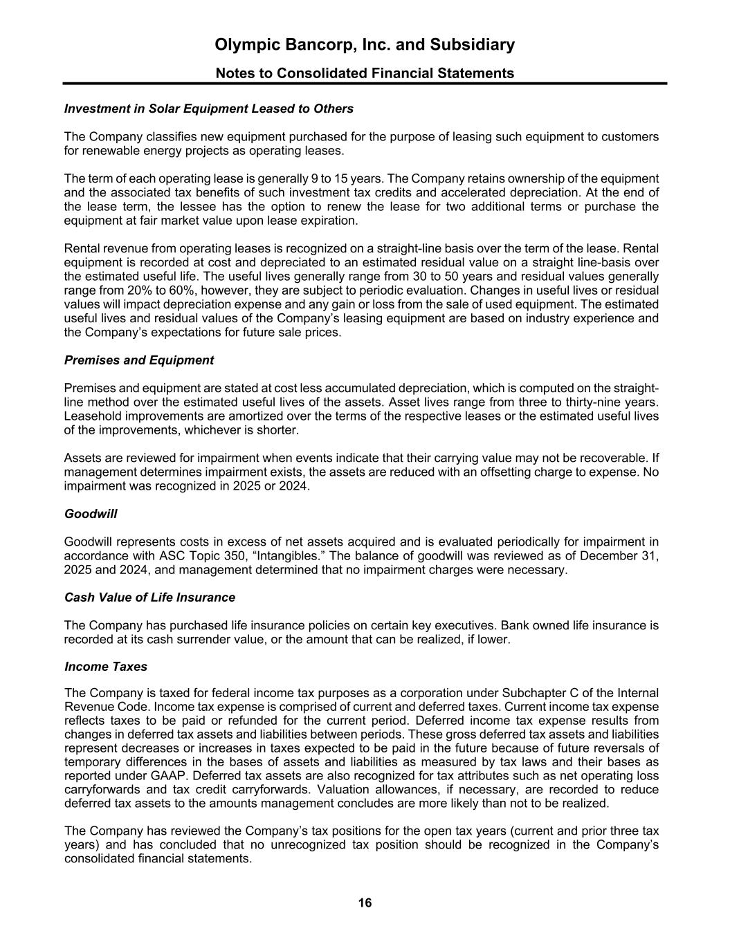 Olympic Bancorp, Inc. and Subsidiary Notes to Consolidated Financial Statements 16 Investment in Solar Equipment Leased to Others The Company classifies new equipment purchased for the purpose of leasing such equipment to customers for renewable energy projects as operating leases. The term of each operating lease is generally 9 to 15 years. The Company retains ownership of the equipment and the associated tax benefits of such investment tax credits and accelerated depreciation. At the end of the lease term, the lessee has the option to renew the lease for two additional terms or purchase the equipment at fair market value upon lease expiration. Rental revenue from operating leases is recognized on a straight-line basis over the term of the lease. Rental equipment is recorded at cost and depreciated to an estimated residual value on a straight line-basis over the estimated useful life. The useful lives generally range from 30 to 50 years and residual values generally range from 20% to 60%, however, they are subject to periodic evaluation. Changes in useful lives or residual values will impact depreciation expense and any gain or loss from the sale of used equipment. The estimated useful lives and residual values of the Company’s leasing equipment are based on industry experience and the Company’s expectations for future sale prices. Premises and Equipment Premises and equipment are stated at cost less accumulated depreciation, which is computed on the straight- line method over the estimated useful lives of the assets. Asset lives range from three to thirty-nine years. Leasehold improvements are amortized over the terms of the respective leases or the estimated useful lives of the improvements, whichever is shorter. Assets are reviewed for impairment when events indicate that their carrying value may not be recoverable. If management determines impairment exists, the assets are reduced with an offsetting charge to expense. No impairment was recognized in 2025 or 2024. Goodwill Goodwill represents costs in excess of net assets acquired and is evaluated periodically for impairment in accordance with ASC Topic 350, “Intangibles.” The balance of goodwill was reviewed as of December 31, 2025 and 2024, and management determined that no impairment charges were necessary. Cash Value of Life Insurance The Company has purchased life insurance policies on certain key executives. Bank owned life insurance is recorded at its cash surrender value, or the amount that can be realized, if lower. Income Taxes The Company is taxed for federal income tax purposes as a corporation under Subchapter C of the Internal Revenue Code. Income tax expense is comprised of current and deferred taxes. Current income tax expense reflects taxes to be paid or refunded for the current period. Deferred income tax expense results from changes in deferred tax assets and liabilities between periods. These gross deferred tax assets and liabilities represent decreases or increases in taxes expected to be paid in the future because of future reversals of temporary differences in the bases of assets and liabilities as measured by tax laws and their bases as reported under GAAP. Deferred tax assets are also recognized for tax attributes such as net operating loss carryforwards and tax credit carryforwards. Valuation allowances, if necessary, are recorded to reduce deferred tax assets to the amounts management concludes are more likely than not to be realized. The Company has reviewed the Company’s tax positions for the open tax years (current and prior three tax years) and has concluded that no unrecognized tax position should be recognized in the Company’s consolidated financial statements.