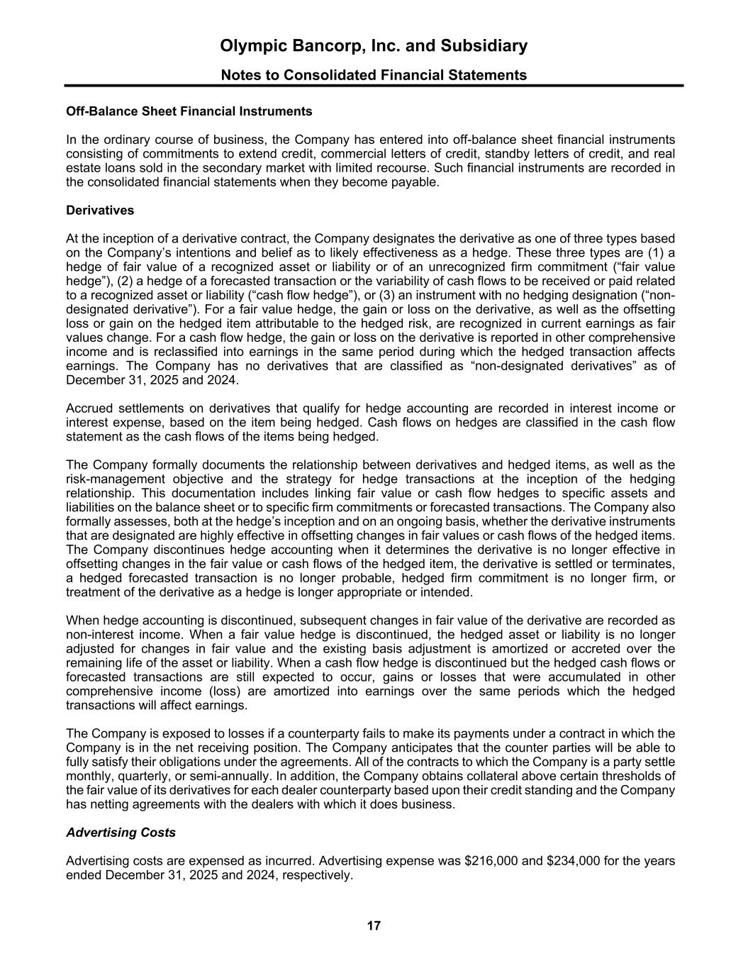 Olympic Bancorp, Inc. and Subsidiary Notes to Consolidated Financial Statements 17 Off-Balance Sheet Financial Instruments In the ordinary course of business, the Company has entered into off-balance sheet financial instruments consisting of commitments to extend credit, commercial letters of credit, standby letters of credit, and real estate loans sold in the secondary market with limited recourse. Such financial instruments are recorded in the consolidated financial statements when they become payable. Derivatives At the inception of a derivative contract, the Company designates the derivative as one of three types based on the Company’s intentions and belief as to likely effectiveness as a hedge. These three types are (1) a hedge of fair value of a recognized asset or liability or of an unrecognized firm commitment (“fair value hedge”), (2) a hedge of a forecasted transaction or the variability of cash flows to be received or paid related to a recognized asset or liability (“cash flow hedge”), or (3) an instrument with no hedging designation (“non- designated derivative”). For a fair value hedge, the gain or loss on the derivative, as well as the offsetting loss or gain on the hedged item attributable to the hedged risk, are recognized in current earnings as fair values change. For a cash flow hedge, the gain or loss on the derivative is reported in other comprehensive income and is reclassified into earnings in the same period during which the hedged transaction affects earnings. The Company has no derivatives that are classified as “non-designated derivatives” as of December 31, 2025 and 2024. Accrued settlements on derivatives that qualify for hedge accounting are recorded in interest income or interest expense, based on the item being hedged. Cash flows on hedges are classified in the cash flow statement as the cash flows of the items being hedged. The Company formally documents the relationship between derivatives and hedged items, as well as the risk-management objective and the strategy for hedge transactions at the inception of the hedging relationship. This documentation includes linking fair value or cash flow hedges to specific assets and liabilities on the balance sheet or to specific firm commitments or forecasted transactions. The Company also formally assesses, both at the hedge’s inception and on an ongoing basis, whether the derivative instruments that are designated are highly effective in offsetting changes in fair values or cash flows of the hedged items. The Company discontinues hedge accounting when it determines the derivative is no longer effective in offsetting changes in the fair value or cash flows of the hedged item, the derivative is settled or terminates, a hedged forecasted transaction is no longer probable, hedged firm commitment is no longer firm, or treatment of the derivative as a hedge is longer appropriate or intended. When hedge accounting is discontinued, subsequent changes in fair value of the derivative are recorded as non-interest income. When a fair value hedge is discontinued, the hedged asset or liability is no longer adjusted for changes in fair value and the existing basis adjustment is amortized or accreted over the remaining life of the asset or liability. When a cash flow hedge is discontinued but the hedged cash flows or forecasted transactions are still expected to occur, gains or losses that were accumulated in other comprehensive income (loss) are amortized into earnings over the same periods which the hedged transactions will affect earnings. The Company is exposed to losses if a counterparty fails to make its payments under a contract in which the Company is in the net receiving position. The Company anticipates that the counter parties will be able to fully satisfy their obligations under the agreements. All of the contracts to which the Company is a party settle monthly, quarterly, or semi-annually. In addition, the Company obtains collateral above certain thresholds of the fair value of its derivatives for each dealer counterparty based upon their credit standing and the Company has netting agreements with the dealers with which it does business. Advertising Costs Advertising costs are expensed as incurred. Advertising expense was $216,000 and $234,000 for the years ended December 31, 2025 and 2024, respectively.