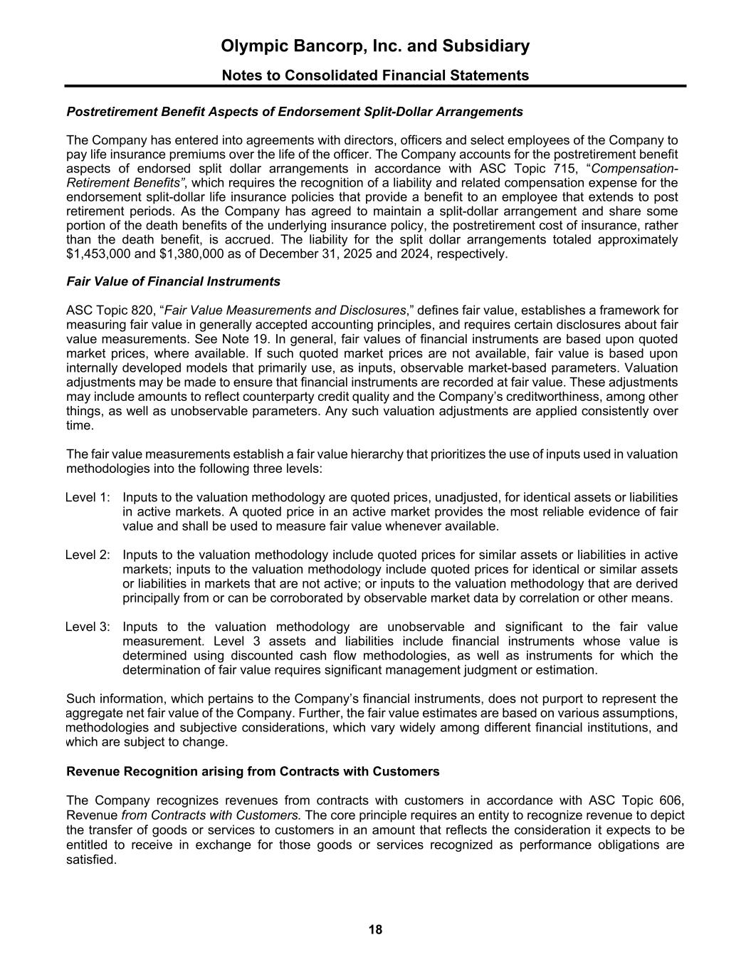 Olympic Bancorp, Inc. and Subsidiary Notes to Consolidated Financial Statements 18 Postretirement Benefit Aspects of Endorsement Split-Dollar Arrangements The Company has entered into agreements with directors, officers and select employees of the Company to pay life insurance premiums over the life of the officer. The Company accounts for the postretirement benefit aspects of endorsed split dollar arrangements in accordance with ASC Topic 715, “Compensation- Retirement Benefits”, which requires the recognition of a liability and related compensation expense for the endorsement split-dollar life insurance policies that provide a benefit to an employee that extends to post retirement periods. As the Company has agreed to maintain a split-dollar arrangement and share some portion of the death benefits of the underlying insurance policy, the postretirement cost of insurance, rather than the death benefit, is accrued. The liability for the split dollar arrangements totaled approximately $1,453,000 and $1,380,000 as of December 31, 2025 and 2024, respectively. Fair Value of Financial Instruments ASC Topic 820, “Fair Value Measurements and Disclosures,” defines fair value, establishes a framework for measuring fair value in generally accepted accounting principles, and requires certain disclosures about fair value measurements. See Note 19. In general, fair values of financial instruments are based upon quoted market prices, where available. If such quoted market prices are not available, fair value is based upon internally developed models that primarily use, as inputs, observable market-based parameters. Valuation adjustments may be made to ensure that financial instruments are recorded at fair value. These adjustments may include amounts to reflect counterparty credit quality and the Company’s creditworthiness, among other things, as well as unobservable parameters. Any such valuation adjustments are applied consistently over time. The fair value measurements establish a fair value hierarchy that prioritizes the use of inputs used in valuation methodologies into the following three levels: Level 1: Inputs to the valuation methodology are quoted prices, unadjusted, for identical assets or liabilities in active markets. A quoted price in an active market provides the most reliable evidence of fair value and shall be used to measure fair value whenever available. Level 2: Inputs to the valuation methodology include quoted prices for similar assets or liabilities in active markets; inputs to the valuation methodology include quoted prices for identical or similar assets or liabilities in markets that are not active; or inputs to the valuation methodology that are derived principally from or can be corroborated by observable market data by correlation or other means. Level 3: Inputs to the valuation methodology are unobservable and significant to the fair value measurement. Level 3 assets and liabilities include financial instruments whose value is determined using discounted cash flow methodologies, as well as instruments for which the determination of fair value requires significant management judgment or estimation. Such information, which pertains to the Company’s financial instruments, does not purport to represent the aggregate net fair value of the Company. Further, the fair value estimates are based on various assumptions, methodologies and subjective considerations, which vary widely among different financial institutions, and which are subject to change. Revenue Recognition arising from Contracts with Customers The Company recognizes revenues from contracts with customers in accordance with ASC Topic 606, Revenue from Contracts with Customers. The core principle requires an entity to recognize revenue to depict the transfer of goods or services to customers in an amount that reflects the consideration it expects to be entitled to receive in exchange for those goods or services recognized as performance obligations are satisfied.