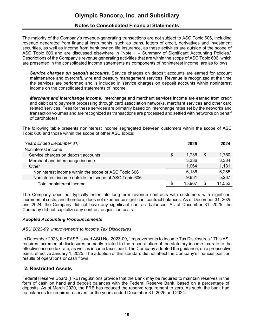 Olympic Bancorp, Inc. and Subsidiary Notes to Consolidated Financial Statements 19 The majority of the Company’s revenue-generating transactions are not subject to ASC Topic 606, including revenue generated from financial instruments, such as loans, letters of credit, derivatives and investment securities, as well as income from bank owned life insurance, as these activities are outside of the scope of ASC Topic 606 and are discussed elsewhere in “Note 1 – Summary of Significant Accounting Policies.” Descriptions of the Company’s revenue generating activities that are within the scope of ASC Topic 606, which are presented in the consolidated income statements as components of noninterest income, are as follows: Service charges on deposit accounts. Service charges on deposit accounts are earned for account maintenance and overdraft, wire and treasury management services. Revenue is recognized at the time the services are performed and is included in service charges on deposit accounts within noninterest income on the consolidated statements of income. Merchant and Interchange Income. Interchange and merchant services income are earned from credit and debit card payment processing through card association networks, merchant services and other card related services. Fees for these services are primarily based on interchange rates set by the networks and transaction volumes and are recognized as transactions are processed and settled with networks on behalf of cardholders. The following table presents noninterest income segregated between customers within the scope of ASC Topic 606 and those within the scope of other ASC topics: Years Ended December 31, 2025 2024 Noninterest income Service charges on deposit accounts $ 1,736 $ 1,750 Merchant and interchange income 3,336 3,384 Other 1,064 1,131 Noninterest income within the scope of ASC Topic 606 6,136 6,265 Noninterest income outside the scope of ASC Topic 606 9,831 5,287 Total noninterest income $ 15,967 $ 11,552 The Company does not typically enter into long-term revenue contracts with customers with significant incremental costs, and therefore, does not experience significant contract balances. As of December 31, 2025 and 2024, the Company did not have any significant contract balances. As of December 31, 2025, the Company did not capitalize any contract acquisition costs. Adopted Accounting Pronouncements ASU 2023-09, Improvements to Income Tax Disclosures In December 2023, the FASB issued ASU No. 2023-09, “Improvements to Income Tax Disclosures.” This ASU requires incremental disclosures primarily related to the reconciliation of the statutory income tax rate to the effective income tax rate, as well as income taxes paid. The Company adopted the guidance, on a propsective basis, effective January 1, 2025. The adoption of this standard did not affect the Company’s financial position, results of operations or cash flows. 2. Restricted Assets Federal Reserve Board (FRB) regulations provide that the Bank may be required to maintain reserves in the form of cash on hand and deposit balances with the Federal Reserve Bank, based on a percentage of deposits. As of March 2020, the FRB has reduced the reserve requirement to zero. As such, the bank had no balances for required reserves for the years ended December 31, 2025 and 2024.