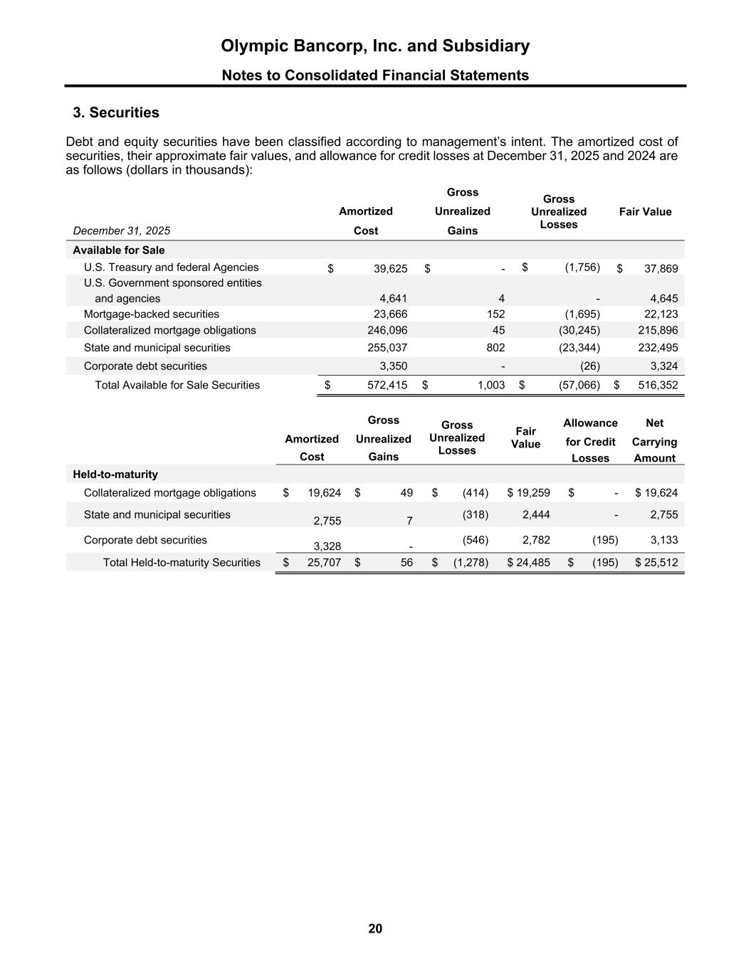 Olympic Bancorp, Inc. and Subsidiary Notes to Consolidated Financial Statements 20 3. Securities Debt and equity securities have been classified according to management’s intent. The amortized cost of securities, their approximate fair values, and allowance for credit losses at December 31, 2025 and 2024 are as follows (dollars in thousands): Gross Gross Unrealized Losses Fair Value Amortized Unrealized December 31, 2025 Cost Gains Available for Sale U.S. Treasury and federal Agencies $ 39,625 $ - $ (1,756) $ 37,869 U.S. Government sponsored entities and agencies 4,641 4 - 4,645 Mortgage-backed securities 23,666 152 (1,695) 22,123 Collateralized mortgage obligations 246,096 45 (30,245) 215,896 State and municipal securities 255,037 802 (23,344) 232,495 Corporate debt securities 3,350 - (26) 3,324 Total Available for Sale Securities $ 572,415 $ 1,003 $ (57,066) $ 516,352 Gross Gross Unrealized Losses Fair Value Allowance Net Amortized Unrealized for Credit Carrying Cost Gains Losses Amount Held-to-maturity Collateralized mortgage obligations $ 19,624 $ 49 $ (414) $ 19,259 $ - $ 19,624 State and municipal securities 2,755 7 (318) 2,444 - 2,755 Corporate debt securities 3,328 - (546) 2,782 (195) 3,133 Total Held-to-maturity Securities $ 25,707 $ 56 $ (1,278) $ 24,485 $ (195) $ 25,512