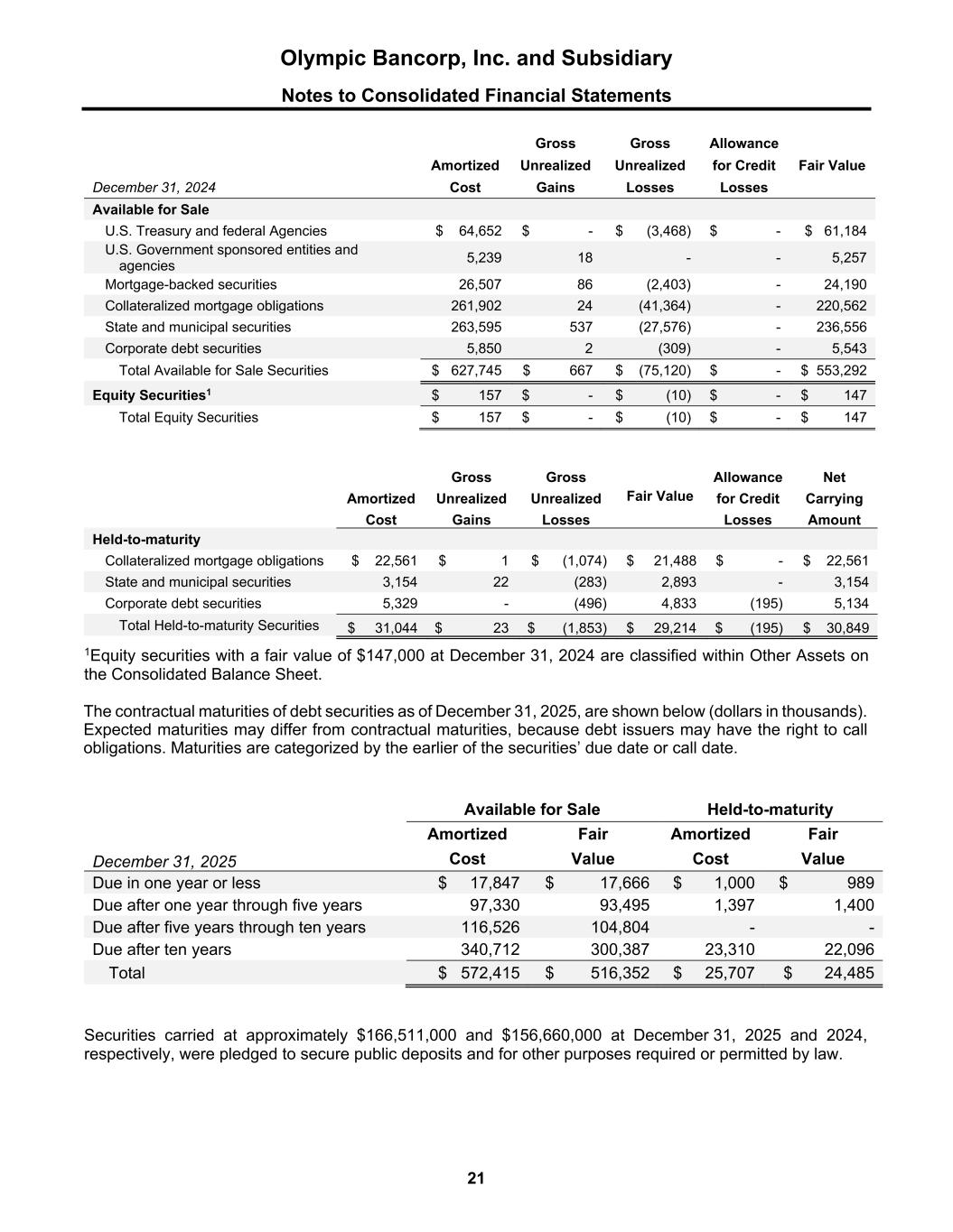 Olympic Bancorp, Inc. and Subsidiary Notes to Consolidated Financial Statements 21 Gross Gross Allowance Fair Value Amortized Unrealized Unrealized for Credit December 31, 2024 Cost Gains Losses Losses Available for Sale U.S. Treasury and federal Agencies $ 64,652 $ - $ (3,468) $ - $ 61,184 U.S. Government sponsored entities and agencies 5,239 18 - - 5,257 Mortgage-backed securities 26,507 86 (2,403) - 24,190 Collateralized mortgage obligations 261,902 24 (41,364) - 220,562 State and municipal securities 263,595 537 (27,576) - 236,556 Corporate debt securities 5,850 2 (309) - 5,543 Total Available for Sale Securities $ 627,745 $ 667 $ (75,120) $ - $ 553,292 Equity Securities1 $ 157 $ - $ (10) $ - $ 147 Total Equity Securities $ 157 $ - $ (10) $ - $ 147 Gross Gross Fair Value Allowance Net Amortized Unrealized Unrealized for Credit Carrying Cost Gains Losses Losses Amount Held-to-maturity Collateralized mortgage obligations $ 22,561 $ 1 $ (1,074) $ 21,488 $ - $ 22,561 State and municipal securities 3,154 22 (283) 2,893 - 3,154 Corporate debt securities 5,329 - (496) 4,833 (195) 5,134 Total Held-to-maturity Securities $ 31,044 $ 23 $ (1,853) $ 29,214 $ (195) $ 30,849 1Equity securities with a fair value of $147,000 at December 31, 2024 are classified within Other Assets on the Consolidated Balance Sheet. The contractual maturities of debt securities as of December 31, 2025, are shown below (dollars in thousands). Expected maturities may differ from contractual maturities, because debt issuers may have the right to call obligations. Maturities are categorized by the earlier of the securities’ due date or call date. Available for Sale Held-to-maturity December 31, 2025 Amortized Fair Amortized Fair Cost Value Cost Value Due in one year or less $ 17,847 $ 17,666 $ 1,000 $ 989 Due after one year through five years 97,330 93,495 1,397 1,400 Due after five years through ten years 116,526 104,804 - - Due after ten years 340,712 300,387 23,310 22,096 Total $ 572,415 $ 516,352 $ 25,707 $ 24,485 Securities carried at approximately $166,511,000 and $156,660,000 at December 31, 2025 and 2024, respectively, were pledged to secure public deposits and for other purposes required or permitted by law.