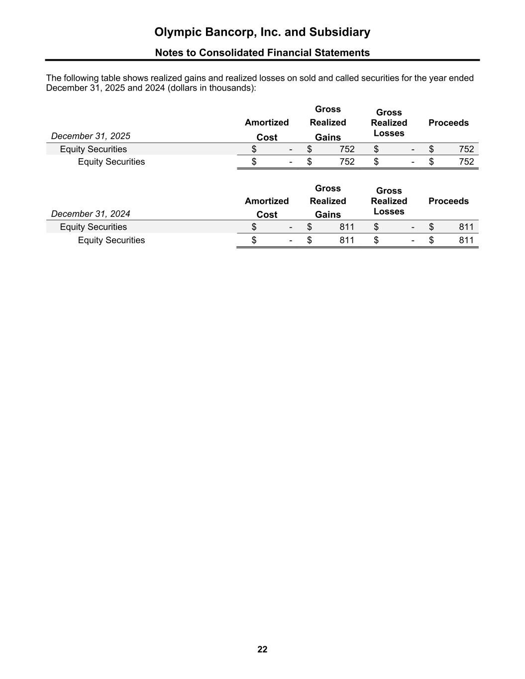 Olympic Bancorp, Inc. and Subsidiary Notes to Consolidated Financial Statements 22 The following table shows realized gains and realized losses on sold and called securities for the year ended December 31, 2025 and 2024 (dollars in thousands): Gross Gross Realized Losses Proceeds Amortized Realized December 31, 2025 Cost Gains Equity Securities $ - $ 752 $ - $ 752 Equity Securities $ - $ 752 $ - $ 752 Gross Gross Realized Losses Proceeds Amortized Realized December 31, 2024 Cost Gains Equity Securities $ - $ 811 $ - $ 811 Equity Securities $ - $ 811 $ - $ 811