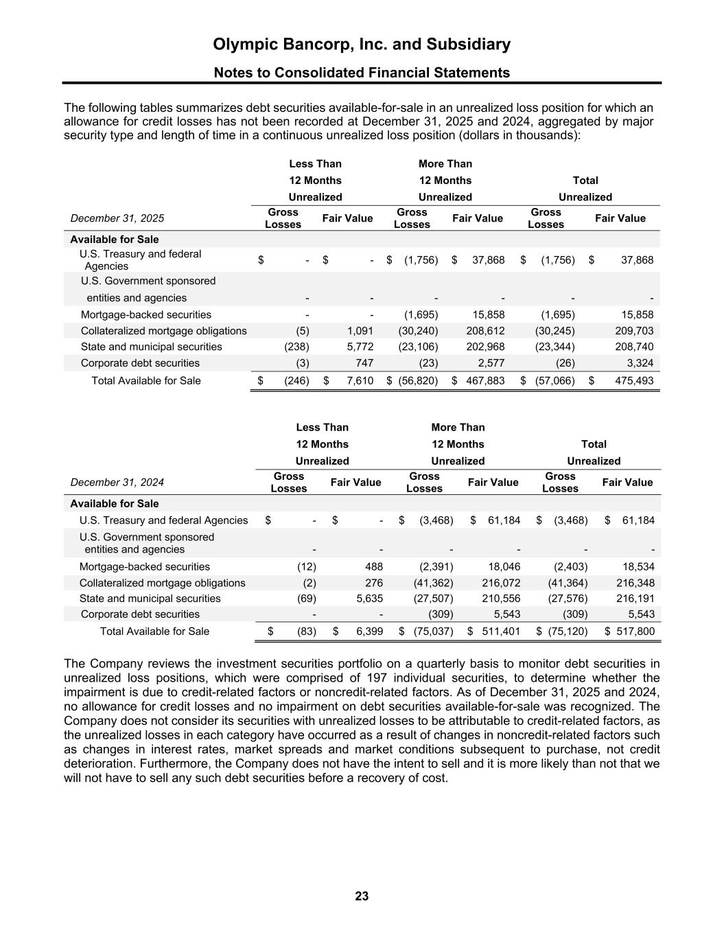 Olympic Bancorp, Inc. and Subsidiary Notes to Consolidated Financial Statements 23 The following tables summarizes debt securities available-for-sale in an unrealized loss position for which an allowance for credit losses has not been recorded at December 31, 2025 and 2024, aggregated by major security type and length of time in a continuous unrealized loss position (dollars in thousands): Less Than More Than 12 Months 12 Months Total Unrealized Unrealized Unrealized December 31, 2025 Gross Losses Fair Value Gross Losses Fair Value Gross Losses Fair Value Available for Sale U.S. Treasury and federal Agencies $ - $ - $ (1,756) $ 37,868 $ (1,756) $ 37,868 U.S. Government sponsored entities and agencies - - - - - - Mortgage-backed securities - - (1,695) 15,858 (1,695) 15,858 Collateralized mortgage obligations (5) 1,091 (30,240) 208,612 (30,245) 209,703 State and municipal securities (238) 5,772 (23,106) 202,968 (23,344) 208,740 Corporate debt securities (3) 747 (23) 2,577 (26) 3,324 Total Available for Sale $ (246) $ 7,610 $ (56,820) $ 467,883 $ (57,066) $ 475,493 Less Than More Than 12 Months 12 Months Total Unrealized Unrealized Unrealized December 31, 2024 Gross Losses Fair Value Gross Losses Fair Value Gross Losses Fair Value Available for Sale U.S. Treasury and federal Agencies $ - $ - $ (3,468) $ 61,184 $ (3,468) $ 61,184 U.S. Government sponsored entities and agencies - - - - - - Mortgage-backed securities (12) 488 (2,391) 18,046 (2,403) 18,534 Collateralized mortgage obligations (2) 276 (41,362) 216,072 (41,364) 216,348 State and municipal securities (69) 5,635 (27,507) 210,556 (27,576) 216,191 Corporate debt securities - - (309) 5,543 (309) 5,543 Total Available for Sale $ (83) $ 6,399 $ (75,037) $ 511,401 $ (75,120) $ 517,800 The Company reviews the investment securities portfolio on a quarterly basis to monitor debt securities in unrealized loss positions, which were comprised of 197 individual securities, to determine whether the impairment is due to credit-related factors or noncredit-related factors. As of December 31, 2025 and 2024, no allowance for credit losses and no impairment on debt securities available-for-sale was recognized. The Company does not consider its securities with unrealized losses to be attributable to credit-related factors, as the unrealized losses in each category have occurred as a result of changes in noncredit-related factors such as changes in interest rates, market spreads and market conditions subsequent to purchase, not credit deterioration. Furthermore, the Company does not have the intent to sell and it is more likely than not that we will not have to sell any such debt securities before a recovery of cost.