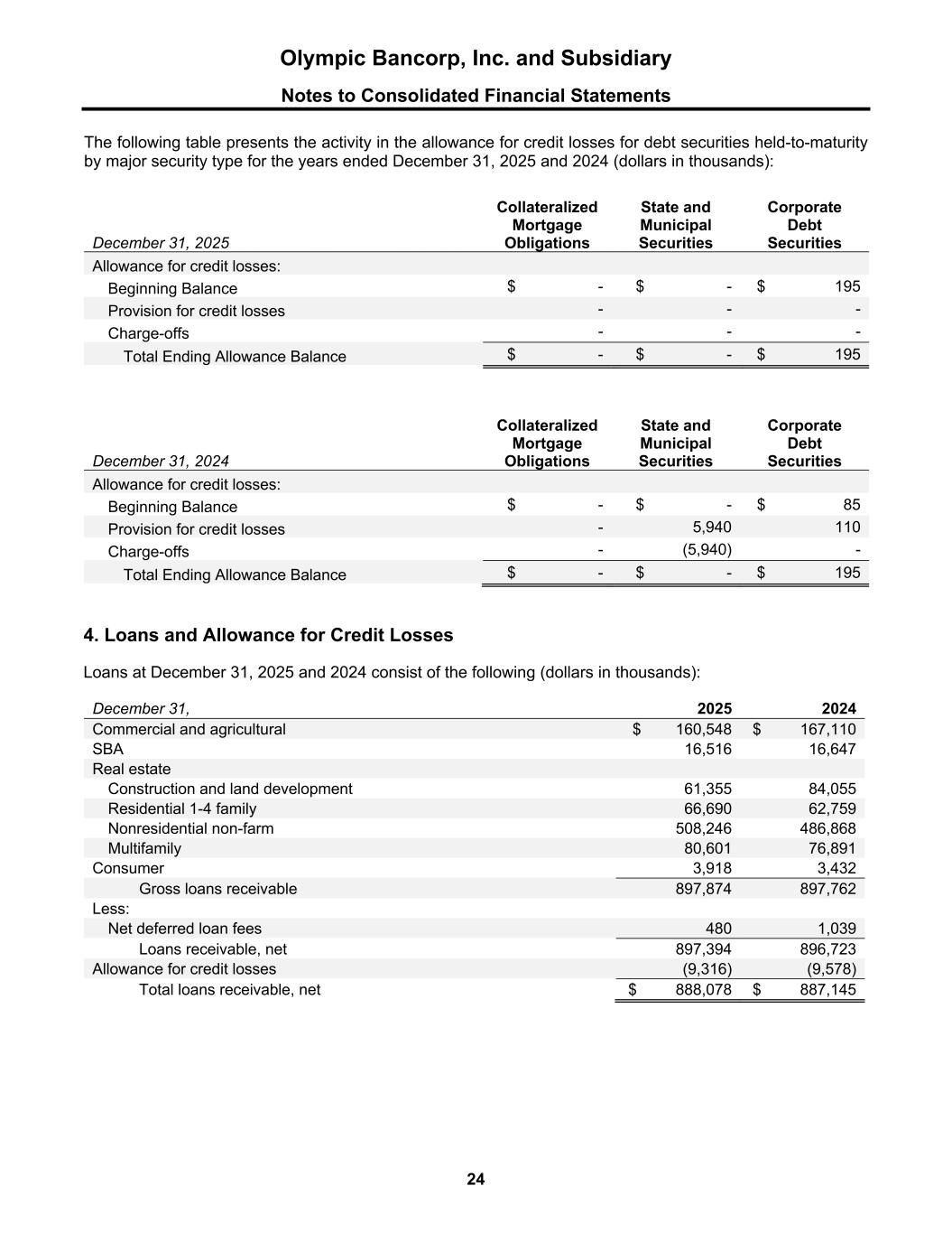 Olympic Bancorp, Inc. and Subsidiary Notes to Consolidated Financial Statements 24 The following table presents the activity in the allowance for credit losses for debt securities held-to-maturity by major security type for the years ended December 31, 2025 and 2024 (dollars in thousands): December 31, 2025 Collateralized Mortgage Obligations State and Municipal Securities Corporate Debt Securities Allowance for credit losses: Beginning Balance $ - $ - $ 195 Provision for credit losses - - - Charge-offs - - - Total Ending Allowance Balance $ - $ - $ 195 December 31, 2024 Collateralized Mortgage Obligations State and Municipal Securities Corporate Debt Securities Allowance for credit losses: Beginning Balance $ - $ - $ 85 Provision for credit losses - 5,940 110 Charge-offs - (5,940) - Total Ending Allowance Balance $ - $ - $ 195 4. Loans and Allowance for Credit Losses Loans at December 31, 2025 and 2024 consist of the following (dollars in thousands): December 31, 2025 2024 Commercial and agricultural $ 160,548 $ 167,110 SBA 16,516 16,647 Real estate Construction and land development 61,355 84,055 Residential 1-4 family 66,690 62,759 Nonresidential non-farm 508,246 486,868 Multifamily 80,601 76,891 Consumer 3,918 3,432 Gross loans receivable 897,874 897,762 Less: Net deferred loan fees 480 1,039 Loans receivable, net 897,394 896,723 Allowance for credit losses (9,316) (9,578) Total loans receivable, net $ 888,078 $ 887,145