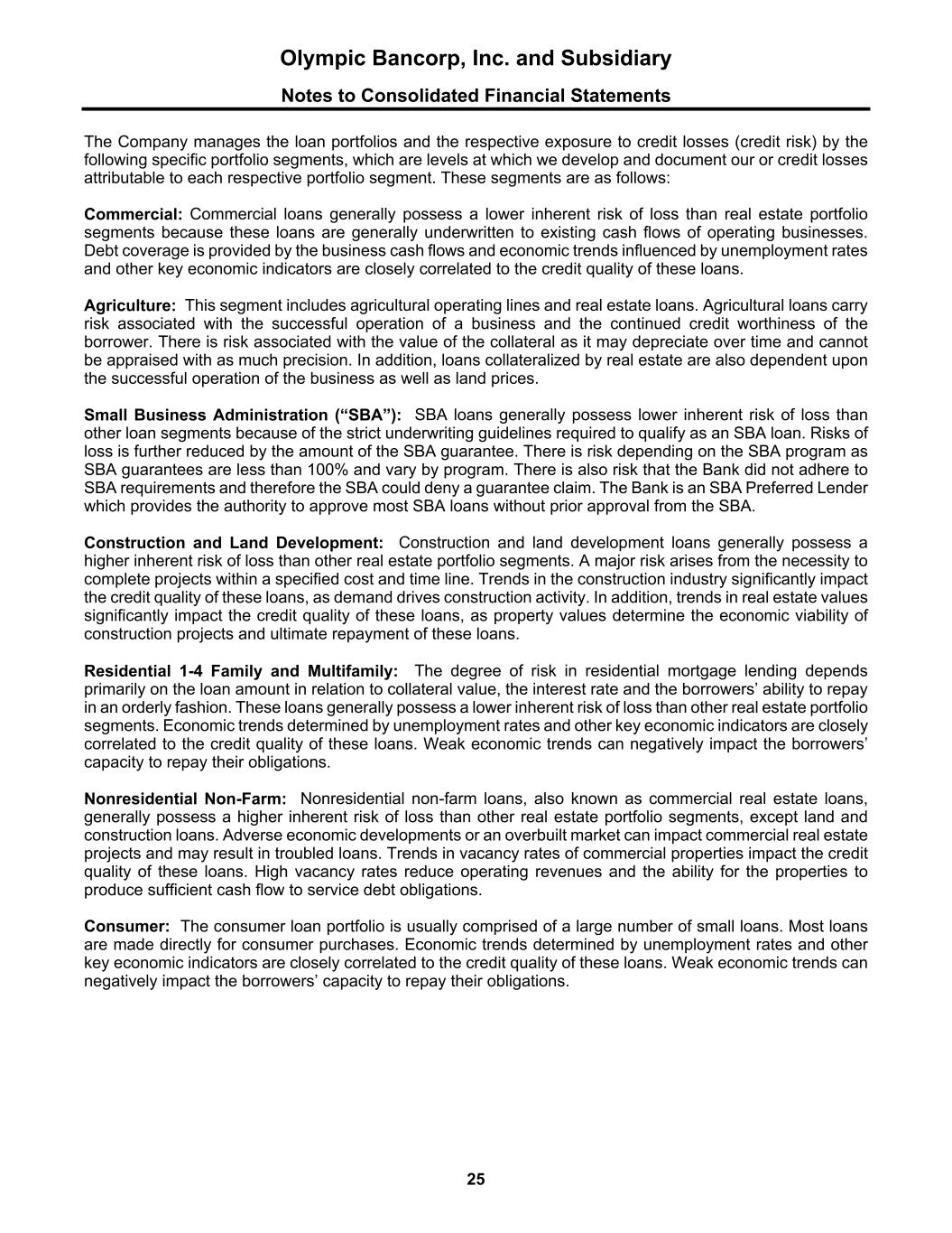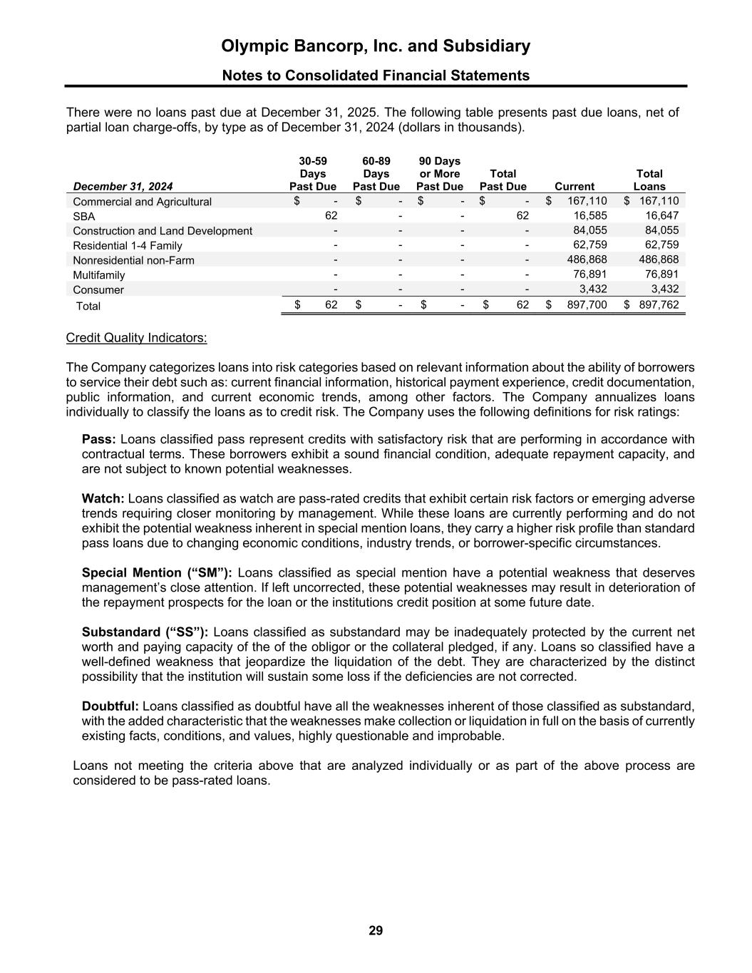 Olympic Bancorp, Inc. and Subsidiary Notes to Consolidated Financial Statements 29 There were no loans past due at December 31, 2025. The following table presents past due loans, net of partial loan charge-offs, by type as of December 31, 2024 (dollars in thousands). December 31, 2024 30-59 Days Past Due 60-89 Days Past Due 90 Days or More Past Due Total Past Due Current Total Loans Commercial and Agricultural $ - $ - $ - $ - $ 167,110 $ 167,110 SBA 62 - - 62 16,585 16,647 Construction and Land Development - - - - 84,055 84,055 Residential 1-4 Family - - - - 62,759 62,759 Nonresidential non-Farm - - - - 486,868 486,868 Multifamily - - - - 76,891 76,891 Consumer - - - - 3,432 3,432 Total $ 62 $ - $ - $ 62 $ 897,700 $ 897,762 Credit Quality Indicators: The Company categorizes loans into risk categories based on relevant information about the ability of borrowers to service their debt such as: current financial information, historical payment experience, credit documentation, public information, and current economic trends, among other factors. The Company annualizes loans individually to classify the loans as to credit risk. The Company uses the following definitions for risk ratings: Pass: Loans classified pass represent credits with satisfactory risk that are performing in accordance with contractual terms. These borrowers exhibit a sound financial condition, adequate repayment capacity, and are not subject to known potential weaknesses. Watch: Loans classified as watch are pass-rated credits that exhibit certain risk factors or emerging adverse trends requiring closer monitoring by management. While these loans are currently performing and do not exhibit the potential weakness inherent in special mention loans, they carry a higher risk profile than standard pass loans due to changing economic conditions, industry trends, or borrower-specific circumstances. Special Mention (“SM”): Loans classified as special mention have a potential weakness that deserves management’s close attention. If left uncorrected, these potential weaknesses may result in deterioration of the repayment prospects for the loan or the institutions credit position at some future date. Substandard (“SS”): Loans classified as substandard may be inadequately protected by the current net worth and paying capacity of the of the obligor or the collateral pledged, if any. Loans so classified have a well-defined weakness that jeopardize the liquidation of the debt. They are characterized by the distinct possibility that the institution will sustain some loss if the deficiencies are not corrected. Doubtful: Loans classified as doubtful have all the weaknesses inherent of those classified as substandard, with the added characteristic that the weaknesses make collection or liquidation in full on the basis of currently existing facts, conditions, and values, highly questionable and improbable. Loans not meeting the criteria above that are analyzed individually or as part of the above process are considered to be pass-rated loans.