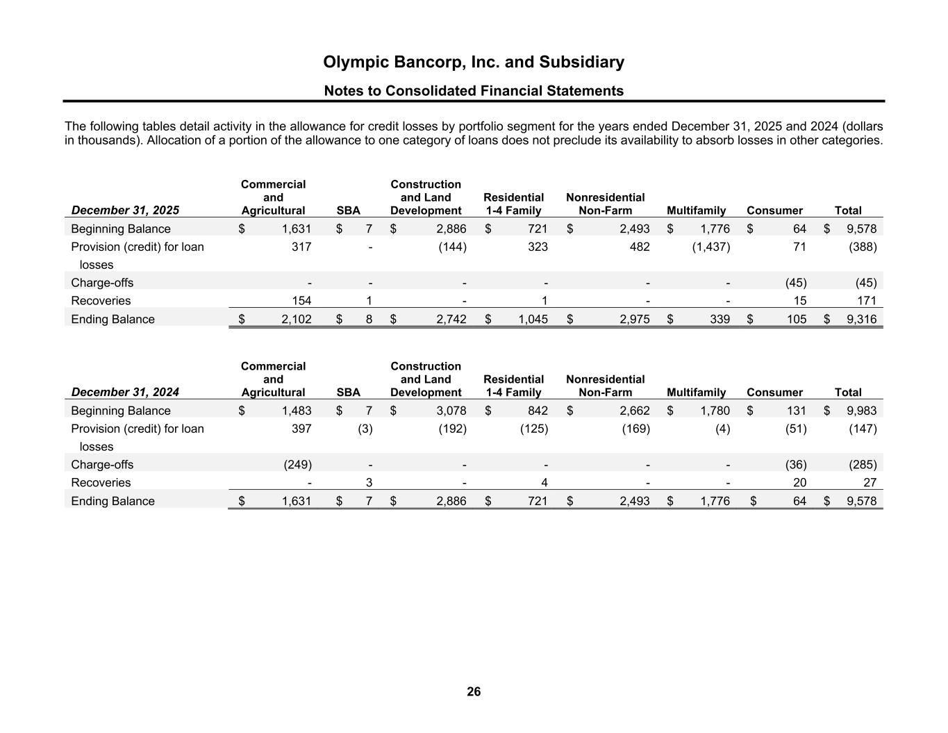 Olympic Bancorp, Inc. and Subsidiary Notes to Consolidated Financial Statements 26 The following tables detail activity in the allowance for credit losses by portfolio segment for the years ended December 31, 2025 and 2024 (dollars in thousands). Allocation of a portion of the allowance to one category of loans does not preclude its availability to absorb losses in other categories. December 31, 2025 Commercial and Agricultural SBA Construction and Land Development Residential 1-4 Family Nonresidential Non-Farm Multifamily Consumer Total Beginning Balance $ 1,631 $ 7 $ 2,886 $ 721 $ 2,493 $ 1,776 $ 64 $ 9,578 Provision (credit) for loan 317 - (144) 323 482 (1,437) 71 (388) losses Charge-offs - - - - - - (45) (45) Recoveries 154 1 - 1 - - 15 171 Ending Balance $ 2,102 $ 8 $ 2,742 $ 1,045 $ 2,975 $ 339 $ 105 $ 9,316 December 31, 2024 Commercial and Agricultural SBA Construction and Land Development Residential 1-4 Family Nonresidential Non-Farm Multifamily Consumer Total Beginning Balance $ 1,483 $ 7 $ 3,078 $ 842 $ 2,662 $ 1,780 $ 131 $ 9,983 Provision (credit) for loan 397 (3) (192) (125) (169) (4) (51) (147) losses Charge-offs (249) - - - - - (36) (285) Recoveries - 3 - 4 - - 20 27 Ending Balance $ 1,631 $ 7 $ 2,886 $ 721 $ 2,493 $ 1,776 $ 64 $ 9,578