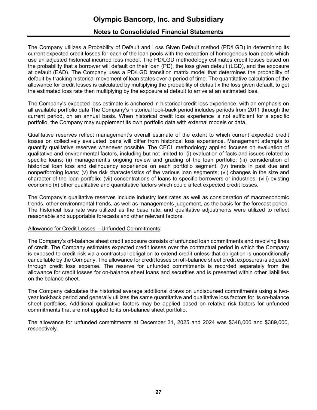 Olympic Bancorp, Inc. and Subsidiary Notes to Consolidated Financial Statements 27 The Company utilizes a Probability of Default and Loss Given Default method (PD/LGD) in determining its current expected credit losses for each of the loan pools with the exception of homogenous loan pools which use an adjusted historical incurred loss model. The PD/LGD methodology estimates credit losses based on the probability that a borrower will default on their loan (PD), the loss given default (LGD), and the exposure at default (EAD). The Company uses a PD/LGD transition matrix model that determines the probability of default by tracking historical movement of loan states over a period of time. The quantitative calculation of the allowance for credit losses is calculated by multiplying the probability of default x the loss given default, to get the estimated loss rate then multiplying by the exposure at default to arrive at an estimated loss. The Company’s expected loss estimate is anchored in historical credit loss experience, with an emphasis on all available portfolio data The Company’s historical look-back period includes periods from 2011 through the current period, on an annual basis. When historical credit loss experience is not sufficient for a specific portfolio, the Company may supplement its own portfolio data with external models or data. Qualitative reserves reflect management’s overall estimate of the extent to which current expected credit losses on collectively evaluated loans will differ from historical loss experience. Management attempts to quantify qualitative reserves whenever possible. The CECL methodology applied focuses on evaluation of qualitative and environmental factors, including but not limited to: (i) evaluation of facts and issues related to specific loans; (ii) management’s ongoing review and grading of the loan portfolio; (iii) consideration of historical loan loss and delinquency experience on each portfolio segment; (iv) trends in past due and nonperforming loans; (v) the risk characteristics of the various loan segments; (vi) changes in the size and character of the loan portfolio; (vii) concentrations of loans to specific borrowers or industries; (viii) existing economic (x) other qualitative and quantitative factors which could affect expected credit losses. The Company’s qualitative reserves include industry loss rates as well as consideration of macroeconomic trends, other environmental trends, as well as managements judgement, as the basis for the forecast period. The historical loss rate was utilized as the base rate, and qualitative adjustments were utilized to reflect reasonable and supportable forecasts and other relevant factors. Allowance for Credit Losses – Unfunded Commitments: The Company’s off-balance sheet credit exposure consists of unfunded loan commitments and revolving lines of credit. The Company estimates expected credit losses over the contractual period in which the Company is exposed to credit risk via a contractual obligation to extend credit unless that obligation is unconditionally cancellable by the Company. The allowance for credit losses on off-balance sheet credit exposures is adjusted through credit loss expense. The reserve for unfunded commitments is recorded separately from the allowance for credit losses for on-balance sheet loans and securities and is presented within other liabilities on the balance sheet. The Company calculates the historical average additional draws on undisbursed commitments using a two- year lookback period and generally utilizes the same quantitative and qualitative loss factors for its on-balance sheet portfolios. Additional qualitative factors may be applied based on relative risk factors for unfunded commitments that are not applied to its on-balance sheet portfolio. The allowance for unfunded commitments at December 31, 2025 and 2024 was $348,000 and $389,000, respectively.