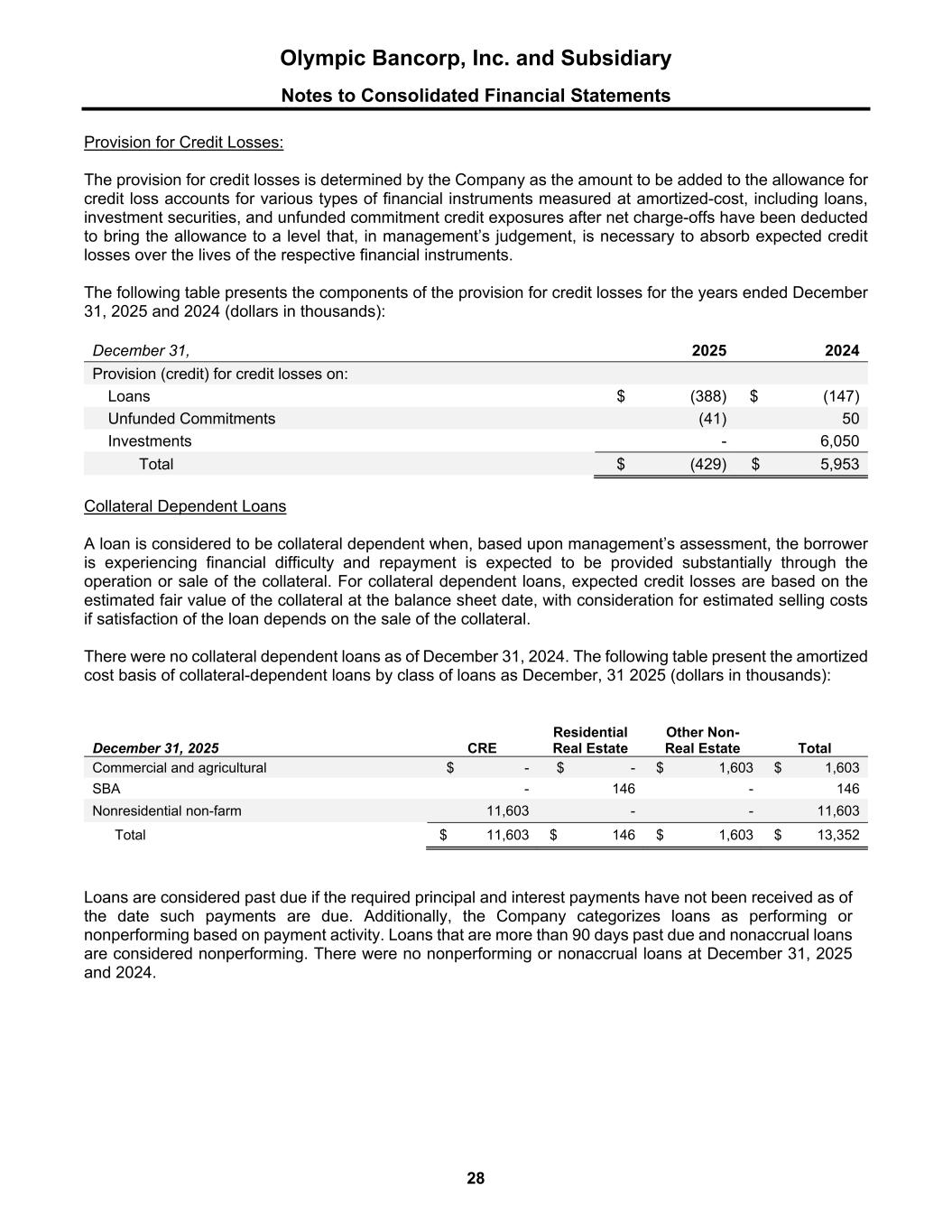 Olympic Bancorp, Inc. and Subsidiary Notes to Consolidated Financial Statements 28 Provision for Credit Losses: The provision for credit losses is determined by the Company as the amount to be added to the allowance for credit loss accounts for various types of financial instruments measured at amortized-cost, including loans, investment securities, and unfunded commitment credit exposures after net charge-offs have been deducted to bring the allowance to a level that, in management’s judgement, is necessary to absorb expected credit losses over the lives of the respective financial instruments. The following table presents the components of the provision for credit losses for the years ended December 31, 2025 and 2024 (dollars in thousands): December 31, 2025 2024 Provision (credit) for credit losses on: Loans $ (388) $ (147) Unfunded Commitments (41) 50 Investments - 6,050 Total $ (429) $ 5,953 Collateral Dependent Loans A loan is considered to be collateral dependent when, based upon management’s assessment, the borrower is experiencing financial difficulty and repayment is expected to be provided substantially through the operation or sale of the collateral. For collateral dependent loans, expected credit losses are based on the estimated fair value of the collateral at the balance sheet date, with consideration for estimated selling costs if satisfaction of the loan depends on the sale of the collateral. There were no collateral dependent loans as of December 31, 2024. The following table present the amortized cost basis of collateral-dependent loans by class of loans as December, 31 2025 (dollars in thousands): December 31, 2025 CRE Residential Real Estate Other Non- Real Estate Total Commercial and agricultural $ - $ - $ 1,603 $ 1,603 SBA - 146 - 146 Nonresidential non-farm 11,603 - - 11,603 Total $ 11,603 $ 146 $ 1,603 $ 13,352 Loans are considered past due if the required principal and interest payments have not been received as of the date such payments are due. Additionally, the Company categorizes loans as performing or nonperforming based on payment activity. Loans that are more than 90 days past due and nonaccrual loans are considered nonperforming. There were no nonperforming or nonaccrual loans at December 31, 2025 and 2024.