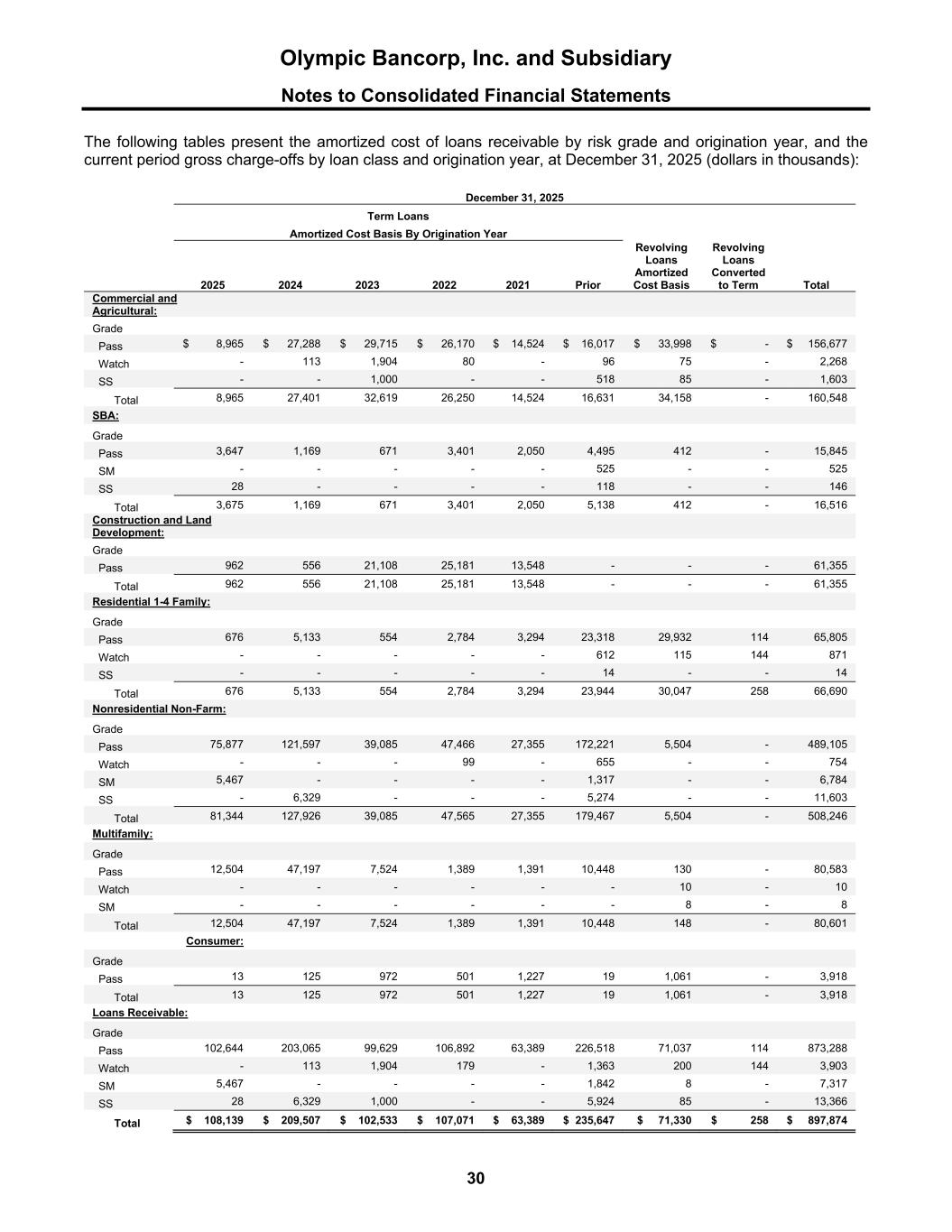 Olympic Bancorp, Inc. and Subsidiary Notes to Consolidated Financial Statements 30 The following tables present the amortized cost of loans receivable by risk grade and origination year, and the current period gross charge-offs by loan class and origination year, at December 31, 2025 (dollars in thousands): December 31, 2025 Term Loans Amortized Cost Basis By Origination Year 2025 2024 2023 2022 2021 Prior Revolving Loans Amortized Cost Basis Revolving Loans Converted to Term Total Commercial and Agricultural: Grade Pass $ 8,965 $ 27,288 $ 29,715 $ 26,170 $ 14,524 $ 16,017 $ 33,998 $ - $ 156,677 Watch - 113 1,904 80 - 96 75 - 2,268 SS - - 1,000 - - 518 85 - 1,603 Total 8,965 27,401 32,619 26,250 14,524 16,631 34,158 - 160,548 SBA: Grade Pass 3,647 1,169 671 3,401 2,050 4,495 412 - 15,845 SM - - - - - 525 - - 525 SS 28 - - - - 118 - - 146 Total 3,675 1,169 671 3,401 2,050 5,138 412 - 16,516 Construction and Land Development: Grade Pass 962 556 21,108 25,181 13,548 - - - 61,355 Total 962 556 21,108 25,181 13,548 - - - 61,355 Residential 1-4 Family: Grade Pass 676 5,133 554 2,784 3,294 23,318 29,932 114 65,805 Watch - - - - - 612 115 144 871 SS - - - - - 14 - - 14 Total 676 5,133 554 2,784 3,294 23,944 30,047 258 66,690 Nonresidential Non-Farm: Grade Pass 75,877 121,597 39,085 47,466 27,355 172,221 5,504 - 489,105 Watch - - - 99 - 655 - - 754 SM 5,467 - - - - 1,317 - - 6,784 SS - 6,329 - - - 5,274 - - 11,603 Total 81,344 127,926 39,085 47,565 27,355 179,467 5,504 - 508,246 Multifamily: Grade Pass 12,504 47,197 7,524 1,389 1,391 10,448 130 - 80,583 Watch - - - - - - 10 - 10 SM - - - - - - 8 - 8 Total 12,504 47,197 7,524 1,389 1,391 10,448 148 - 80,601 Consumer: Grade Pass 13 125 972 501 1,227 19 1,061 - 3,918 Total 13 125 972 501 1,227 19 1,061 - 3,918 Loans Receivable: Grade Pass 102,644 203,065 99,629 106,892 63,389 226,518 71,037 114 873,288 Watch - 113 1,904 179 - 1,363 200 144 3,903 SM 5,467 - - - - 1,842 8 - 7,317 SS 28 6,329 1,000 - - 5,924 85 - 13,366 Total $ 108,139 $ 209,507 $ 102,533 $ 107,071 $ 63,389 $ 235,647 $ 71,330 $ 258 $ 897,874