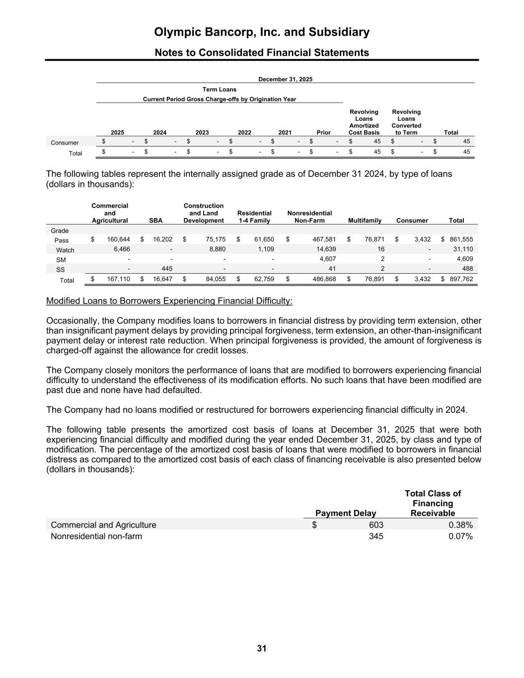 Olympic Bancorp, Inc. and Subsidiary Notes to Consolidated Financial Statements 31 December 31, 2025 Term Loans Current Period Gross Charge-offs by Origination Year 2025 2024 2023 2022 2021 Prior Revolving Loans Amortized Cost Basis Revolving Loans Converted to Term Total Consumer $ - $ - $ - $ - $ - $ - $ 45 $ - $ 45 Total $ - $ - $ - $ - $ - $ - $ 45 $ - $ 45 The following tables represent the internally assigned grade as of December 31 2024, by type of loans (dollars in thousands): Commercial and Agricultural SBA Construction and Land Development Residential 1-4 Family Nonresidential Non-Farm Multifamily Consumer Total Grade Pass $ 160,644 $ 16,202 $ 75,175 $ 61,650 $ 467,581 $ 76,871 $ 3,432 $ 861,555 Watch 6,466 - 8,880 1,109 14,639 16 - 31,110 SM - - - - 4,607 2 - 4,609 SS - 445 - - 41 2 - 488 Total $ 167,110 $ 16,647 $ 84,055 $ 62,759 $ 486,868 $ 76,891 $ 3,432 $ 897,762 Modified Loans to Borrowers Experiencing Financial Difficulty: Occasionally, the Company modifies loans to borrowers in financial distress by providing term extension, other than insignificant payment delays by providing principal forgiveness, term extension, an other-than-insignificant payment delay or interest rate reduction. When principal forgiveness is provided, the amount of forgiveness is charged-off against the allowance for credit losses. The Company closely monitors the performance of loans that are modified to borrowers experiencing financial difficulty to understand the effectiveness of its modification efforts. No such loans that have been modified are past due and none have had defaulted. The Company had no loans modified or restructured for borrowers experiencing financial difficulty in 2024. The following table presents the amortized cost basis of loans at December 31, 2025 that were both experiencing financial difficulty and modified during the year ended December 31, 2025, by class and type of modification. The percentage of the amortized cost basis of loans that were modified to borrowers in financial distress as compared to the amortized cost basis of each class of financing receivable is also presented below (dollars in thousands): Payment Delay Total Class of Financing Receivable Commercial and Agriculture $ 603 0.38% Nonresidential non-farm 345 0.07%