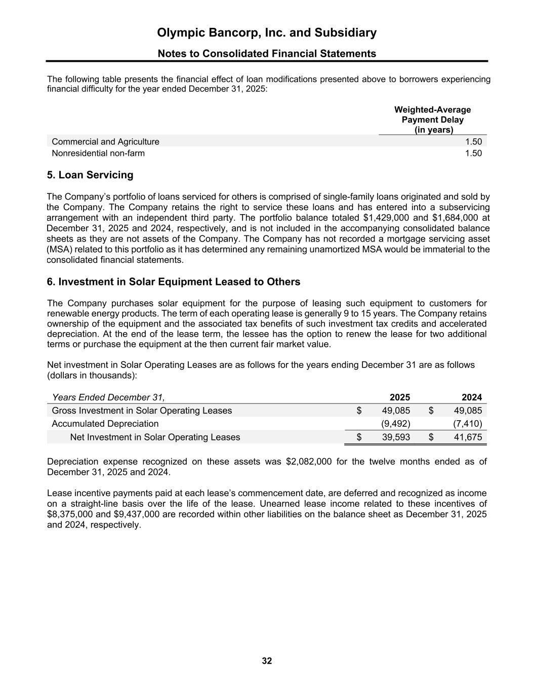 Olympic Bancorp, Inc. and Subsidiary Notes to Consolidated Financial Statements 32 The following table presents the financial effect of loan modifications presented above to borrowers experiencing financial difficulty for the year ended December 31, 2025: Weighted-Average Payment Delay (in years) Commercial and Agriculture 1.50 Nonresidential non-farm 1.50 5. Loan Servicing The Company’s portfolio of loans serviced for others is comprised of single-family loans originated and sold by the Company. The Company retains the right to service these loans and has entered into a subservicing arrangement with an independent third party. The portfolio balance totaled $1,429,000 and $1,684,000 at December 31, 2025 and 2024, respectively, and is not included in the accompanying consolidated balance sheets as they are not assets of the Company. The Company has not recorded a mortgage servicing asset (MSA) related to this portfolio as it has determined any remaining unamortized MSA would be immaterial to the consolidated financial statements. 6. Investment in Solar Equipment Leased to Others The Company purchases solar equipment for the purpose of leasing such equipment to customers for renewable energy products. The term of each operating lease is generally 9 to 15 years. The Company retains ownership of the equipment and the associated tax benefits of such investment tax credits and accelerated depreciation. At the end of the lease term, the lessee has the option to renew the lease for two additional terms or purchase the equipment at the then current fair market value. Net investment in Solar Operating Leases are as follows for the years ending December 31 are as follows (dollars in thousands): Years Ended December 31, 2025 2024 Gross Investment in Solar Operating Leases $ 49,085 $ 49,085 Accumulated Depreciation (9,492) (7,410) Net Investment in Solar Operating Leases $ 39,593 $ 41,675 Depreciation expense recognized on these assets was $2,082,000 for the twelve months ended as of December 31, 2025 and 2024. Lease incentive payments paid at each lease’s commencement date, are deferred and recognized as income on a straight-line basis over the life of the lease. Unearned lease income related to these incentives of $8,375,000 and $9,437,000 are recorded within other liabilities on the balance sheet as December 31, 2025 and 2024, respectively.