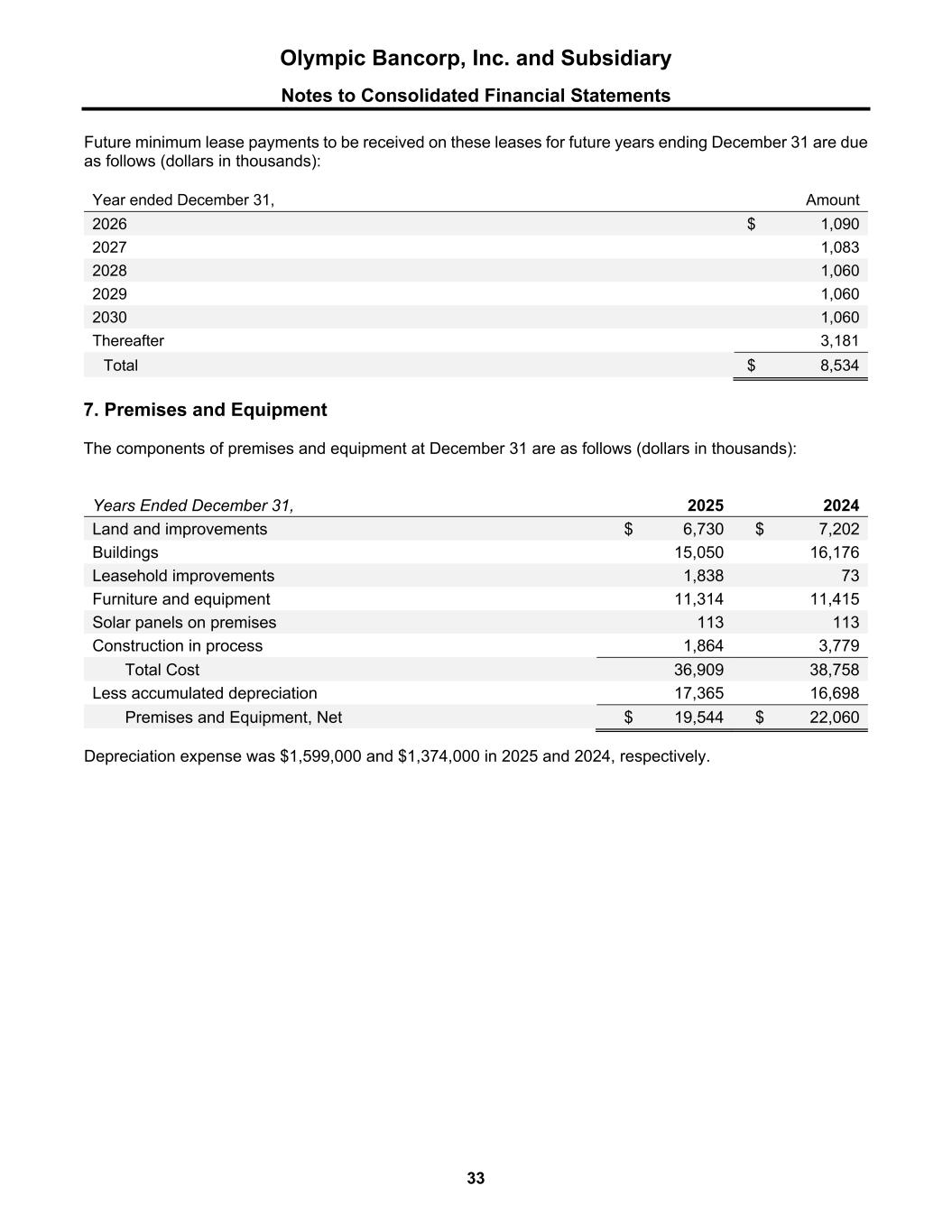 Olympic Bancorp, Inc. and Subsidiary Notes to Consolidated Financial Statements 33 Future minimum lease payments to be received on these leases for future years ending December 31 are due as follows (dollars in thousands): Year ended December 31, Amount 2026 $ 1,090 2027 1,083 2028 1,060 2029 1,060 2030 1,060 Thereafter 3,181 Total $ 8,534 7. Premises and Equipment The components of premises and equipment at December 31 are as follows (dollars in thousands): Years Ended December 31, 2025 2024 Land and improvements $ 6,730 $ 7,202 Buildings 15,050 16,176 Leasehold improvements 1,838 73 Furniture and equipment 11,314 11,415 Solar panels on premises 113 113 Construction in process 1,864 3,779 Total Cost 36,909 38,758 Less accumulated depreciation 17,365 16,698 Premises and Equipment, Net $ 19,544 $ 22,060 Depreciation expense was $1,599,000 and $1,374,000 in 2025 and 2024, respectively.