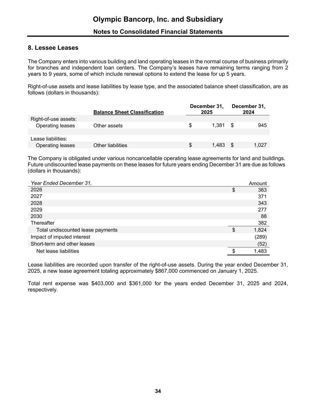Olympic Bancorp, Inc. and Subsidiary Notes to Consolidated Financial Statements 34 8. Lessee Leases The Company enters into various building and land operating leases in the normal course of business primarily for branches and independent loan centers. The Company’s leases have remaining terms ranging from 2 years to 9 years, some of which include renewal options to extend the lease for up 5 years. Right-of-use assets and lease liabilities by lease type, and the associated balance sheet classification, are as follows (dollars in thousands): Balance Sheet Classification December 31, 2025 December 31, 2024 Right-of-use assets: Operating leases Other assets $ 1,381 $ 945 Lease liabilities: Operating leases Other liabilities $ 1,483 $ 1,027 The Company is obligated under various noncancellable operating lease agreements for land and buildings. Future undiscounted lease payments on these leases for future years ending December 31 are due as follows (dollars in thousands): Year Ended December 31, Amount 2026 $ 363 2027 371 2028 343 2029 277 2030 88 Thereafter 382 Total undiscounted lease payments $ 1,824 Impact of imputed interest (289) Short-term and other leases (52) Net lease liabilities $ 1,483 Lease liabilities are recorded upon transfer of the right-of-use assets. During the year ended December 31, 2025, a new lease agreement totaling approximately $867,000 commenced on January 1, 2025. Total rent expense was $403,000 and $361,000 for the years ended December 31, 2025 and 2024, respectively.