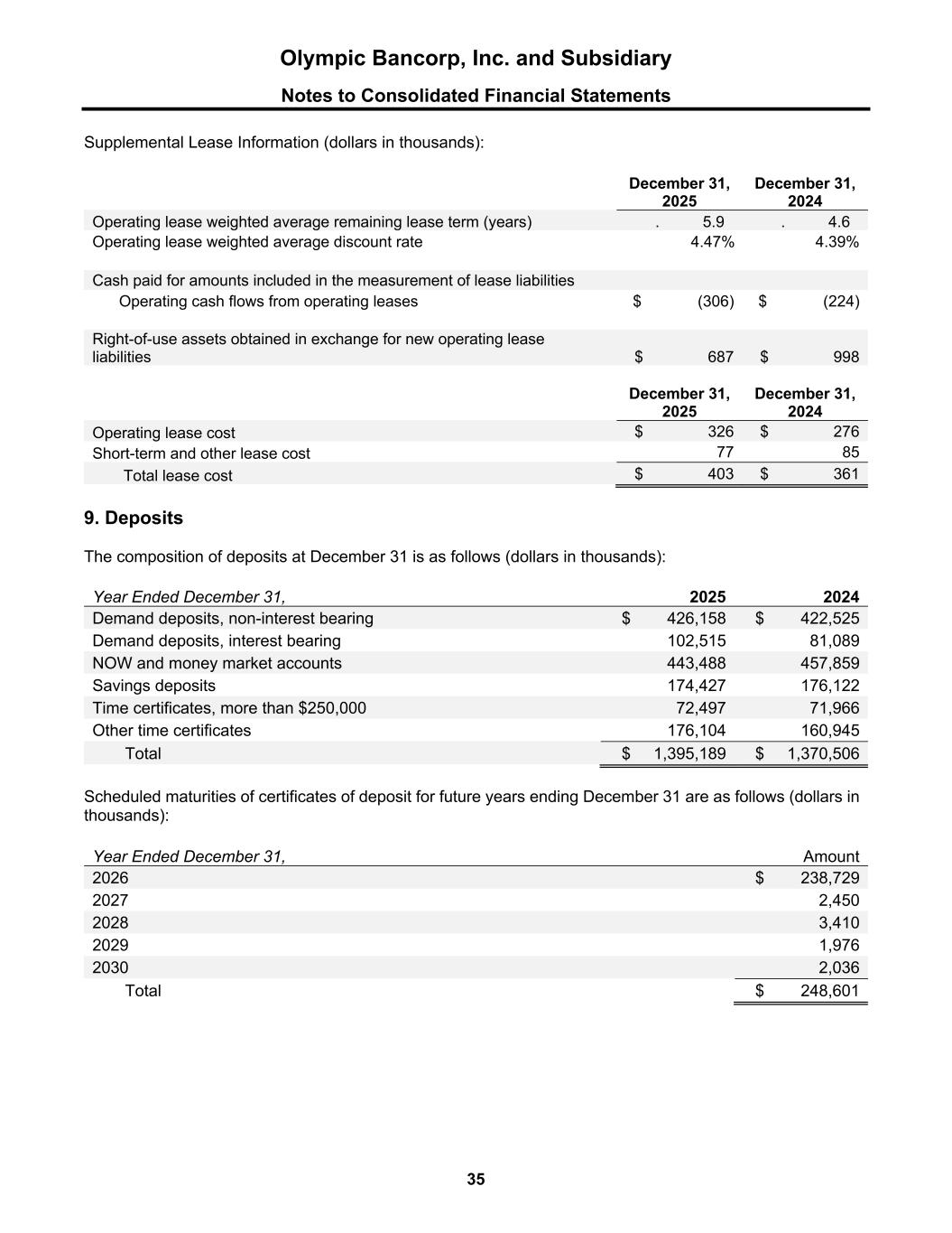 Olympic Bancorp, Inc. and Subsidiary Notes to Consolidated Financial Statements 35 Supplemental Lease Information (dollars in thousands): December 31, 2025 December 31, 2024 Operating lease weighted average remaining lease term (years) . 5.9 . 4.6 Operating lease weighted average discount rate 4.47% 4.39% Cash paid for amounts included in the measurement of lease liabilities Operating cash flows from operating leases $ (306) $ (224) Right-of-use assets obtained in exchange for new operating lease liabilities $ 687 $ 998 December 31, 2025 December 31, 2024 Operating lease cost $ 326 $ 276 Short-term and other lease cost 77 85 Total lease cost $ 403 $ 361 9. Deposits The composition of deposits at December 31 is as follows (dollars in thousands): Year Ended December 31, 2025 2024 Demand deposits, non-interest bearing $ 426,158 $ 422,525 Demand deposits, interest bearing 102,515 81,089 NOW and money market accounts 443,488 457,859 Savings deposits 174,427 176,122 Time certificates, more than $250,000 72,497 71,966 Other time certificates 176,104 160,945 Total $ 1,395,189 $ 1,370,506 Scheduled maturities of certificates of deposit for future years ending December 31 are as follows (dollars in thousands): Year Ended December 31, Amount 2026 $ 238,729 2027 2,450 2028 3,410 2029 1,976 2030 2,036 Total $ 248,601