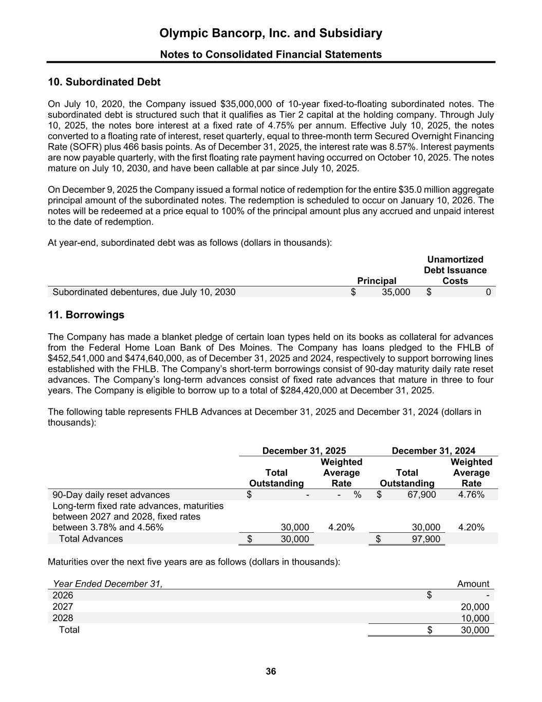 Olympic Bancorp, Inc. and Subsidiary Notes to Consolidated Financial Statements 36 10. Subordinated Debt On July 10, 2020, the Company issued $35,000,000 of 10-year fixed-to-floating subordinated notes. The subordinated debt is structured such that it qualifies as Tier 2 capital at the holding company. Through July 10, 2025, the notes bore interest at a fixed rate of 4.75% per annum. Effective July 10, 2025, the notes converted to a floating rate of interest, reset quarterly, equal to three-month term Secured Overnight Financing Rate (SOFR) plus 466 basis points. As of December 31, 2025, the interest rate was 8.57%. Interest payments are now payable quarterly, with the first floating rate payment having occurred on October 10, 2025. The notes mature on July 10, 2030, and have been callable at par since July 10, 2025. On December 9, 2025 the Company issued a formal notice of redemption for the entire $35.0 million aggregate principal amount of the subordinated notes. The redemption is scheduled to occur on January 10, 2026. The notes will be redeemed at a price equal to 100% of the principal amount plus any accrued and unpaid interest to the date of redemption. At year-end, subordinated debt was as follows (dollars in thousands): Principal Unamortized Debt Issuance Costs Subordinated debentures, due July 10, 2030 $ 35,000 $ 0 11. Borrowings The Company has made a blanket pledge of certain loan types held on its books as collateral for advances from the Federal Home Loan Bank of Des Moines. The Company has loans pledged to the FHLB of $452,541,000 and $474,640,000, as of December 31, 2025 and 2024, respectively to support borrowing lines established with the FHLB. The Company’s short-term borrowings consist of 90-day maturity daily rate reset advances. The Company’s long-term advances consist of fixed rate advances that mature in three to four years. The Company is eligible to borrow up to a total of $284,420,000 at December 31, 2025. The following table represents FHLB Advances at December 31, 2025 and December 31, 2024 (dollars in thousands): December 31, 2025 December 31, 2024 Total Outstanding Weighted Average Rate Total Outstanding Weighted Average Rate 90-Day daily reset advances $ - - % $ 67,900 4.76% Long-term fixed rate advances, maturities between 2027 and 2028, fixed rates between 3.78% and 4.56% 30,000 4.20% 30,000 4.20% Total Advances $ 30,000 $ 97,900 Maturities over the next five years are as follows (dollars in thousands): Year Ended December 31, Amount 2026 $ - 2027 20,000 2028 10,000 Total $ 30,000