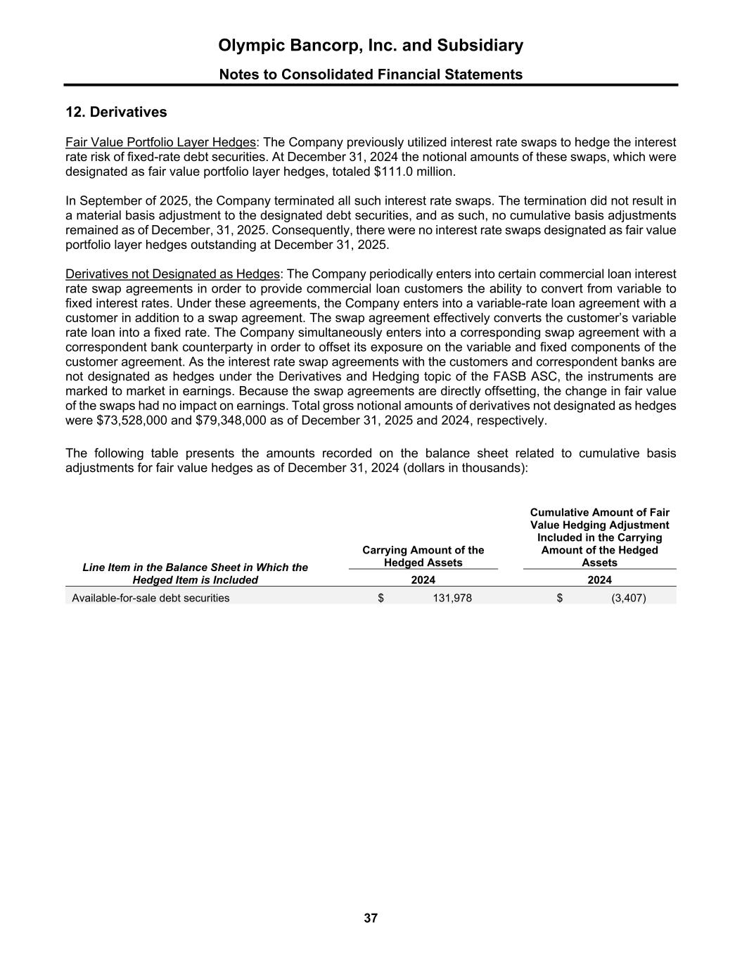Olympic Bancorp, Inc. and Subsidiary Notes to Consolidated Financial Statements 37 12. Derivatives Fair Value Portfolio Layer Hedges: The Company previously utilized interest rate swaps to hedge the interest rate risk of fixed-rate debt securities. At December 31, 2024 the notional amounts of these swaps, which were designated as fair value portfolio layer hedges, totaled $111.0 million. In September of 2025, the Company terminated all such interest rate swaps. The termination did not result in a material basis adjustment to the designated debt securities, and as such, no cumulative basis adjustments remained as of December, 31, 2025. Consequently, there were no interest rate swaps designated as fair value portfolio layer hedges outstanding at December 31, 2025. Derivatives not Designated as Hedges: The Company periodically enters into certain commercial loan interest rate swap agreements in order to provide commercial loan customers the ability to convert from variable to fixed interest rates. Under these agreements, the Company enters into a variable-rate loan agreement with a customer in addition to a swap agreement. The swap agreement effectively converts the customer’s variable rate loan into a fixed rate. The Company simultaneously enters into a corresponding swap agreement with a correspondent bank counterparty in order to offset its exposure on the variable and fixed components of the customer agreement. As the interest rate swap agreements with the customers and correspondent banks are not designated as hedges under the Derivatives and Hedging topic of the FASB ASC, the instruments are marked to market in earnings. Because the swap agreements are directly offsetting, the change in fair value of the swaps had no impact on earnings. Total gross notional amounts of derivatives not designated as hedges were $73,528,000 and $79,348,000 as of December 31, 2025 and 2024, respectively. The following table presents the amounts recorded on the balance sheet related to cumulative basis adjustments for fair value hedges as of December 31, 2024 (dollars in thousands): Line Item in the Balance Sheet in Which the Hedged Item is Included Carrying Amount of the Hedged Assets Cumulative Amount of Fair Value Hedging Adjustment Included in the Carrying Amount of the Hedged Assets 2024 2024 Available-for-sale debt securities $ 131,978 $ (3,407)