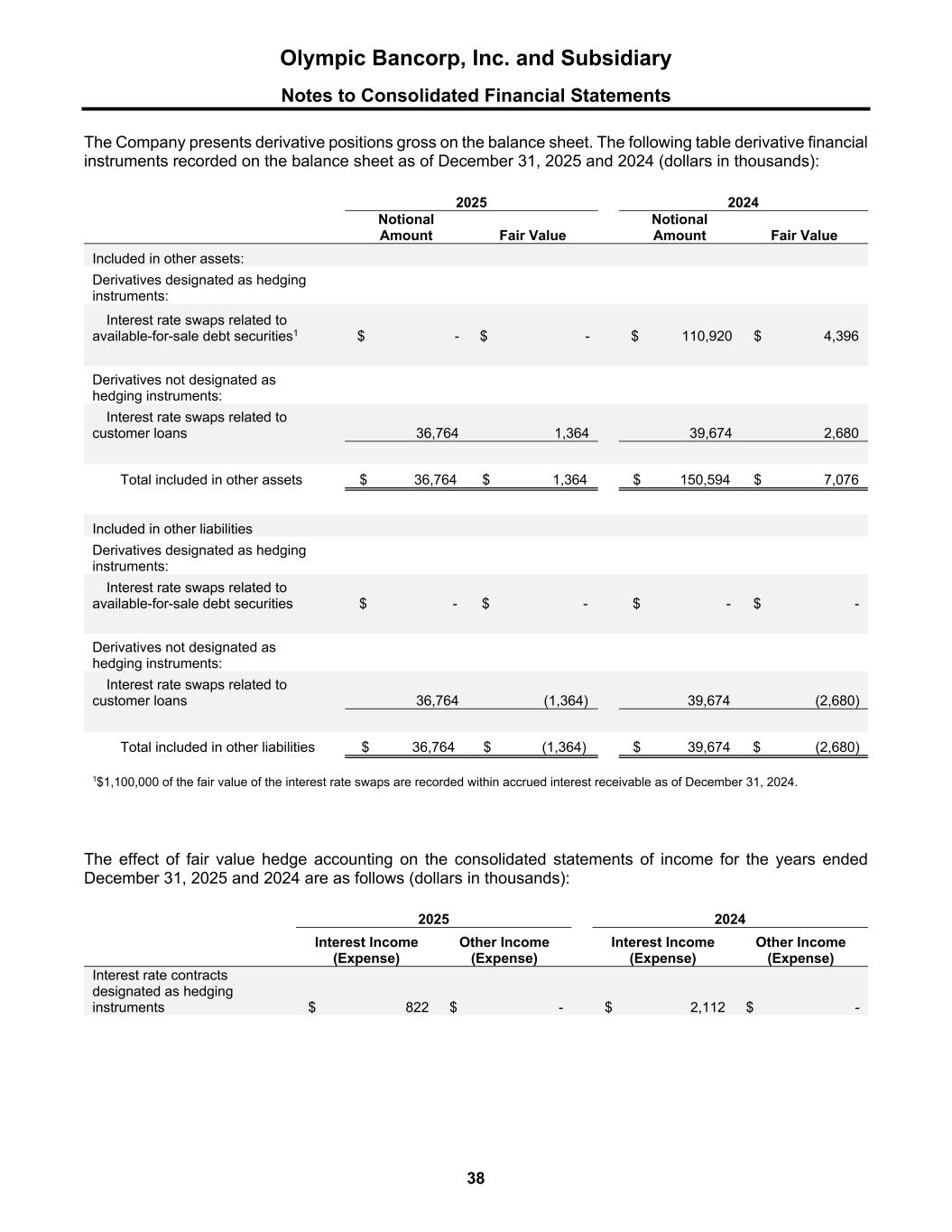 Olympic Bancorp, Inc. and Subsidiary Notes to Consolidated Financial Statements 38 The Company presents derivative positions gross on the balance sheet. The following table derivative financial instruments recorded on the balance sheet as of December 31, 2025 and 2024 (dollars in thousands): 2025 2024 Notional Amount Fair Value Notional Amount Fair Value Included in other assets: Derivatives designated as hedging instruments: Interest rate swaps related to available-for-sale debt securities1 $ - $ - $ 110,920 $ 4,396 Derivatives not designated as hedging instruments: Interest rate swaps related to customer loans 36,764 1,364 39,674 2,680 Total included in other assets $ 36,764 $ 1,364 $ 150,594 $ 7,076 Included in other liabilities Derivatives designated as hedging instruments: Interest rate swaps related to available-for-sale debt securities $ - $ - $ - $ - Derivatives not designated as hedging instruments: Interest rate swaps related to customer loans 36,764 (1,364) 39,674 (2,680) Total included in other liabilities $ 36,764 $ (1,364) $ 39,674 $ (2,680) 1$1,100,000 of the fair value of the interest rate swaps are recorded within accrued interest receivable as of December 31, 2024. The effect of fair value hedge accounting on the consolidated statements of income for the years ended December 31, 2025 and 2024 are as follows (dollars in thousands): 2025 2024 Interest Income (Expense) Other Income (Expense) Interest Income (Expense) Other Income (Expense) Interest rate contracts designated as hedging instruments $ 822 $ - $ 2,112 $ -
