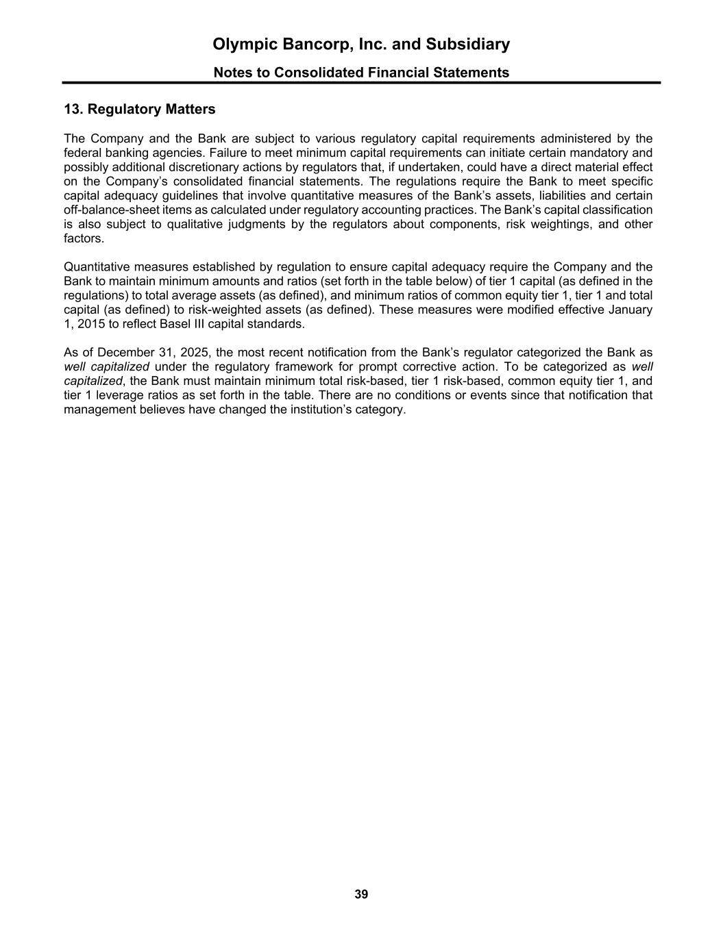 Olympic Bancorp, Inc. and Subsidiary Notes to Consolidated Financial Statements 39 13. Regulatory Matters The Company and the Bank are subject to various regulatory capital requirements administered by the federal banking agencies. Failure to meet minimum capital requirements can initiate certain mandatory and possibly additional discretionary actions by regulators that, if undertaken, could have a direct material effect on the Company’s consolidated financial statements. The regulations require the Bank to meet specific capital adequacy guidelines that involve quantitative measures of the Bank’s assets, liabilities and certain off-balance-sheet items as calculated under regulatory accounting practices. The Bank’s capital classification is also subject to qualitative judgments by the regulators about components, risk weightings, and other factors. Quantitative measures established by regulation to ensure capital adequacy require the Company and the Bank to maintain minimum amounts and ratios (set forth in the table below) of tier 1 capital (as defined in the regulations) to total average assets (as defined), and minimum ratios of common equity tier 1, tier 1 and total capital (as defined) to risk-weighted assets (as defined). These measures were modified effective January 1, 2015 to reflect Basel III capital standards. As of December 31, 2025, the most recent notification from the Bank’s regulator categorized the Bank as well capitalized under the regulatory framework for prompt corrective action. To be categorized as well capitalized, the Bank must maintain minimum total risk-based, tier 1 risk-based, common equity tier 1, and tier 1 leverage ratios as set forth in the table. There are no conditions or events since that notification that management believes have changed the institution’s category.