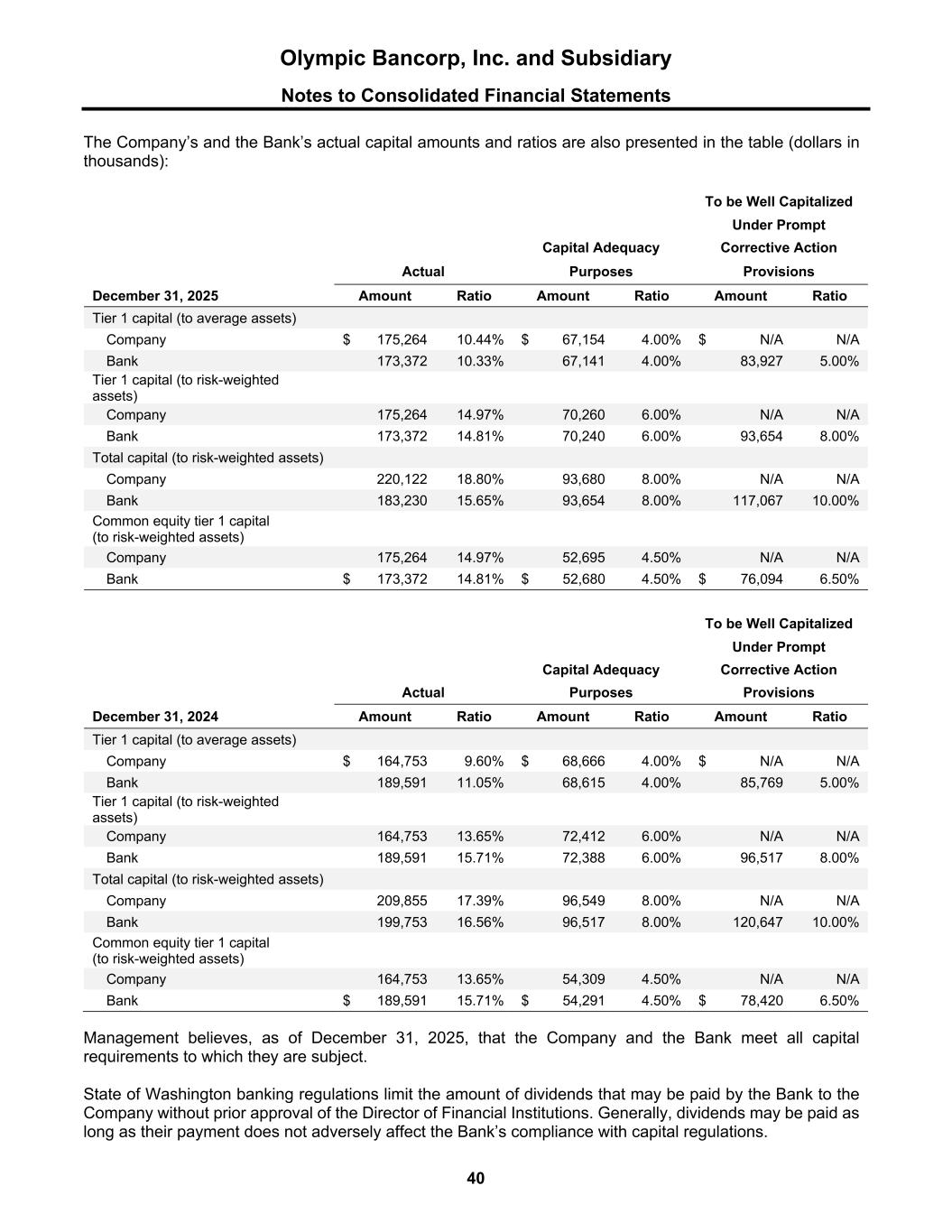 Olympic Bancorp, Inc. and Subsidiary Notes to Consolidated Financial Statements 40 The Company’s and the Bank’s actual capital amounts and ratios are also presented in the table (dollars in thousands): . To be Well Capitalized Under Prompt Capital Adequacy Corrective Action Actual Purposes Provisions December 31, 2025 Amount Ratio Amount Ratio Amount Ratio Tier 1 capital (to average assets) Company $ 175,264 10.44% $ 67,154 4.00% $ N/A N/A Bank 173,372 10.33% 67,141 4.00% 83,927 5.00% Tier 1 capital (to risk-weighted assets) Company 175,264 14.97% 70,260 6.00% N/A N/A Bank 173,372 14.81% 70,240 6.00% 93,654 8.00% Total capital (to risk-weighted assets) Company 220,122 18.80% 93,680 8.00% N/A N/A Bank 183,230 15.65% 93,654 8.00% 117,067 10.00% Common equity tier 1 capital (to risk-weighted assets) Company 175,264 14.97% 52,695 4.50% N/A N/A Bank $ 173,372 14.81% $ 52,680 4.50% $ 76,094 6.50% To be Well Capitalized Under Prompt Capital Adequacy Corrective Action Actual Purposes Provisions December 31, 2024 Amount Ratio Amount Ratio Amount Ratio Tier 1 capital (to average assets) Company $ 164,753 9.60% $ 68,666 4.00% $ N/A N/A Bank 189,591 11.05% 68,615 4.00% 85,769 5.00% Tier 1 capital (to risk-weighted assets) Company 164,753 13.65% 72,412 6.00% N/A N/A Bank 189,591 15.71% 72,388 6.00% 96,517 8.00% Total capital (to risk-weighted assets) Company 209,855 17.39% 96,549 8.00% N/A N/A Bank 199,753 16.56% 96,517 8.00% 120,647 10.00% Common equity tier 1 capital (to risk-weighted assets) Company 164,753 13.65% 54,309 4.50% N/A N/A Bank $ 189,591 15.71% $ 54,291 4.50% $ 78,420 6.50% Management believes, as of December 31, 2025, that the Company and the Bank meet all capital requirements to which they are subject. State of Washington banking regulations limit the amount of dividends that may be paid by the Bank to the Company without prior approval of the Director of Financial Institutions. Generally, dividends may be paid as long as their payment does not adversely affect the Bank’s compliance with capital regulations.