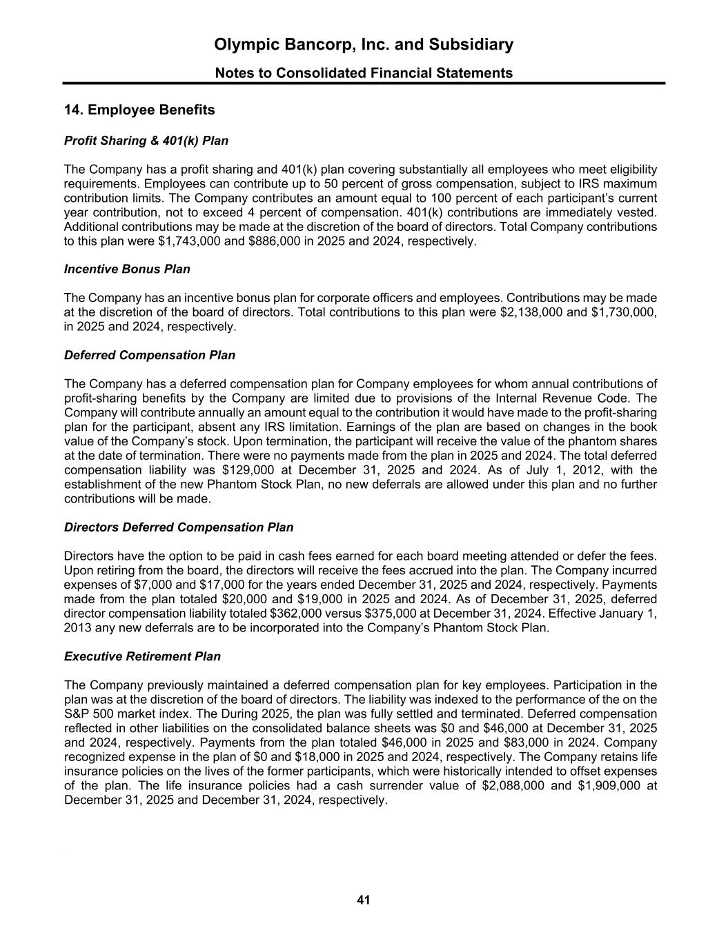 Olympic Bancorp, Inc. and Subsidiary Notes to Consolidated Financial Statements 41 14. Employee Benefits Profit Sharing & 401(k) Plan The Company has a profit sharing and 401(k) plan covering substantially all employees who meet eligibility requirements. Employees can contribute up to 50 percent of gross compensation, subject to IRS maximum contribution limits. The Company contributes an amount equal to 100 percent of each participant’s current year contribution, not to exceed 4 percent of compensation. 401(k) contributions are immediately vested. Additional contributions may be made at the discretion of the board of directors. Total Company contributions to this plan were $1,743,000 and $886,000 in 2025 and 2024, respectively. Incentive Bonus Plan The Company has an incentive bonus plan for corporate officers and employees. Contributions may be made at the discretion of the board of directors. Total contributions to this plan were $2,138,000 and $1,730,000, in 2025 and 2024, respectively. Deferred Compensation Plan The Company has a deferred compensation plan for Company employees for whom annual contributions of profit-sharing benefits by the Company are limited due to provisions of the Internal Revenue Code. The Company will contribute annually an amount equal to the contribution it would have made to the profit-sharing plan for the participant, absent any IRS limitation. Earnings of the plan are based on changes in the book value of the Company’s stock. Upon termination, the participant will receive the value of the phantom shares at the date of termination. There were no payments made from the plan in 2025 and 2024. The total deferred compensation liability was $129,000 at December 31, 2025 and 2024. As of July 1, 2012, with the establishment of the new Phantom Stock Plan, no new deferrals are allowed under this plan and no further contributions will be made. Directors Deferred Compensation Plan Directors have the option to be paid in cash fees earned for each board meeting attended or defer the fees. Upon retiring from the board, the directors will receive the fees accrued into the plan. The Company incurred expenses of $7,000 and $17,000 for the years ended December 31, 2025 and 2024, respectively. Payments made from the plan totaled $20,000 and $19,000 in 2025 and 2024. As of December 31, 2025, deferred director compensation liability totaled $362,000 versus $375,000 at December 31, 2024. Effective January 1, 2013 any new deferrals are to be incorporated into the Company’s Phantom Stock Plan. Executive Retirement Plan The Company previously maintained a deferred compensation plan for key employees. Participation in the plan was at the discretion of the board of directors. The liability was indexed to the performance of the on the S&P 500 market index. The During 2025, the plan was fully settled and terminated. Deferred compensation reflected in other liabilities on the consolidated balance sheets was $0 and $46,000 at December 31, 2025 and 2024, respectively. Payments from the plan totaled $46,000 in 2025 and $83,000 in 2024. Company recognized expense in the plan of $0 and $18,000 in 2025 and 2024, respectively. The Company retains life insurance policies on the lives of the former participants, which were historically intended to offset expenses of the plan. The life insurance policies had a cash surrender value of $2,088,000 and $1,909,000 at December 31, 2025 and December 31, 2024, respectively. ‘