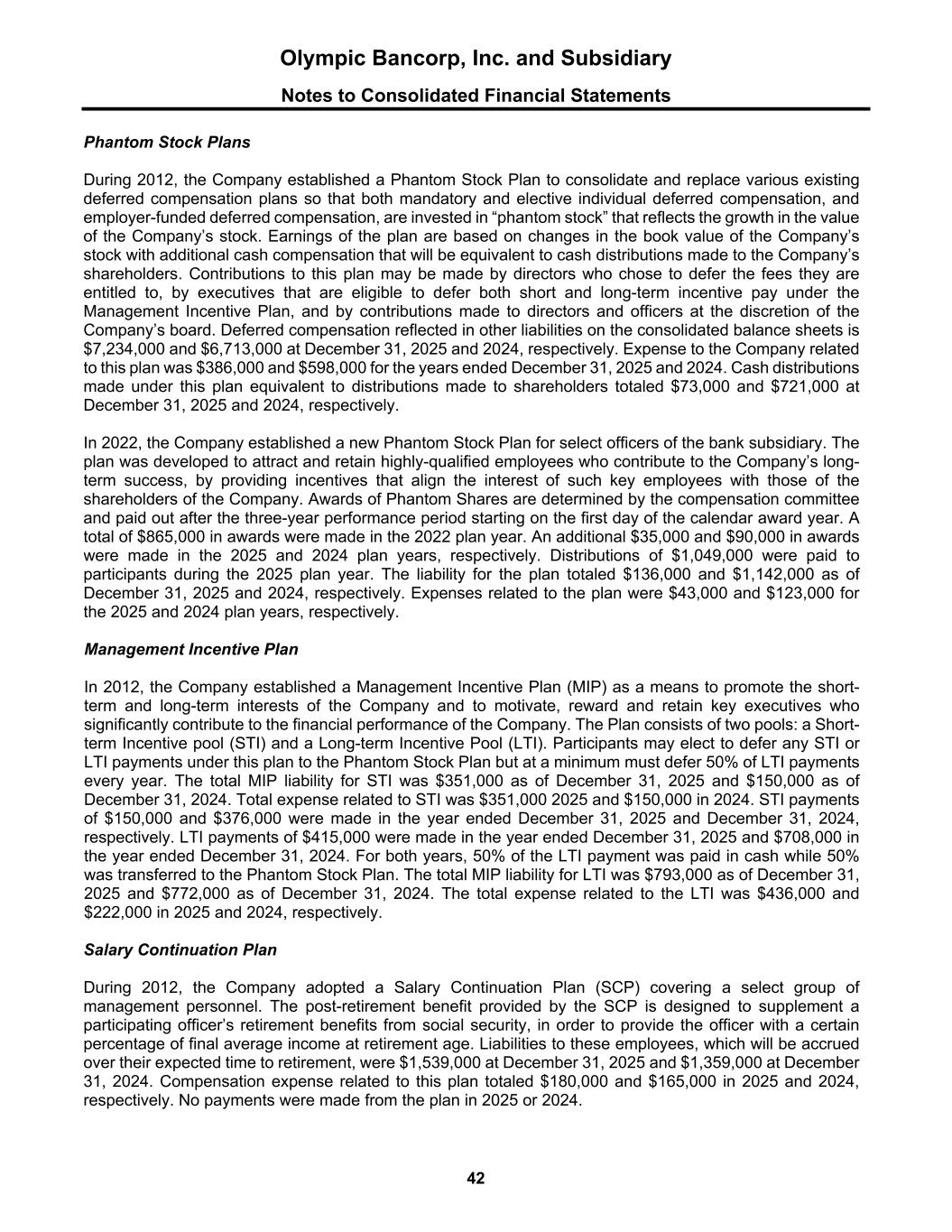 Olympic Bancorp, Inc. and Subsidiary Notes to Consolidated Financial Statements 42 Phantom Stock Plans During 2012, the Company established a Phantom Stock Plan to consolidate and replace various existing deferred compensation plans so that both mandatory and elective individual deferred compensation, and employer-funded deferred compensation, are invested in “phantom stock” that reflects the growth in the value of the Company’s stock. Earnings of the plan are based on changes in the book value of the Company’s stock with additional cash compensation that will be equivalent to cash distributions made to the Company’s shareholders. Contributions to this plan may be made by directors who chose to defer the fees they are entitled to, by executives that are eligible to defer both short and long-term incentive pay under the Management Incentive Plan, and by contributions made to directors and officers at the discretion of the Company’s board. Deferred compensation reflected in other liabilities on the consolidated balance sheets is $7,234,000 and $6,713,000 at December 31, 2025 and 2024, respectively. Expense to the Company related to this plan was $386,000 and $598,000 for the years ended December 31, 2025 and 2024. Cash distributions made under this plan equivalent to distributions made to shareholders totaled $73,000 and $721,000 at December 31, 2025 and 2024, respectively. In 2022, the Company established a new Phantom Stock Plan for select officers of the bank subsidiary. The plan was developed to attract and retain highly-qualified employees who contribute to the Company’s long- term success, by providing incentives that align the interest of such key employees with those of the shareholders of the Company. Awards of Phantom Shares are determined by the compensation committee and paid out after the three-year performance period starting on the first day of the calendar award year. A total of $865,000 in awards were made in the 2022 plan year. An additional $35,000 and $90,000 in awards were made in the 2025 and 2024 plan years, respectively. Distributions of $1,049,000 were paid to participants during the 2025 plan year. The liability for the plan totaled $136,000 and $1,142,000 as of December 31, 2025 and 2024, respectively. Expenses related to the plan were $43,000 and $123,000 for the 2025 and 2024 plan years, respectively. Management Incentive Plan In 2012, the Company established a Management Incentive Plan (MIP) as a means to promote the short- term and long-term interests of the Company and to motivate, reward and retain key executives who significantly contribute to the financial performance of the Company. The Plan consists of two pools: a Short- term Incentive pool (STI) and a Long-term Incentive Pool (LTI). Participants may elect to defer any STI or LTI payments under this plan to the Phantom Stock Plan but at a minimum must defer 50% of LTI payments every year. The total MIP liability for STI was $351,000 as of December 31, 2025 and $150,000 as of December 31, 2024. Total expense related to STI was $351,000 2025 and $150,000 in 2024. STI payments of $150,000 and $376,000 were made in the year ended December 31, 2025 and December 31, 2024, respectively. LTI payments of $415,000 were made in the year ended December 31, 2025 and $708,000 in the year ended December 31, 2024. For both years, 50% of the LTI payment was paid in cash while 50% was transferred to the Phantom Stock Plan. The total MIP liability for LTI was $793,000 as of December 31, 2025 and $772,000 as of December 31, 2024. The total expense related to the LTI was $436,000 and $222,000 in 2025 and 2024, respectively. Salary Continuation Plan During 2012, the Company adopted a Salary Continuation Plan (SCP) covering a select group of management personnel. The post-retirement benefit provided by the SCP is designed to supplement a participating officer’s retirement benefits from social security, in order to provide the officer with a certain percentage of final average income at retirement age. Liabilities to these employees, which will be accrued over their expected time to retirement, were $1,539,000 at December 31, 2025 and $1,359,000 at December 31, 2024. Compensation expense related to this plan totaled $180,000 and $165,000 in 2025 and 2024, respectively. No payments were made from the plan in 2025 or 2024.