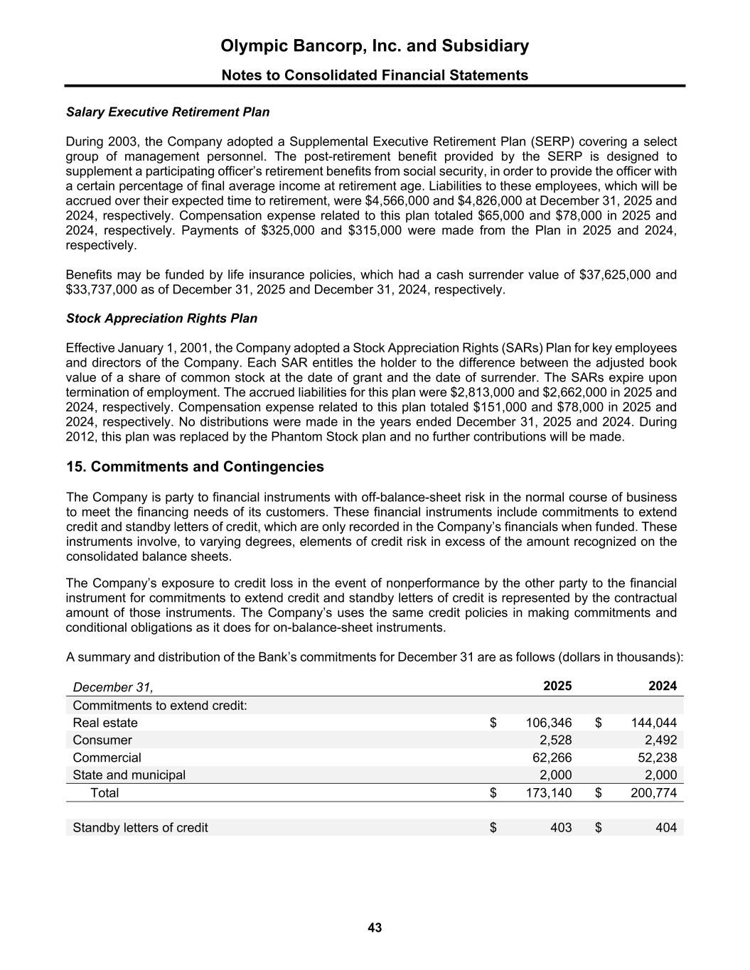 Olympic Bancorp, Inc. and Subsidiary Notes to Consolidated Financial Statements 43 Salary Executive Retirement Plan During 2003, the Company adopted a Supplemental Executive Retirement Plan (SERP) covering a select group of management personnel. The post-retirement benefit provided by the SERP is designed to supplement a participating officer’s retirement benefits from social security, in order to provide the officer with a certain percentage of final average income at retirement age. Liabilities to these employees, which will be accrued over their expected time to retirement, were $4,566,000 and $4,826,000 at December 31, 2025 and 2024, respectively. Compensation expense related to this plan totaled $65,000 and $78,000 in 2025 and 2024, respectively. Payments of $325,000 and $315,000 were made from the Plan in 2025 and 2024, respectively. Benefits may be funded by life insurance policies, which had a cash surrender value of $37,625,000 and $33,737,000 as of December 31, 2025 and December 31, 2024, respectively. Stock Appreciation Rights Plan Effective January 1, 2001, the Company adopted a Stock Appreciation Rights (SARs) Plan for key employees and directors of the Company. Each SAR entitles the holder to the difference between the adjusted book value of a share of common stock at the date of grant and the date of surrender. The SARs expire upon termination of employment. The accrued liabilities for this plan were $2,813,000 and $2,662,000 in 2025 and 2024, respectively. Compensation expense related to this plan totaled $151,000 and $78,000 in 2025 and 2024, respectively. No distributions were made in the years ended December 31, 2025 and 2024. During 2012, this plan was replaced by the Phantom Stock plan and no further contributions will be made. 15. Commitments and Contingencies The Company is party to financial instruments with off-balance-sheet risk in the normal course of business to meet the financing needs of its customers. These financial instruments include commitments to extend credit and standby letters of credit, which are only recorded in the Company’s financials when funded. These instruments involve, to varying degrees, elements of credit risk in excess of the amount recognized on the consolidated balance sheets. The Company’s exposure to credit loss in the event of nonperformance by the other party to the financial instrument for commitments to extend credit and standby letters of credit is represented by the contractual amount of those instruments. The Company’s uses the same credit policies in making commitments and conditional obligations as it does for on-balance-sheet instruments. A summary and distribution of the Bank’s commitments for December 31 are as follows (dollars in thousands): December 31, 2025 2024 Commitments to extend credit: Real estate $ 106,346 $ 144,044 Consumer 2,528 2,492 Commercial 62,266 52,238 State and municipal 2,000 2,000 Total $ 173,140 $ 200,774 Standby letters of credit $ 403 $ 404