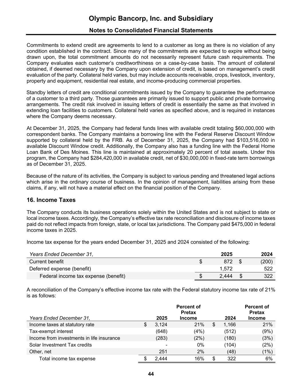 Olympic Bancorp, Inc. and Subsidiary Notes to Consolidated Financial Statements 44 Commitments to extend credit are agreements to lend to a customer as long as there is no violation of any condition established in the contract. Since many of the commitments are expected to expire without being drawn upon, the total commitment amounts do not necessarily represent future cash requirements. The Company evaluates each customer’s creditworthiness on a case-by-case basis. The amount of collateral obtained, if deemed necessary by the Company upon extension of credit, is based on management’s credit evaluation of the party. Collateral held varies, but may include accounts receivable, crops, livestock, inventory, property and equipment, residential real estate, and income-producing commercial properties. Standby letters of credit are conditional commitments issued by the Company to guarantee the performance of a customer to a third party. Those guarantees are primarily issued to support public and private borrowing arrangements. The credit risk involved in issuing letters of credit is essentially the same as that involved in extending loan facilities to customers. Collateral held varies as specified above, and is required in instances where the Company deems necessary. At December 31, 2025, the Company had federal funds lines with available credit totaling $60,000,000 with correspondent banks. The Company maintains a borrowing line with the Federal Reserve Discount Window supported by collateral held by the FRB. As of December 31, 2025, the Company had $103,516,000 in available Discount Window credit. Additionally, the Company also has a funding line with the Federal Home Loan Bank of Des Moines. This line is maintained at approximately 20 percent of total assets. Under this program, the Company had $284,420,000 in available credit, net of $30,000,000 in fixed-rate term borrowings as of December 31, 2025. Because of the nature of its activities, the Company is subject to various pending and threatened legal actions which arise in the ordinary course of business. In the opinion of management, liabilities arising from these claims, if any, will not have a material effect on the financial position of the Company. 16. Income Taxes The Company conducts its business operations solely within the United States and is not subject to state or local income taxes. Accordingly, the Company’s effective tax rate reconciliation and disclosure of income taxes paid do not reflect impacts from foreign, state, or local tax jurisdictions. The Company paid $475,000 in federal income taxes in 2025. Income tax expense for the years ended December 31, 2025 and 2024 consisted of the following: Years Ended December 31, 2025 2024 Current benefit $ 872 $ (200) Deferred expense (benefit) 1,572 522 Federal income tax expense (benefit) $ 2,444 $ 322 A reconciliation of the Company’s effective income tax rate with the Federal statutory income tax rate of 21% is as follows: Years Ended December 31, 2025 Percent of Pretax Income 2024 Percent of Pretax Income Income taxes at statutory rate $ 3,124 21% $ 1,166 21% Tax-exempt interest (648) (4%) (512) (9%) Income from investments in life insurance (283) (2%) (180) (3%) Solar Investment Tax credits - 0% (104) (2%) Other, net 251 2% (48) (1%) Total income tax expense $ 2,444 16% $ 322 6%