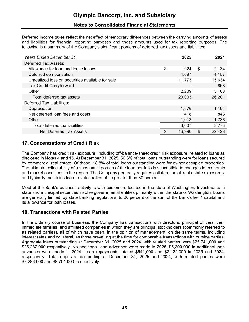 Olympic Bancorp, Inc. and Subsidiary Notes to Consolidated Financial Statements 45 Deferred income taxes reflect the net effect of temporary differences between the carrying amounts of assets and liabilities for financial reporting purposes and those amounts used for tax reporting purposes. The following is a summary of the Company’s significant portions of deferred tax assets and liabilities: Years Ended December 31, 2025 2024 Deferred Tax Assets: Allowance for loan and lease losses $ 1,924 $ 2,134 Deferred compensation 4,097 4,157 Unrealized loss on securities available for sale 11,773 15,634 Tax Credit Carryforward - 868 Other 2,209 3,408 Total deferred tax assets 20,003 26,201 Deferred Tax Liabilities: Depreciation 1,576 1,194 Net deferred loan fees and costs 418 843 Other 1,013 1,736 Total deferred tax liabilities 3,007 3,773 Net Deferred Tax Assets $ 16,996 $ 22,428 17. Concentrations of Credit Risk The Company has credit risk exposure, including off-balance-sheet credit risk exposure, related to loans as disclosed in Notes 4 and 15. At December 31, 2025, 56.6% of total loans outstanding were for loans secured by commercial real estate. Of those, 18.8% of total loans outstanding were for owner occupied properties. The ultimate collectability of a substantial portion of the loan portfolio is susceptible to changes in economic and market conditions in the region. The Company generally requires collateral on all real estate exposures, and typically maintains loan-to-value ratios of no greater than 80 percent. Most of the Bank’s business activity is with customers located in the state of Washington. Investments in state and municipal securities involve governmental entities primarily within the state of Washington. Loans are generally limited, by state banking regulations, to 20 percent of the sum of the Bank’s tier 1 capital and its allowance for loan losses. 18. Transactions with Related Parties In the ordinary course of business, the Company has transactions with directors, principal officers, their immediate families, and affiliated companies in which they are principal stockholders (commonly referred to as related parties), all of which have been, in the opinion of management, on the same terms, including interest rates and collateral, as those prevailing at the time for comparable transactions with outside parties. Aggregate loans outstanding at December 31, 2025 and 2024, with related parties were $25,741,000 and $26,282,000 respectively. No additional loan advances were made in 2025. $5,300,000 in additional loan advances were made in 2024. Loan repayments totaled $541,000 and $2,122,000 in 2025 and 2024, respectively. Total deposits outstanding at December 31, 2025 and 2024, with related parties were $7,286,000 and $8,704,000, respectively.