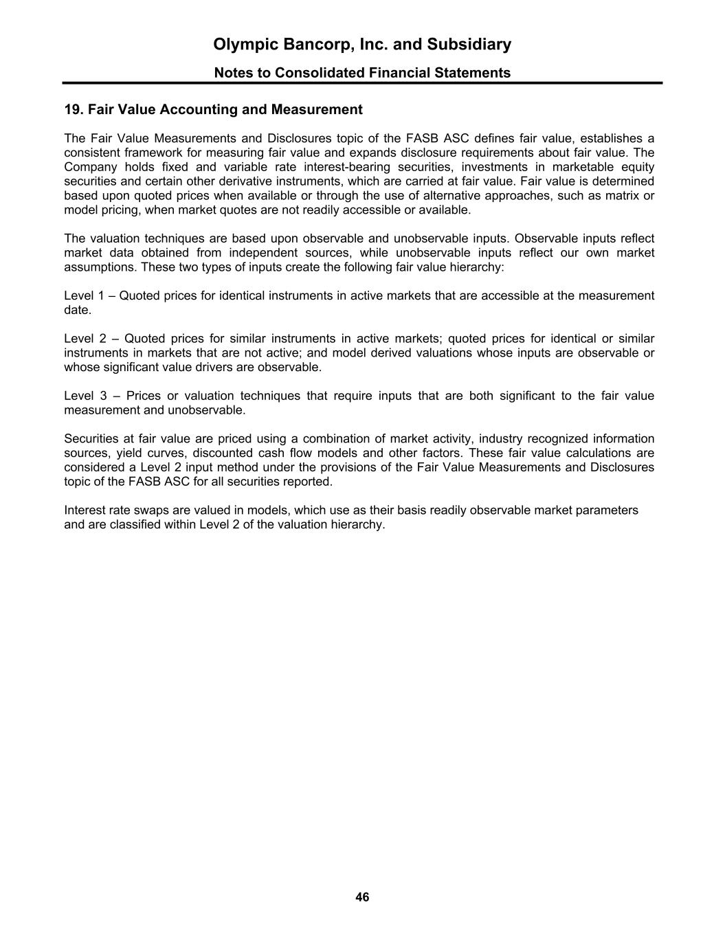 Olympic Bancorp, Inc. and Subsidiary Notes to Consolidated Financial Statements 46 19. Fair Value Accounting and Measurement The Fair Value Measurements and Disclosures topic of the FASB ASC defines fair value, establishes a consistent framework for measuring fair value and expands disclosure requirements about fair value. The Company holds fixed and variable rate interest-bearing securities, investments in marketable equity securities and certain other derivative instruments, which are carried at fair value. Fair value is determined based upon quoted prices when available or through the use of alternative approaches, such as matrix or model pricing, when market quotes are not readily accessible or available. The valuation techniques are based upon observable and unobservable inputs. Observable inputs reflect market data obtained from independent sources, while unobservable inputs reflect our own market assumptions. These two types of inputs create the following fair value hierarchy: Level 1 – Quoted prices for identical instruments in active markets that are accessible at the measurement date. Level 2 – Quoted prices for similar instruments in active markets; quoted prices for identical or similar instruments in markets that are not active; and model derived valuations whose inputs are observable or whose significant value drivers are observable. Level 3 – Prices or valuation techniques that require inputs that are both significant to the fair value measurement and unobservable. Securities at fair value are priced using a combination of market activity, industry recognized information sources, yield curves, discounted cash flow models and other factors. These fair value calculations are considered a Level 2 input method under the provisions of the Fair Value Measurements and Disclosures topic of the FASB ASC for all securities reported. Interest rate swaps are valued in models, which use as their basis readily observable market parameters and are classified within Level 2 of the valuation hierarchy.