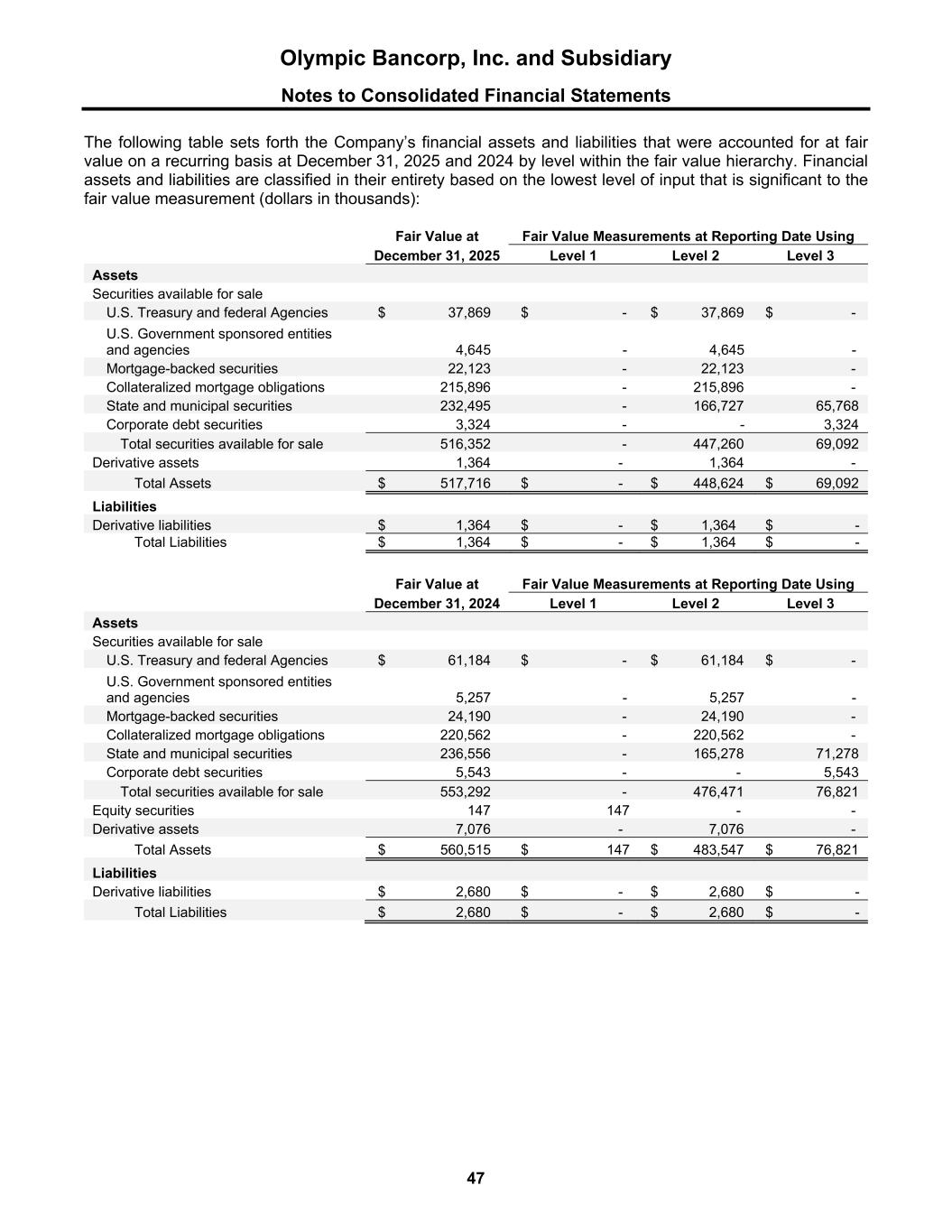 Olympic Bancorp, Inc. and Subsidiary Notes to Consolidated Financial Statements 47 The following table sets forth the Company’s financial assets and liabilities that were accounted for at fair value on a recurring basis at December 31, 2025 and 2024 by level within the fair value hierarchy. Financial assets and liabilities are classified in their entirety based on the lowest level of input that is significant to the fair value measurement (dollars in thousands): Fair Value at Fair Value Measurements at Reporting Date Using December 31, 2025 Level 1 Level 2 Level 3 Assets Securities available for sale U.S. Treasury and federal Agencies $ 37,869 $ - $ 37,869 $ - U.S. Government sponsored entities …and agencies 4,645 - 4,645 - Mortgage-backed securities 22,123 - 22,123 - Collateralized mortgage obligations 215,896 - 215,896 - State and municipal securities 232,495 - 166,727 65,768 Corporate debt securities 3,324 - - 3,324 Total securities available for sale 516,352 - 447,260 69,092 Derivative assets 1,364 - 1,364 - Total Assets $ 517,716 $ - $ 448,624 $ 69,092 Liabilities Derivative liabilities $ 1,364 $ - $ 1,364 $ - Total Liabilities $ 1,364 $ - $ 1,364 $ - Fair Value at Fair Value Measurements at Reporting Date Using December 31, 2024 Level 1 Level 2 Level 3 Assets Securities available for sale U.S. Treasury and federal Agencies $ 61,184 $ - $ 61,184 $ - U.S. Government sponsored entities …and agencies 5,257 - 5,257 - Mortgage-backed securities 24,190 - 24,190 - Collateralized mortgage obligations 220,562 - 220,562 - State and municipal securities 236,556 - 165,278 71,278 Corporate debt securities 5,543 - - 5,543 Total securities available for sale 553,292 - 476,471 76,821 Equity securities 147 147 - - Derivative assets 7,076 - 7,076 - Total Assets $ 560,515 $ 147 $ 483,547 $ 76,821 Liabilities Derivative liabilities $ 2,680 $ - $ 2,680 $ - Total Liabilities $ 2,680 $ - $ 2,680 $ -