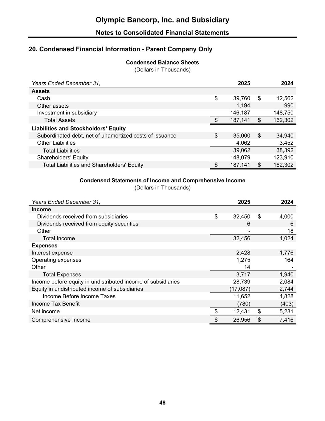 Olympic Bancorp, Inc. and Subsidiary Notes to Consolidated Financial Statements 48 20. Condensed Financial Information - Parent Company Only Condensed Balance Sheets (Dollars in Thousands) Years Ended December 31, 2025 2024 Assets Cash $ 39,760 $ 12,562 Other assets 1,194 990 Investment in subsidiary 146,187 148,750 Total Assets $ 187,141 $ 162,302 Liabilities and Stockholders’ Equity Subordinated debt, net of unamortized costs of issuance $ 35,000 $ 34,940 Other Liabilities 4,062 3,452 Total Liabilities 39,062 38,392 Shareholders' Equity 148,079 123,910 Total Liabilities and Shareholders' Equity $ 187,141 $ 162,302 Condensed Statements of Income and Comprehensive Income (Dollars in Thousands) Years Ended December 31, 2025 2024 Income Dividends received from subsidiaries $ 32,450 $ 4,000 Dividends received from equity securities 6 6 Other - 18 Total Income 32,456 4,024 Expenses Interest expense 2,428 1,776 Operating expenses 1,275 164 Other 14 - Total Expenses 3,717 1,940 Income before equity in undistributed income of subsidiaries 28,739 2,084 Equity in undistributed income of subsidiaries (17,087) 2,744 Income Before Income Taxes 11,652 4,828 Income Tax Benefit (780) (403) Net income $ 12,431 $ 5,231 Comprehensive Income $ 26,956 $ 7,416