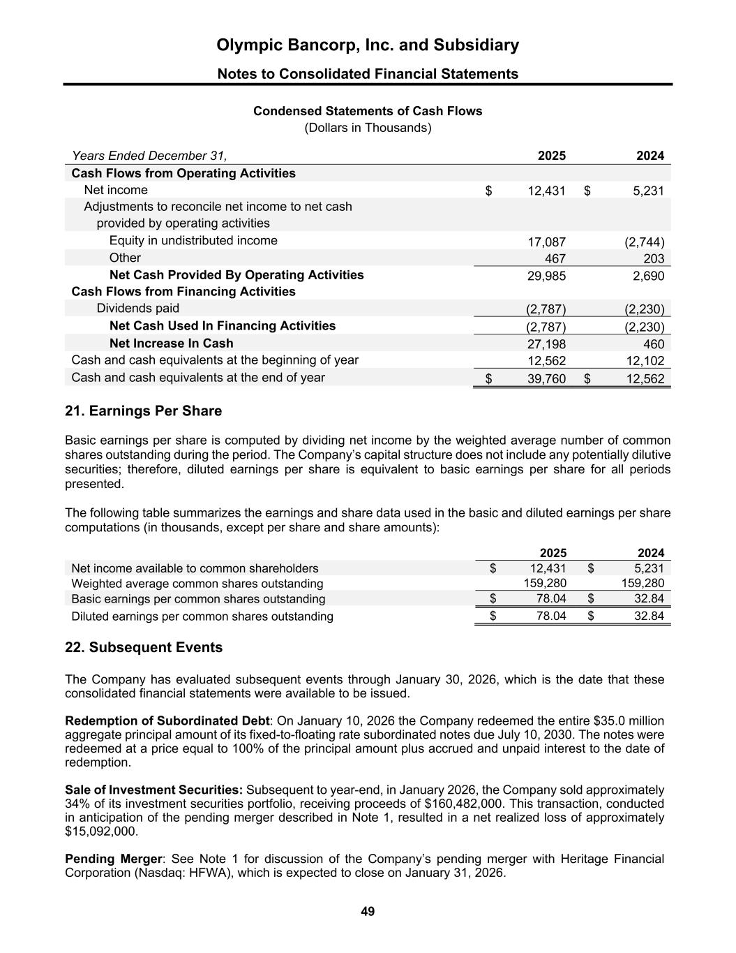 Olympic Bancorp, Inc. and Subsidiary Notes to Consolidated Financial Statements 49 Condensed Statements of Cash Flows (Dollars in Thousands) Years Ended December 31, 2025 2024 Cash Flows from Operating Activities Net income $ 12,431 $ 5,231 Adjustments to reconcile net income to net cash provided by operating activities Equity in undistributed income 17,087 (2,744) Other 467 203 Net Cash Provided By Operating Activities 29,985 2,690 Cash Flows from Financing Activities Dividends paid (2,787) (2,230) Net Cash Used In Financing Activities (2,787) (2,230) Net Increase In Cash 27,198 460 Cash and cash equivalents at the beginning of year 12,562 12,102 Cash and cash equivalents at the end of year $ 39,760 $ 12,562 21. Earnings Per Share Basic earnings per share is computed by dividing net income by the weighted average number of common shares outstanding during the period. The Company’s capital structure does not include any potentially dilutive securities; therefore, diluted earnings per share is equivalent to basic earnings per share for all periods presented. The following table summarizes the earnings and share data used in the basic and diluted earnings per share computations (in thousands, except per share and share amounts): 2025 2024 Net income available to common shareholders $ 12,431 $ 5,231 Weighted average common shares outstanding 159,280 159,280 Basic earnings per common shares outstanding $ 78.04 $ 32.84 Diluted earnings per common shares outstanding $ 78.04 $ 32.84 22. Subsequent Events The Company has evaluated subsequent events through January 30, 2026, which is the date that these consolidated financial statements were available to be issued. Redemption of Subordinated Debt: On January 10, 2026 the Company redeemed the entire $35.0 million aggregate principal amount of its fixed-to-floating rate subordinated notes due July 10, 2030. The notes were redeemed at a price equal to 100% of the principal amount plus accrued and unpaid interest to the date of redemption. Sale of Investment Securities: Subsequent to year-end, in January 2026, the Company sold approximately 34% of its investment securities portfolio, receiving proceeds of $160,482,000. This transaction, conducted in anticipation of the pending merger described in Note 1, resulted in a net realized loss of approximately $15,092,000. Pending Merger: See Note 1 for discussion of the Company’s pending merger with Heritage Financial Corporation (Nasdaq: HFWA), which is expected to close on January 31, 2026.
