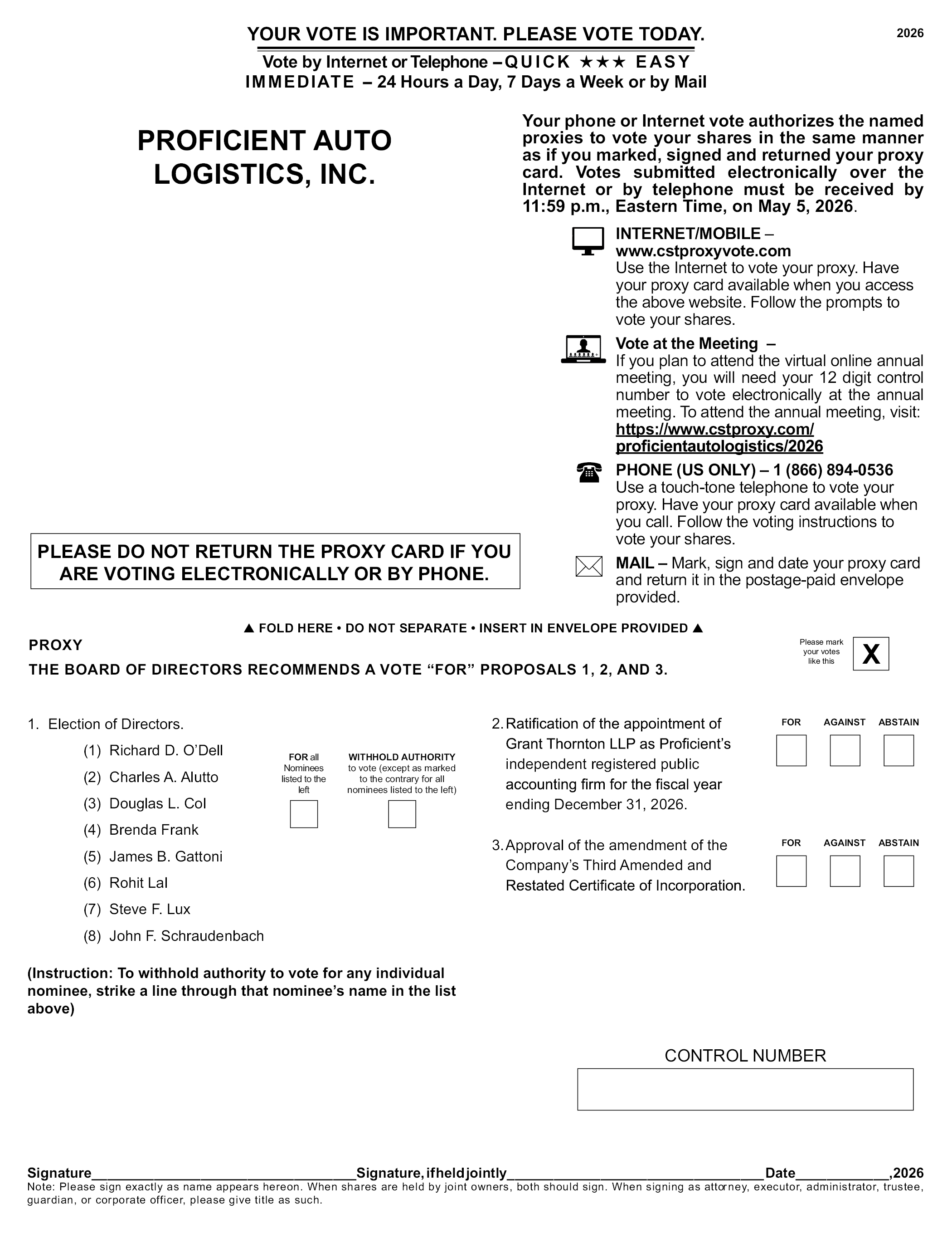 ■ Attend the virtual Annual Meeting and vote during the meeting at https://www.cstproxy.com/proficientautologistics/2026.