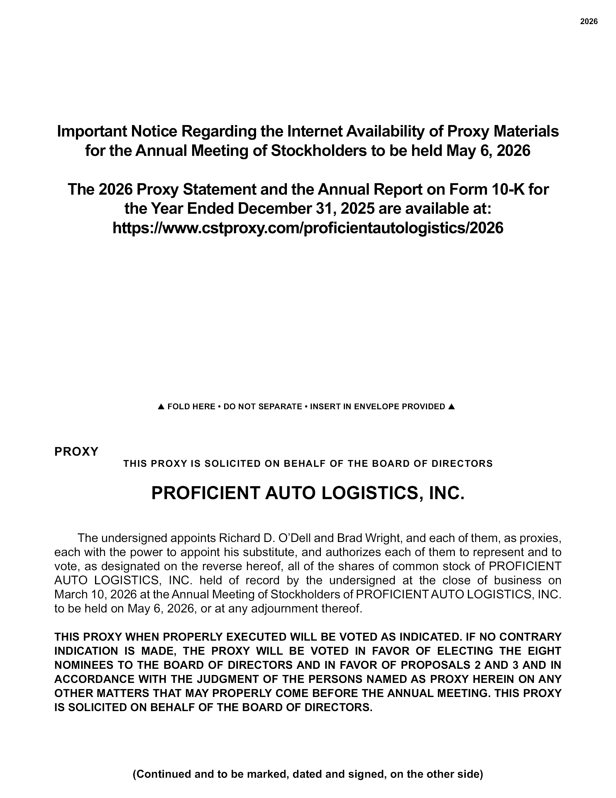 2026 Important Notice Regarding the Internet Availability of Proxy Materials for the Annual Meeting of Stockholders to be held May 6, 2026 The 2026 Proxy Statement and the Annual Report on Form 10-K for the Year Ended December 31, 2025 are available at: https://www.cstproxy.com/proficientautologistics/2026 FOLD HERE • DO NOT SEPARATE • INSERT IN ENVELOPE PROVIDED PROXY THIS PROXY IS SOLICITED ON BEHALF OF THE BOARD OF DIRECTORS PROFICIENT AUTO LOGISTICS, INC. The undersigned appoints Richard D. O’Dell and Brad Wright, and each of them, as proxies, each with the power to appoint his substitute, and authorizes each of them to represent and to vote, as designated on the reverse hereof, all of the shares of common stock of PROFICIENT AUTO LOGISTICS, INC. held of record by the undersigned at the close of business on March 10, 2026 at the Annual Meeting of Stockholders of PROFICIENT AUTO LOGISTICS, INC. to be held on May 6, 2026, or at any adjournment thereof. THIS PROXY WHEN PROPERLY EXECUTED WILL BE VOTED AS INDICATED. IF NO CONTRARY INDICATION IS MADE, THE PROXY WILL BE VOTED IN FAVOR OF ELECTING THE EIGHT NOMINEES TO THE BOARD OF DIRECTORS AND IN FAVOR OF PROPOSALS 2 AND 3 AND IN ACCORDANCE WITH THE JUDGMENT OF THE PERSONS NAMED AS PROXY HEREIN ON ANY OTHER MATTERS THAT MAY PROPERLY COME BEFORE THE ANNUAL MEETING. THIS PROXY IS SOLICITED ON BEHALF OF THE BOARD OF DIRECTORS. (Continued and to be marked, dated and signed, on the other side)
