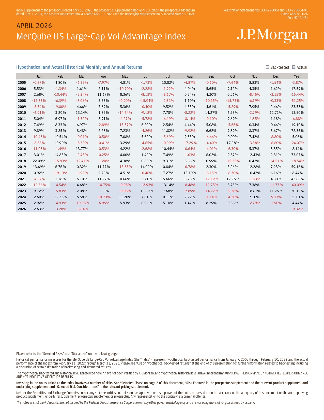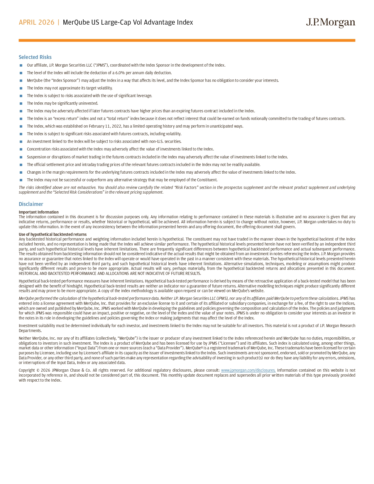 APRIL 2026 | MerQube US Large - Cap Vol Advantage Index Selected Risks Our affiliate, J.P. Morgan Securities LLC (“JPMS”), coordinated with the Index Sponsor in the development of the Index. The level of the Index will include the deduction of a 6.0% per annum daily deduction. MerQube (the “Index Sponsor”) may adjust the Index in a way that atfects its level, and the Index Sponsor has no obligation to consider your interests. The Index may not approximate its target volatility. The Index is subject to risks associated with the use of significant leverage. The Index may be significantly uninvested. The Index may be adversely atfected if later futures contracts have higher prices than an expiring futures contract included in the Index. The Index is an “excess return” index and not a “total return” index because it does not reflect interest that could be earned on funds notionally committed to the trading of futures contracts. The Index, which was established on February 11, 2022, has a limited operating history and may perform in unanticipated ways. The Index is subject to significant risks associated with futures contracts, including volatility. An investment linked to the Index will be subject to risks associated with non - U.S. securities. Concentration risks associated with the Index may adversely atfect the value of investments linked to the Index. Suspension or disruptions of market trading in the futures contracts included in the Index may adversely atfect the value of investments linked to the Index. The official settlement price and intraday trading prices of the relevant futures contracts included in the Index may not be readily available. Changes in the margin requirements for the underlying futures contracts included in the Index may adversely atfect the value of investments linked to the Index. The Index may not be successful or outperform any alternative strategy that may be employed of the Constituent. The risks identified above are not exhaustive. You should also review carefully the related “Risk Factors” section in the prospectus supplement and the relevant product supplement and underlying supplement and the “Selected Risk Considerations” in the relevant pricing supplement. Disclaimer Important Information The information contained in this document is for discussion purposes only . Any information relating to performance contained in these materials is illustrative and no assurance is given that any indicative returns, performance or results, whether historical or hypothetical, will be achieved . All information herein is subject to change without notice, however, J . P . Morgan undertakes no duty to update this information . In the event of any inconsistency between the information presented herein and any otfering document, the otfering document shall govern . Use of hypothetical backtested returns Any backtested historical performance and weighting information included herein is hypothetical . The constituent may not have traded in the manner shown in the hypothetical backtest of the Index included herein, and no representation is being made that the Index will achieve similar performance . The hypothetical historical levels presented herein have not been verified by an independent third party, and such hypothetical historical levels have inherent limitations . There are frequently significant ditferences between hypothetical backtested performance and actual subsequent performance . The results obtained from backtesting information should not be considered indicative of the actual results that might be obtained from an investment in notes referencing the Index . J . P . Morgan provides no assurance or guarantee that notes linked to the Index will operate or would have operated in the past in a manner consistent with these materials . The hypothetical historical levels presented herein have not been verified by an independent third party, and such hypothetical historical levels have inherent limitations . Alternative simulations, techniques, modeling or assumptions might produce significantly ditferent results and prove to be more appropriate . Actual results will vary, perhaps materially, from the hypothetical backtested returns and allocations presented in this document . HISTORICAL AND BACKTESTED PERFORMANCE AND ALLOCATIONS ARE NOT INDICATIVE OF FUTURE RESULTS . Hypothetical back - tested performance measures have inherent limitations . Hypothetical back - tested performance is derived by means of the retroactive application of a back - tested model that has been designed with the benefit of hindsight . Hypothetical back - tested results are neither an indicator nor a guarantee of future returns . Alternative modelling techniques might produce significantly ditferent results and may prove to be more appropriate . A copy of the index methodology is available upon request or can be viewed on MerQube’s website . MerQube performed the calculation of the hypothetical back - tested performance data . Neither J . P . Morgan Securities LLC (JPMS), nor any of its affiliates paid MerQube to perform these calculations . JPMS has entered into a license agreement with MerQube, Inc . that provides for an exclusive license to it and certain of its affiliated or subsidiary companies, in exchange for a fee, of the right to use the Indices, which are owned and published by MerQube, Inc . JPMS worked with MerQube in developing the guidelines and policies governing the composition and calculation of the Index . The policies and judgments for which JPMS was responsible could have an impact, positive or negative, on the level of the Index and the value of your notes . JPMS is under no obligation to consider your interests as an investor in the notes in its role in developing the guidelines and policies governing the Index or making judgments that may atfect the level of the Index . Investment suitability must be determined individually for each investor, and in