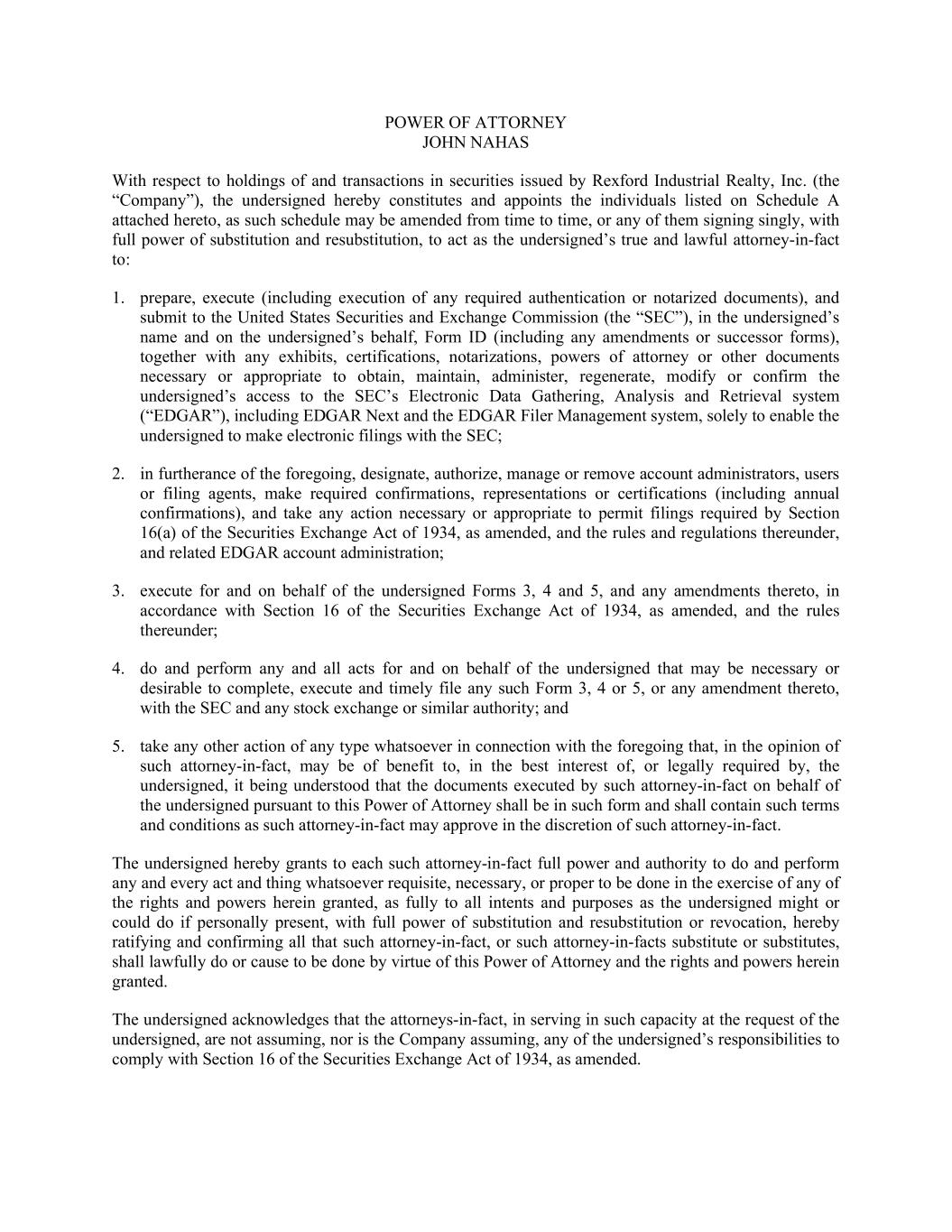 POWER OF ATTORNEY JOHN NAHAS With respect to holdings of and transactions in securities issued by Rexford Industrial Realty, Inc. (the “Company”), the undersigned hereby constitutes and appoints the individuals listed on Schedule A attached hereto, as such schedule may be amended from time to time, or any of them signing singly, with full power of substitution and resubstitution, to act as the undersigned’s true and lawful attorney-in-fact to: 1. prepare, execute (including execution of any required authentication or notarized documents), and submit to the United States Securities and Exchange Commission (the “SEC”), in the undersigned’s name and on the undersigned’s behalf, Form ID (including any amendments or successor forms), together with any exhibits, certifications, notarizations, powers of attorney or other documents necessary or appropriate to obtain, maintain, administer, regenerate, modify or confirm the undersigned’s access to the SEC’s Electronic Data Gathering, Analysis and Retrieval system (“EDGAR”), including EDGAR Next and the EDGAR Filer Management system, solely to enable the undersigned to make electronic filings with the SEC; 2. in furtherance of the foregoing, designate, authorize, manage or remove account administrators, users or filing agents, make required confirmations, representations or certifications (including annual confirmations), and take any action necessary or appropriate to permit filings required by Section 16(a) of the Securities Exchange Act of 1934, as amended, and the rules and regulations thereunder, and related EDGAR account administration; 3. execute for and on behalf of the undersigned Forms 3, 4 and 5, and any amendments thereto, in accordance with Section 16 of the Securities Exchange Act of 1934, as amended, and the rules thereunder; 4. do and perform any and all acts for and on behalf of the undersigned that may be necessary or desirable to complete, execute and timely file any such Form 3, 4 or 5, or any amendment thereto, with the SEC and any stock exchange or similar authority; and 5. take any other action of any type whatsoever in connection with the foregoing that, in the opinion of such attorney-in-fact, may be of benefit to, in the best interest of, or legally required by, the undersigned, it being understood that the documents executed by such attorney-in-fact on behalf of the undersigned pursuant to this Power of Attorney shall be in such form and shall contain such terms and conditions as such attorney-in-fact may approve in the discretion of such attorney-in-fact. The undersigned hereby grants to each such attorney-in-fact full power and authority to do and perform any and every act and thing whatsoever requisite, necessary, or proper to be done in the exercise of any of the rights and powers herein granted, as fully to all intents and purposes as the undersigned might or could do if personally present, with full power of substitution and resubstitution or revocation, hereby ratifying and confirming all that such attorney-in-fact, or such attorney-in-facts substitute or substitutes, shall lawfully do or cause to be done by virtue of this Power of Attorney and the rights and powers herein granted. The undersigned acknowledges that the attorneys-in-fact, in serving in such capacity at the request of the undersigned, are not assuming, nor is the Company assuming, any of the undersigned’s responsibilities to comply with Section 16 of the Securities Exchange Act of 1934, as amended.