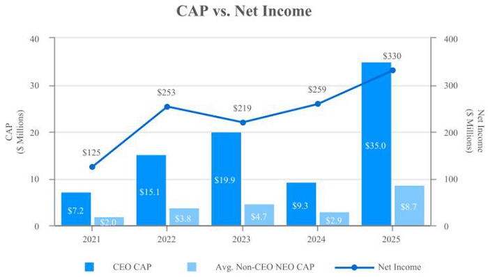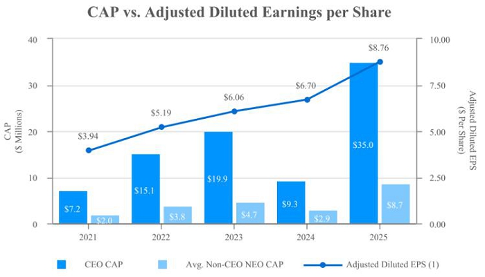 | | | | | | | | | Average | | | | | | | | | | | | | | | | | | | | | | | | | | Summary | | | Average | | | | | | | | | | | | | | | | | | | | | | | Compen- | | | Compen- | | | | | | | | | | | | | | | | | | | | | | | sation | | | sation | | | | | | | | | | | | | | | | | Summary | | | | | | Table | | | Actually | | | Value of Initial Fixed $100 | | | | | | | | | | | Compen- | | | Compen- | | | Total for | | | Paid to | | | Investment Based On: | | | | | | | | | | | sation | | | sation | | | Non-PEO | | | Non-PEO | | | | | | Peer Group | | | | | | Adjusted | | | | | Table | | | Actually | | | Named | | | Named | | | Total | | | Total | | | | | | Diluted | | | | | Total for | | | Paid to | | | Executive | | | Executive | | | Shareholder | | | Shareholder | | | | | | Earnings | | | | | PEO (1) | | | PEO (2) | | | Officers (3) | | | Officers (2) | | | Return (4) | | | Return (4) | | | Net Income | | | Per Share (5) | | | Year | | ($) | | | ($) | | | ($) | | | ($) | | | ($) | | | ($) | | | ($) | | | ($) | | | 2025 | | | 15,658,761 | | | | 34,997,098 | | | | 4,360,492 | | | | 8,722,755 | | | | 244.03 | | | | 187.09 | | | | 330,375,000 | | | | 8.76 | | | 2024 | | | 12,069,657 | | | | 9,287,053 | | | | 3,579,331 | | | | 2,882,113 | | | | 156.75 | | | | 173.60 | | | | 258,815,000 | | | | 6.70 | | | 2023 | | | 12,256,895 | | | | 19,930,731 | | | | 3,574,925 | | | | 4,683,793 | | | | 161.92 | | | | 138.66 | | | | 219,301,000 | | | | 6.06 | | | 2022 | | | 9,836,835 | | | | 15,114,505 | | | | 2,834,198 | | | | 3,793,799 | | | | 128.06 | | | | 128.33 | | | | 253,495,000 | | | | 5.19 | | | 2021 | | | 7,175,467 | | | | 7,215,249 | | | | 2,014,574 | | | | 1,972,295 | | | | 108.50 | | | | 132.95 | | | | 124,909,000 | | | | 3.94 | |