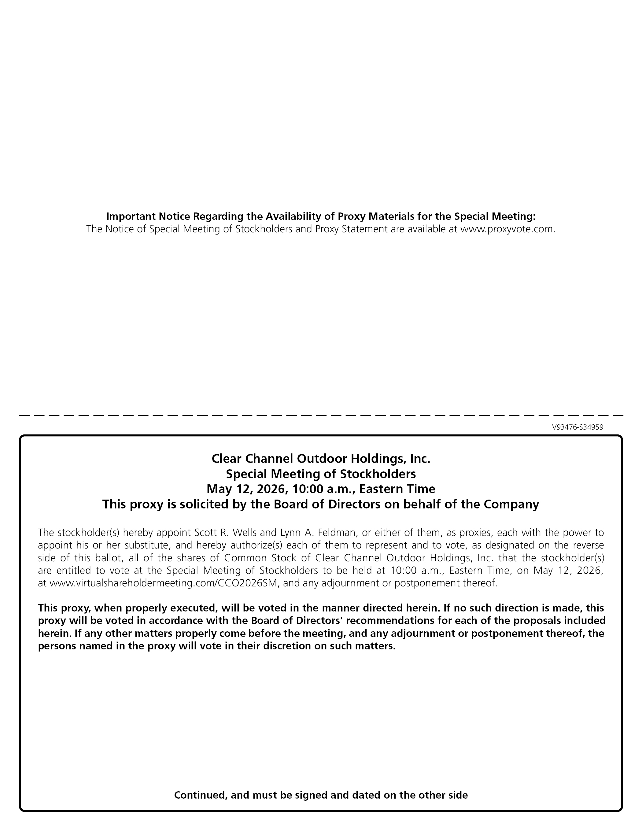Important Notice Regarding the Availability of Proxy Materials for the Special Meeting: The Notice of Special Meeting of Stockholders and Proxy Statement are available at www.proxyvote.com. V93476-S34959 Clear Channel Outdoor Holdings, Inc. Special Meeting of Stockholders May 12, 2026, 10:00 a.m., Eastern Time This proxy is solicited by the Board of Directors on behalf of the Company The stockholder(s) hereby appoint Scott R. Wells and Lynn A. Feldman, or either of them, as proxies, each with the power to appoint his or her substitute, and hereby authorize(s) each of them to represent and to vote, as designated on the reverse side of this ballot, all of the shares of Common Stock of Clear Channel Outdoor Holdings, Inc. that the stockholder(s) are entitled to vote at the Special Meeting of Stockholders to be held at 10:00 a.m., Eastern Time, on May 12, 2026,at www.virtualshareholdermeeting.com/CCO2026SM, and any adjournment or postponement thereof. This proxy, when properly executed, will be voted in the manner directed herein. If no such direction is made, this proxy will be voted in accordance with the Board of Directors’ recommendations for each of the proposals included herein. If any other matters properly come before the meeting, and any adjournment or postponement thereof, the persons named in the proxy will vote in their discretion on such matters. Continued, and must be signed and dated on the other side