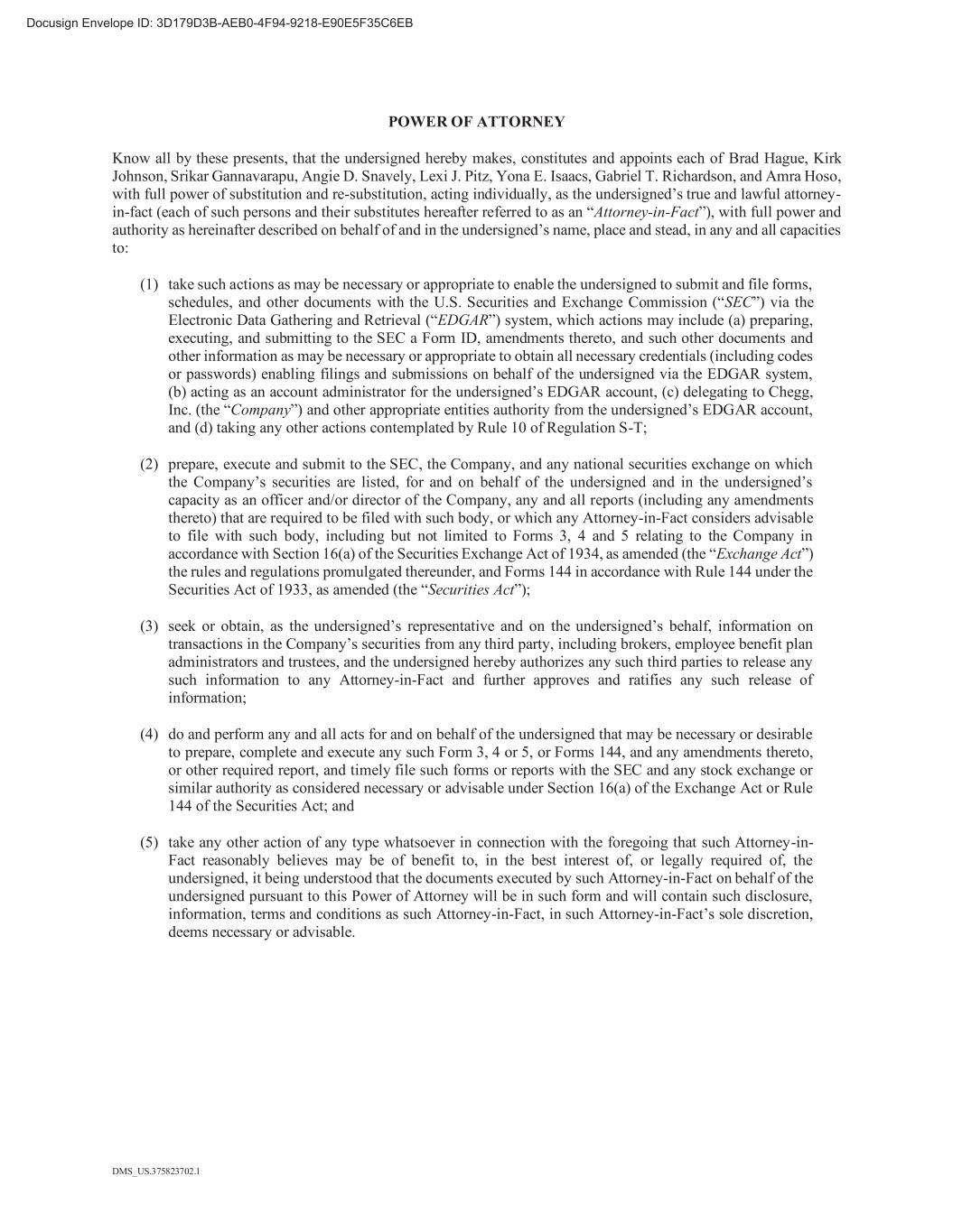 DMS_US.375823702.1 POWER OF ATTORNEY Know all by these presents, that the undersigned hereby makes, constitutes and appoints each of Brad Hague, Kirk Johnson, Srikar Gannavarapu, Angie D. Snavely, Lexi J. Pitz, Yona E. Isaacs, Gabriel T. Richardson, and Amra Hoso, with full power of substitution and re-substitution, acting individually, as the undersigned’s true and lawful attorney- in-fact (each of such persons and their substitutes hereafter referred to as an “Attorney-in-Fact”), with full power and authority as hereinafter described on behalf of and in the undersigned’s name, place and stead, in any and all capacities to: (1) take such actions as may be necessary or appropriate to enable the undersigned to submit and file forms, schedules, and other documents with the U.S. Securities and Exchange Commission (“SEC”) via the Electronic Data Gathering and Retrieval (“EDGAR”) system, which actions may include (a) preparing, executing, and submitting to the SEC a Form ID, amendments thereto, and such other documents and other information as may be necessary or appropriate to obtain all necessary credentials (including codes or passwords) enabling filings and submissions on behalf of the undersigned via the EDGAR system, (b) acting as an account administrator for the undersigned’s EDGAR account, (c) delegating to Chegg, Inc. (the “Company”) and other appropriate entities authority from the undersigned’s EDGAR account, and (d) taking any other actions contemplated by Rule 10 of Regulation S-T; (2) prepare, execute and submit to the SEC, the Company, and any national securities exchange on which the Company’s securities are listed, for and on behalf of the undersigned and in the undersigned’s capacity as an officer and/or director of the Company, any and all reports (including any amendments thereto) that are required to be filed with such body, or which any Attorney-in-Fact considers advisable to file with such body, including but not limited to Forms 3, 4 and 5 relating to the Company in accordance with Section 16(a) of the Securities Exchange Act of 1934, as amended (the “Exchange Act”) the rules and regulations promulgated thereunder, and Forms 144 in accordance with Rule 144 under the Securities Act of 1933, as amended (the “Securities Act”); (3) seek or obtain, as the undersigned’s representative and on the undersigned’s behalf, information on transactions in the Company’s securities from any third party, including brokers, employee benefit plan administrators and trustees, and the undersigned hereby authorizes any such third parties to release any such information to any Attorney-in-Fact and further approves and ratifies any such release of information; (4) do and perform any and all acts for and on behalf of the undersigned that may be necessary or desirable to prepare, complete and execute any such Form 3, 4 or 5, or Forms 144, and any amendments thereto, or other required report, and timely file such forms or reports with the SEC and any stock exchange or similar authority as considered necessary or advisable under Section 16(a) of the Exchange Act or Rule 144 of the Securities Act; and (5) take any other action of any type whatsoever in connection with the foregoing that such Attorney-in- Fact reasonably believes may be of benefit to, in the best interest of, or legally required of, the undersigned, it being understood that the documents executed by such Attorney-in-Fact on behalf of the undersigned pursuant to this Power of Attorney will be in such form and will contain such disclosure, information, terms and conditions as such Attorney-in-Fact, in such Attorney-in-Fact’s sole discretion, deems necessary or advisable.