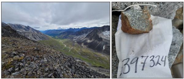 Figure 2. Portage Pass Valley looking East and Sample E397324 – 9.6 g/t Au