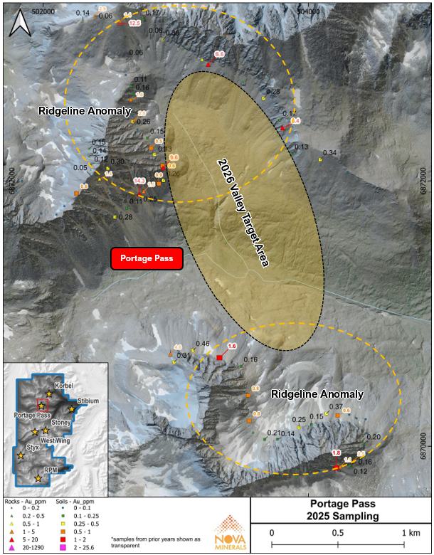 | ● | Potentially significant new gold anomaly defined at Portage Pass from field observations and 2025 surface assays (Figure 3). |