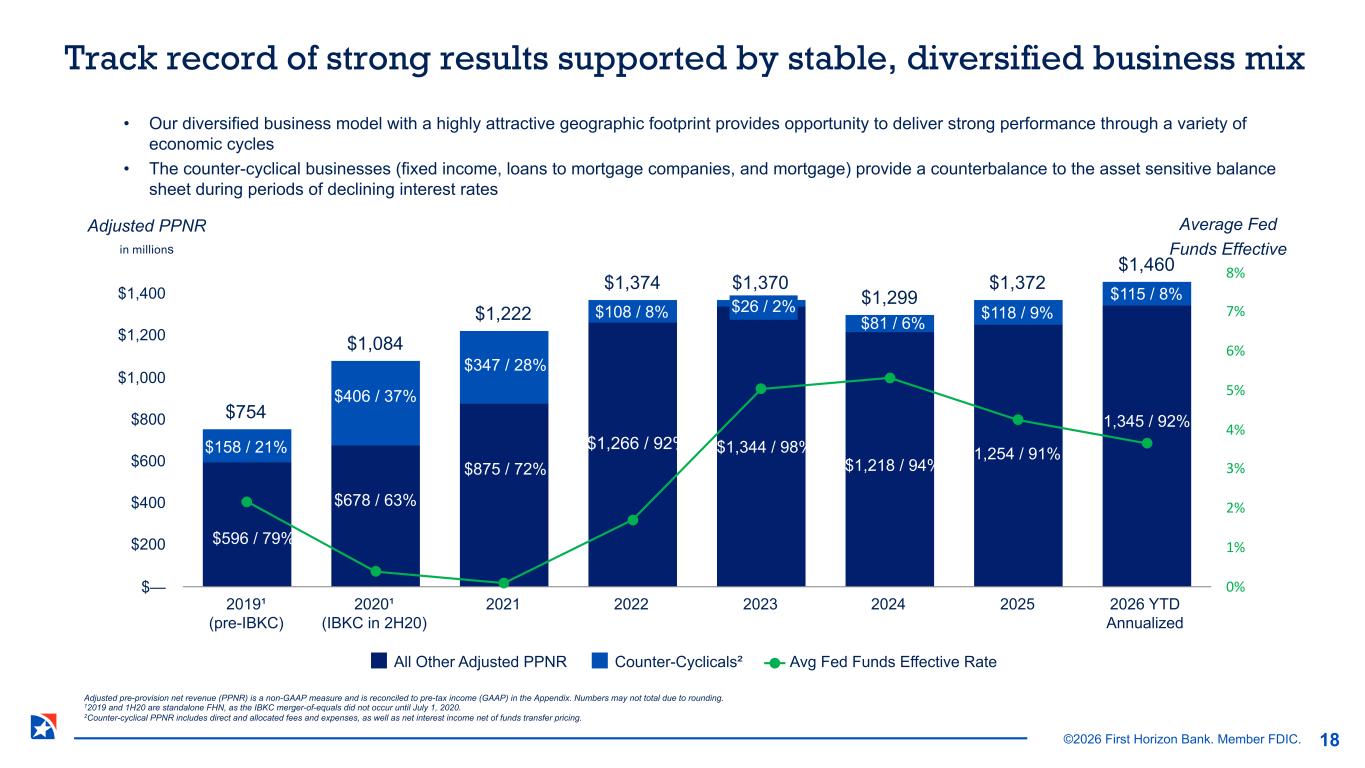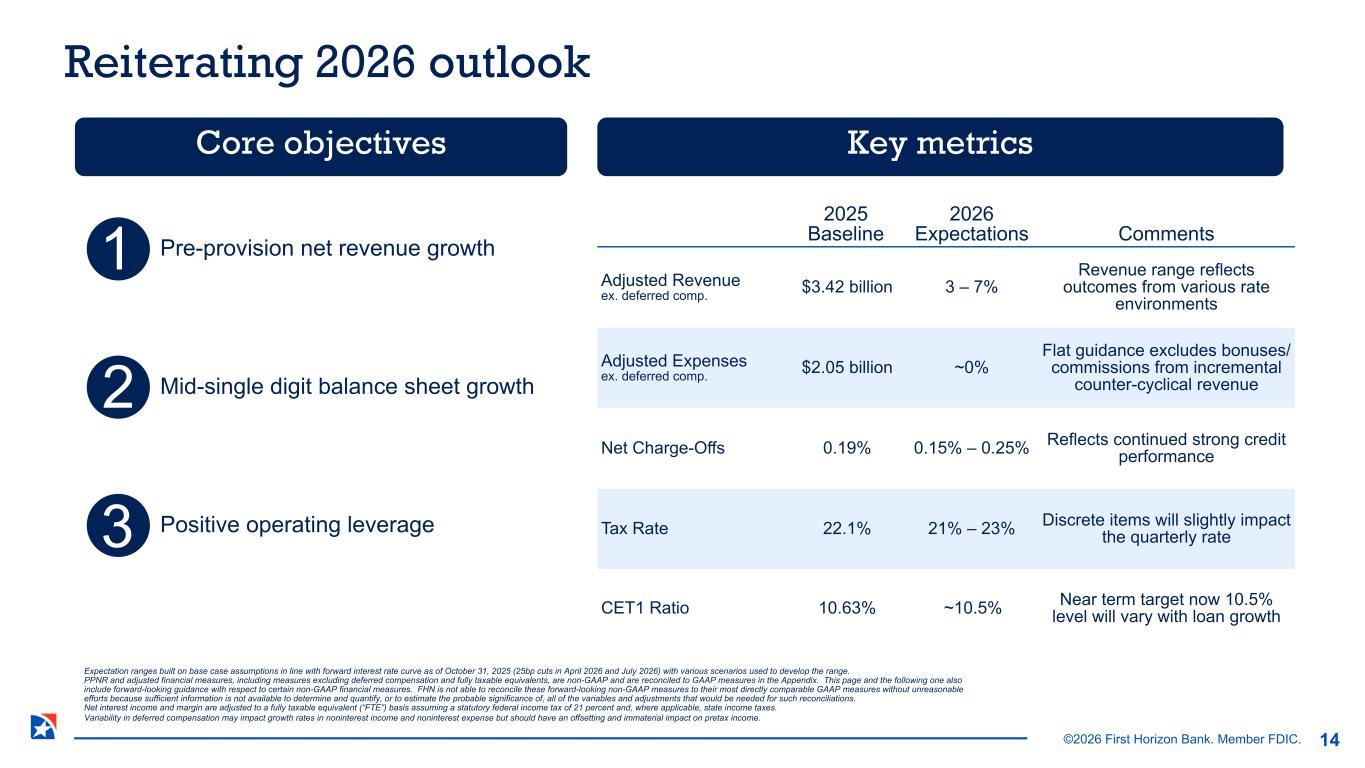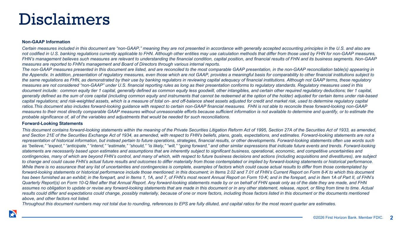 ©2026 First Horizon Bank. Member FDIC. Non-GAAP Information Certain measures included in this document are “non-GAAP,” meaning they are not presented in accordance with generally accepted accounting principles in the U.S. and also are not codified in U.S. banking regulations currently applicable to FHN. Although other entities may use calculation methods that differ from those used by FHN for non-GAAP measures, FHN’s management believes such measures are relevant to understanding the financial condition, capital position, and financial results of FHN and its business segments. Non-GAAP measures are reported to FHN's management and Board of Directors through various internal reports. The non-GAAP measures presented in this document are listed, and are reconciled to the most comparable GAAP presentation, in the non-GAAP reconciliation table(s) appearing in the Appendix. In addition, presentation of regulatory measures, even those which are not GAAP, provides a meaningful basis for comparability to other financial institutions subject to the same regulations as FHN, as demonstrated by their use by banking regulators in reviewing capital adequacy of financial institutions. Although not GAAP terms, these regulatory measures are not considered “non-GAAP” under U.S. financial reporting rules as long as their presentation conforms to regulatory standards. Regulatory measures used in this document include: common equity tier 1 capital, generally defined as common equity less goodwill, other intangibles, and certain other required regulatory deductions; tier 1 capital, generally defined as the sum of core capital (including common equity and instruments that cannot be redeemed at the option of the holder) adjusted for certain items under risk-based capital regulations; and risk-weighted assets, which is a measure of total on- and off-balance sheet assets adjusted for credit and market risk, used to determine regulatory capital ratios.This document also includes forward-looking guidance with respect to certain non-GAAP financial measures. FHN is not able to reconcile these forward-looking non-GAAP measures to their most directly comparable GAAP measures without unreasonable efforts because sufficient information is not available to determine and quantify, or to estimate the probable significance of, all of the variables and adjustments that would be needed for such reconciliations. Forward-Looking Statements This document contains forward-looking statements within the meaning of the Private Securities Litigation Reform Act of 1995, Section 27A of the Securities Act of 1933, as amended, and Section 21E of the Securities Exchange Act of 1934, as amended, with respect to FHN's beliefs, plans, goals, expectations, and estimates. Forward-looking statements are not a representation of historical information, but instead pertain to future operations, strategies, financial results, or other developments. Forward-looking statements often use words such as “believe,” “expect,” “anticipate,” “intend,” “estimate,” “should,” “is likely,” “will,” “going forward,” and other similar expressions that indicate future events and trends. Forward-looking statements are necessarily based upon estimates and assumptions that are inherently subject to significant business, operational, economic, and competitive uncertainties and contingencies, many of which are beyond FHN’s control, and many of which, with respect to future business decisions and actions (including acquisitions and divestitures), are subject to change and could cause FHN’s actual future results and outcomes to differ materially from those contemplated or implied by forward-looking statements or historical performance. While there is no assurance that any list of uncertainties and contingencies is complete, examples of factors which could cause actual results to differ from those contemplated by forward-looking statements or historical performance include those mentioned: in this document; in Items 2.02 and 7.01 of FHN’s Current Report on Form 8-K to which this document has been furnished as an exhibit; in the forepart, and in Items 1, 1A, and 7, of FHN’s most recent Annual Report on Form 10-K; and in the forepart, and in Item 1A of Part II, of FHN’s Quarterly Report(s) on Form 10-Q filed after that Annual Report. Any forward-looking statements made by or on behalf of FHN speak only as of the date they are made, and FHN assumes no obligation to update or revise any forward-looking statements that are made in this document or in any other statement, release, report, or filing from time to time. Actual results could differ and expectations could change, possibly materially, because of one or more factors, including those factors listed in this document or the documents mentioned above, and other factors not listed. Throughout this document numbers may not total due to rounding, references to EPS are fully diluted, and capital ratios for the most recent quarter are estimates. Disclaimers 2