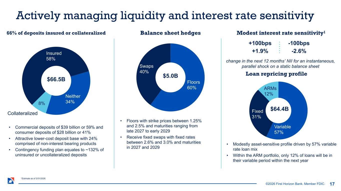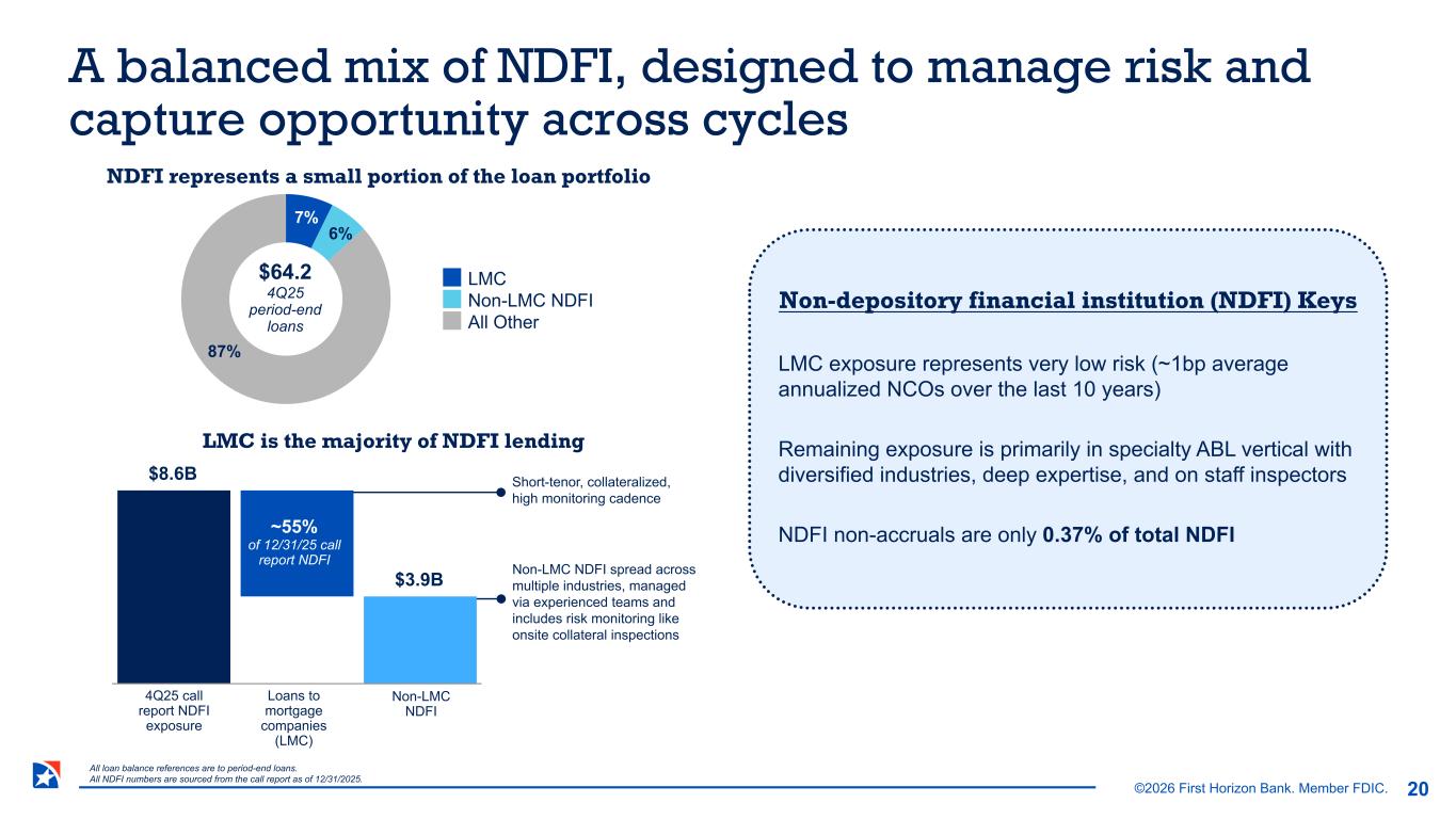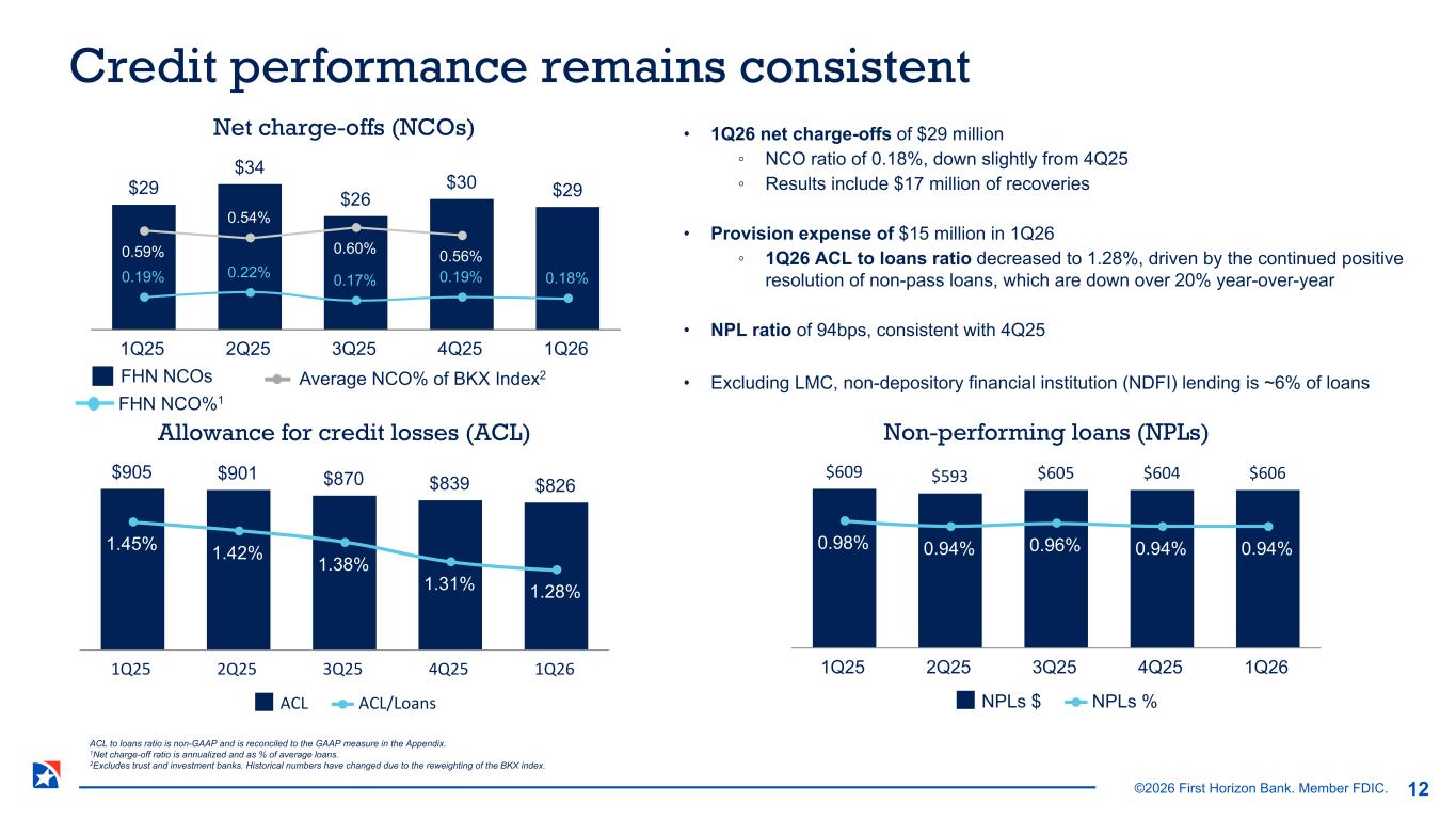 ©2026 First Horizon Bank. Member FDIC. Non-GAAP Information Certain measures included in this document are “non-GAAP,” meaning they are not presented in accordance with generally accepted accounting principles in the U.S. and also are not codified in U.S. banking regulations currently applicable to FHN. Although other entities may use calculation methods that differ from those used by FHN for non-GAAP measures, FHN’s management believes such measures are relevant to understanding the financial condition, capital position, and financial results of FHN and its business segments. Non-GAAP measures are reported to FHN's management and Board of Directors through various internal reports. The non-GAAP measures presented in this document are listed, and are reconciled to the most comparable GAAP presentation, in the non-GAAP reconciliation table(s) appearing in the Appendix. In addition, presentation of regulatory measures, even those which are not GAAP, provides a meaningful basis for comparability to other financial institutions subject to the same regulations as FHN, as demonstrated by their use by banking regulators in reviewing capital adequacy of financial institutions. Although not GAAP terms, these regulatory measures are not considered “non-GAAP” under U.S. financial reporting rules as long as their presentation conforms to regulatory standards. Regulatory measures used in this document include: common equity tier 1 capital, generally defined as common equity less goodwill, other intangibles, and certain other required regulatory deductions; tier 1 capital, generally defined as the sum of core capital (including common equity and instruments that cannot be redeemed at the option of the holder) adjusted for certain items under risk-based capital regulations; and risk-weighted assets, which is a measure of total on- and off-balance sheet assets adjusted for credit and market risk, used to determine regulatory capital ratios.This document also includes forward-looking guidance with respect to certain non-GAAP financial measures. FHN is not able to reconcile these forward-looking non-GAAP measures to their most directly comparable GAAP measures without unreasonable efforts because sufficient information is not available to determine and quantify, or to estimate the probable significance of, all of the variables and adjustments that would be needed for such reconciliations. Forward-Looking Statements This document contains forward-looking statements within the meaning of the Private Securities Litigation Reform Act of 1995, Section 27A of the Securities Act of 1933, as amended, and Section 21E of the Securities Exchange Act of 1934, as amended, with respect to FHN's beliefs, plans, goals, expectations, and estimates. Forward-looking statements are not a representation of historical information, but instead pertain to future operations, strategies, financial results, or other developments. Forward-looking statements often use words such as “believe,” “expect,” “anticipate,” “intend,” “estimate,” “should,” “is likely,” “will,” “going forward,” and other similar expressions that indicate future events and trends. Forward-looking statements are necessarily based upon estimates and assumptions that are inherently subject to significant business, operational, economic, and competitive uncertainties and contingencies, many of which are beyond FHN’s control, and many of which, with respect to future business decisions and actions (including acquisitions and divestitures), are subject to change and could cause FHN’s actual future results and outcomes to differ materially from those contemplated or implied by forward-looking statements or historical performance. While there is no assurance that any list of uncertainties and contingencies is complete, examples of factors which could cause actual results to differ from those contemplated by forward-looking statements or historical performance include those mentioned: in this document; in Items 2.02 and 7.01 of FHN’s Current Report on Form 8-K to which this document has been furnished as an exhibit; in the forepart, and in Items 1, 1A, and 7, of FHN’s most recent Annual Report on Form 10-K; and in the forepart, and in Item 1A of Part II, of FHN’s Quarterly Report(s) on Form 10-Q filed after that Annual Report. Any forward-looking statements made by or on behalf of FHN speak only as of the date they are made, and FHN assumes no obligation to update or revise any forward-looking statements that are made in this document or in any other statement, release, report, or filing from time to time. Actual results could differ and expectations could change, possibly materially, because of one or more factors, including those factors listed in this document or the documents mentioned above, and other factors not listed. Throughout this document numbers may not total due to rounding, references to EPS are fully diluted, and capital ratios for the most recent quarter are estimates. Disclaimers 2