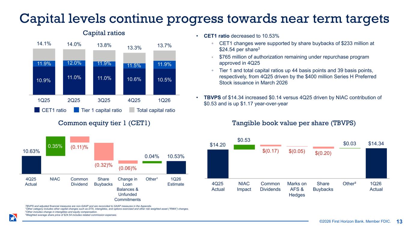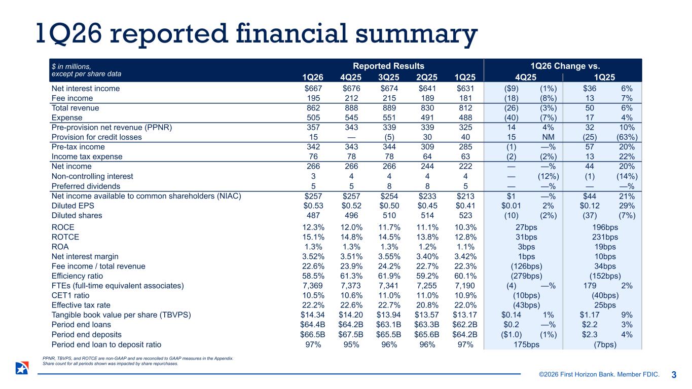 ©2026 First Horizon Bank. Member FDIC. PPNR, TBVPS, and ROTCE are non-GAAP and are reconciled to GAAP measures in the Appendix. Share count for all periods shown was impacted by share repurchases. $ in millions, except per share data Reported Results 1Q26 Change vs. 1Q26 4Q25 3Q25 2Q25 1Q25 4Q25 1Q25 Net interest income $667 $676 $674 $641 $631 ($9) (1%) $36 6% Fee income 195 212 215 189 181 (18) (8%) 13 7% Total revenue 862 888 889 830 812 (26) (3%) 50 6% Expense 505 545 551 491 488 (40) (7%) 17 4% Pre-provision net revenue (PPNR) 357 343 339 339 325 14 4% 32 10% Provision for credit losses 15 — (5) 30 40 15 NM (25) (63%) Pre-tax income 342 343 344 309 285 (1) —% 57 20% Income tax expense 76 78 78 64 63 (2) (2%) 13 22% Net income 266 266 266 244 222 — —% 44 20% Non-controlling interest 3 4 4 4 4 — (12%) (1) (14%) Preferred dividends 5 5 8 8 5 — —% — —% Net income available to common shareholders (NIAC) $257 $257 $254 $233 $213 $1 —% $44 21% Diluted EPS $0.53 $0.52 $0.50 $0.45 $0.41 $0.01 2% $0.12 29% Diluted shares 487 496 510 514 523 (10) (2%) (37) (7%) ROCE 12.3% 12.0% 11.7% 11.1% 10.3% 27bps 196bps ROTCE 15.1% 14.8% 14.5% 13.8% 12.8% 31bps 231bps ROA 1.3% 1.3% 1.3% 1.2% 1.1% 3bps 19bps Net interest margin 3.52% 3.51% 3.55% 3.40% 3.42% 1bps 10bps Fee income / total revenue 22.6% 23.9% 24.2% 22.7% 22.3% (126bps) 34bps Efficiency ratio 58.5% 61.3% 61.9% 59.2% 60.1% (279bps) (152bps) FTEs (full-time equivalent associates) 7,369 7,373 7,341 7,255 7,190 (4) —% 179 2% CET1 ratio 10.5% 10.6% 11.0% 11.0% 10.9% (10bps) (40bps) Effective tax rate 22.2% 22.6% 22.7% 20.8% 22.0% (43bps) 25bps Tangible book value per share (TBVPS) $14.34 $14.20 $13.94 $13.57 $13.17 $0.14 1% $1.17 9% Period end loans $64.4B $64.2B $63.1B $63.3B $62.2B $0.2 —% $2.2 3% Period end deposits $66.5B $67.5B $65.5B $65.6B $64.2B ($1.0) (1%) $2.3 4% Period end loan to deposit ratio 97% 95% 96% 96% 97% 175bps (7bps) 1Q26 reported financial summary 3