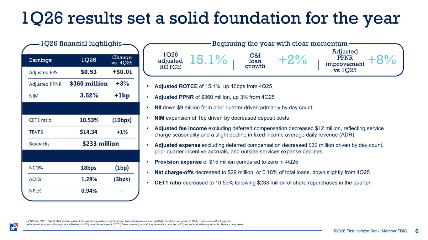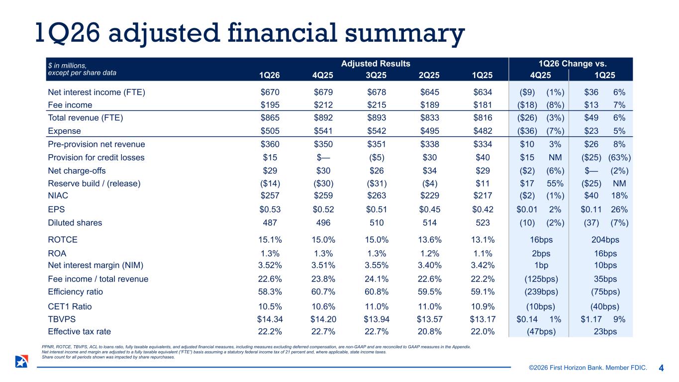 ©2026 First Horizon Bank. Member FDIC. $ in millions, except per share data Adjusted Results 1Q26 Change vs. 1Q26 4Q25 3Q25 2Q25 1Q25 4Q25 1Q25 Net interest income (FTE) $670 $679 $678 $645 $634 ($9) (1%) $36 6% Fee income $195 $212 $215 $189 $181 ($18) (8%) $13 7% Total revenue (FTE) $865 $892 $893 $833 $816 ($26) (3%) $49 6% Expense $505 $541 $542 $495 $482 ($36) (7%) $23 5% Pre-provision net revenue $360 $350 $351 $338 $334 $10 3% $26 8% Provision for credit losses $15 $— ($5) $30 $40 $15 NM ($25) (63%) Net charge-offs $29 $30 $26 $34 $29 ($2) (6%) $— (2%) Reserve build / (release) ($14) ($30) ($31) ($4) $11 $17 55% ($25) NM NIAC $257 $259 $263 $229 $217 ($2) (1%) $40 18% EPS $0.53 $0.52 $0.51 $0.45 $0.42 $0.01 2% $0.11 26% Diluted shares 487 496 510 514 523 (10) (2%) (37) (7%) ROTCE 15.1% 15.0% 15.0% 13.6% 13.1% 16bps 204bps ROA 1.3% 1.3% 1.3% 1.2% 1.1% 2bps 16bps Net interest margin (NIM) 3.52% 3.51% 3.55% 3.40% 3.42% 1bp 10bps Fee income / total revenue 22.6% 23.8% 24.1% 22.6% 22.2% (125bps) 35bps Efficiency ratio 58.3% 60.7% 60.8% 59.5% 59.1% (239bps) (75bps) CET1 Ratio 10.5% 10.6% 11.0% 11.0% 10.9% (10bps) (40bps) TBVPS $14.34 $14.20 $13.94 $13.57 $13.17 $0.14 1% $1.17 9% Effective tax rate 22.2% 22.7% 22.7% 20.8% 22.0% (47bps) 23bps 1Q26 adjusted financial summary PPNR, ROTCE, TBVPS, ACL to loans ratio, fully taxable equivalents, and adjusted financial measures, including measures excluding deferred compensation, are non-GAAP and are reconciled to GAAP measures in the Appendix. Net interest income and margin are adjusted to a fully taxable equivalent (“FTE”) basis assuming a statutory federal income tax of 21 percent and, where applicable, state income taxes. Share count for all periods shown was impacted by share repurchases. 4