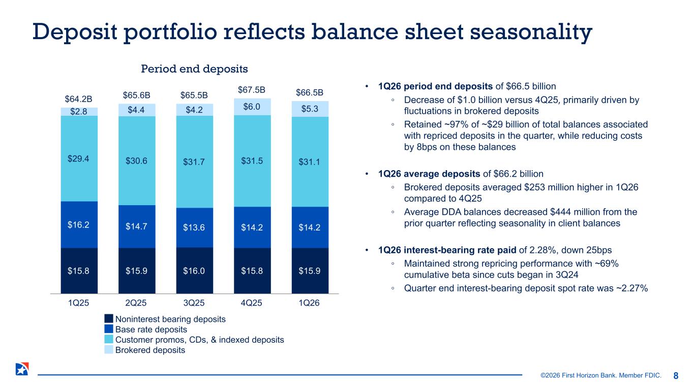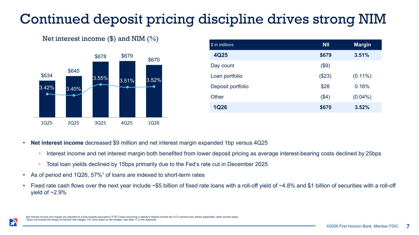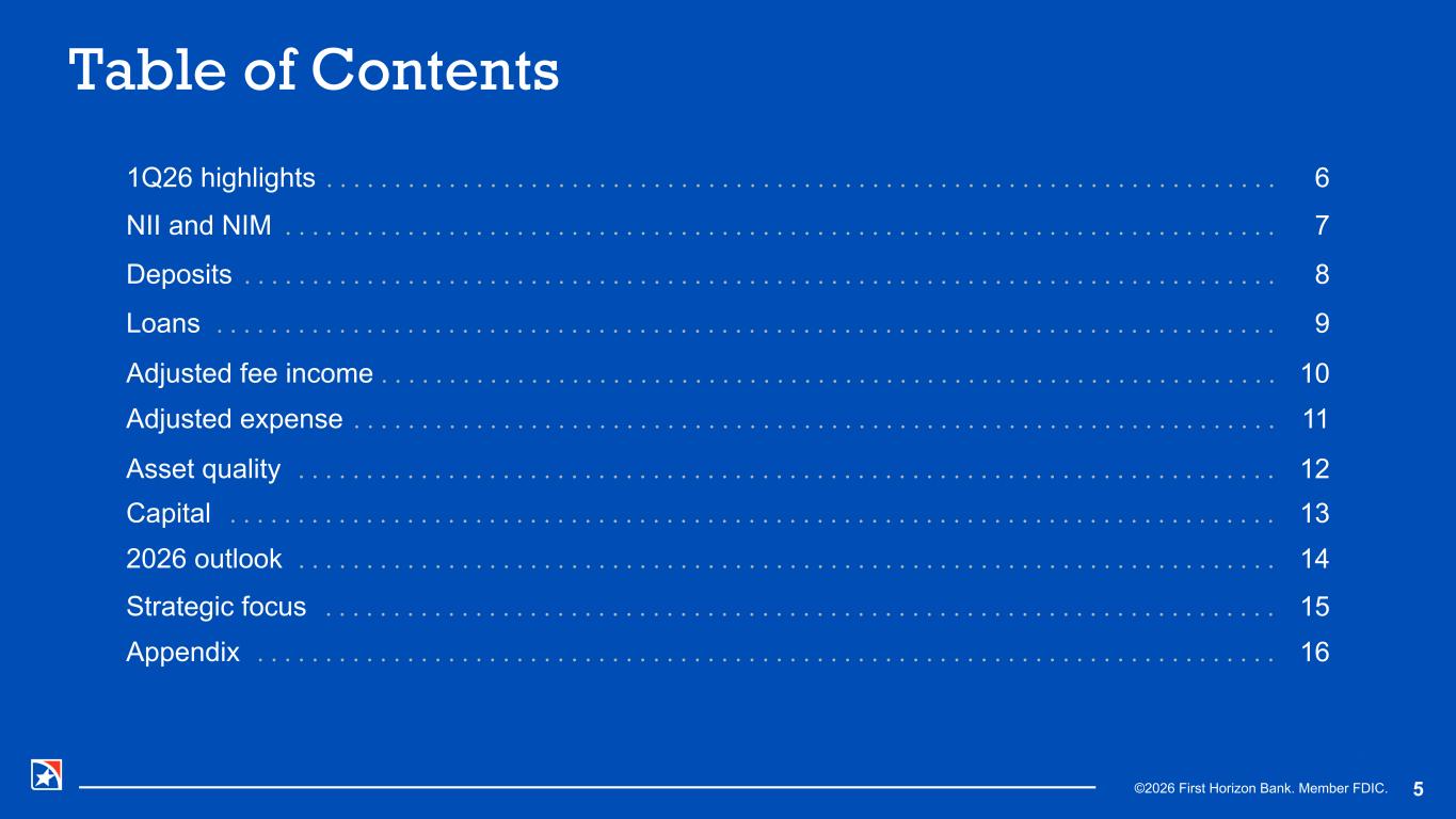 ©2026 First Horizon Bank. Member FDIC. 1Q26 highlights . . . . . . . . . . . . . . . . . . . . . . . . . . . . . . . . . . . . . . . . . . . . . . . . . . . . . . . . . . . . . . . . . . . . . . 6 NII and NIM . . . . . . . . . . . . . . . . . . . . . . . . . . . . . . . . . . . . . . . . . . . . . . . . . . . . . . . . . . . . . . . . . . . . . . . . . 7 Deposits . . . . . . . . . . . . . . . . . . . . . . . . . . . . . . . . . . . . . . . . . . . . . . . . . . . . . . . . . . . . . . . . . . . . . . . . . . . . 8 Loans . . . . . . . . . . . . . . . . . . . . . . . . . . . . . . . . . . . . . . . . . . . . . . . . . . . . . . . . . . . . . . . . . . . . . . . . . . . . . . 9 Adjusted fee income . . . . . . . . . . . . . . . . . . . . . . . . . . . . . . . . . . . . . . . . . . . . . . . . . . . . . . . . . . . . . . . . . . 10 Adjusted expense . . . . . . . . . . . . . . . . . . . . . . . . . . . . . . . . . . . . . . . . . . . . . . . . . . . . . . . . . . . . . . . . . . . . 11 Asset quality . . . . . . . . . . . . . . . . . . . . . . . . . . . . . . . . . . . . . . . . . . . . . . . . . . . . . . . . . . . . . . . . . . . . . . . . 12 Capital . . . . . . . . . . . . . . . . . . . . . . . . . . . . . . . . . . . . . . . . . . . . . . . . . . . . . . . . . . . . . . . . . . . . . . . . . . . . . 13 2026 outlook . . . . . . . . . . . . . . . . . . . . . . . . . . . . . . . . . . . . . . . . . . . . . . . . . . . . . . . . . . . . . . . . . . . . . . . . 14 Strategic focus . . . . . . . . . . . . . . . . . . . . . . . . . . . . . . . . . . . . . . . . . . . . . . . . . . . . . . . . . . . . . . . . . . . . . . 15 Appendix . . . . . . . . . . . . . . . . . . . . . . . . . . . . . . . . . . . . . . . . . . . . . . . . . . . . . . . . . . . . . . . . . . . . . . . . . . . 16 5 Table of Contents 5